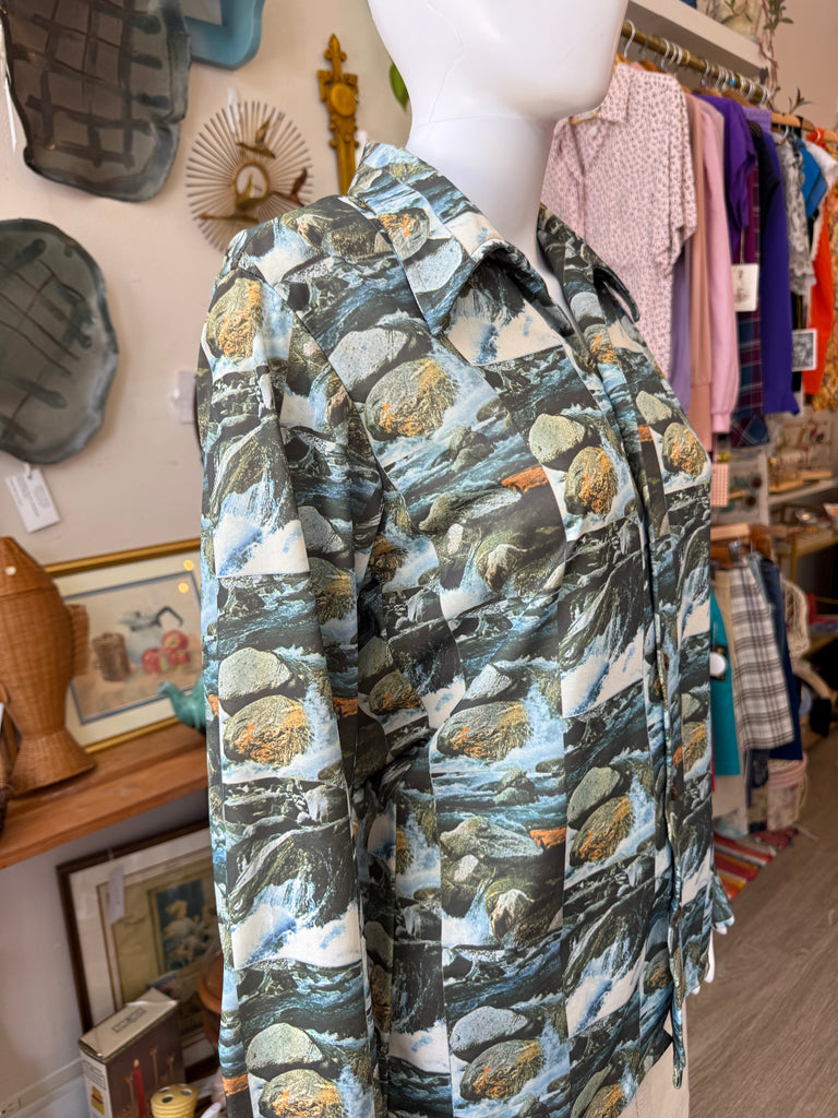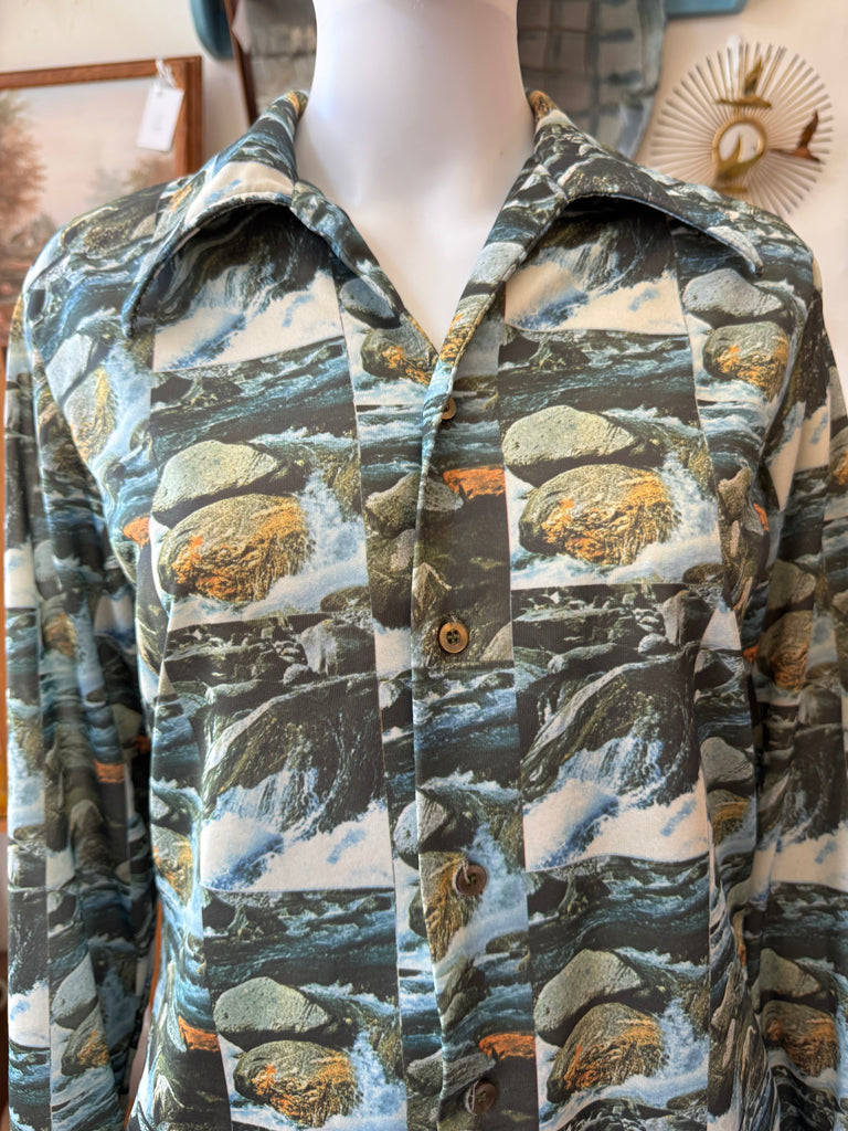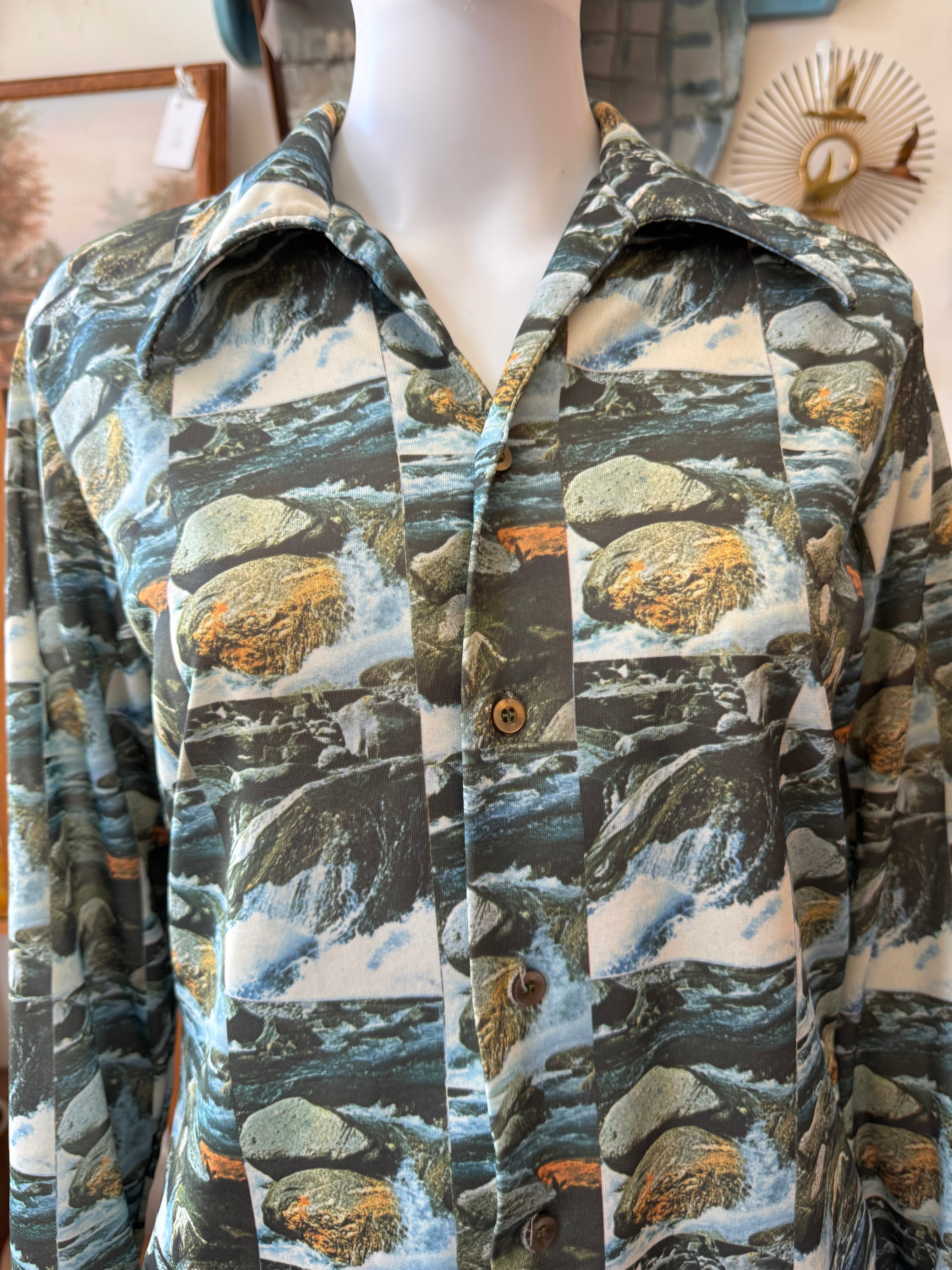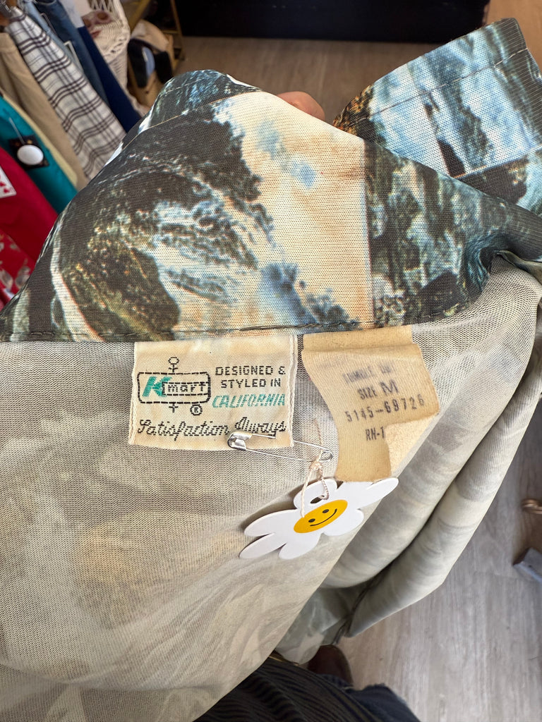 70s vintage Kmart button-front shirt in a striking landscape/river rock scenic print (greens, blues, stone). Classic long point collar, button cuffs, and easy unisex fit. Original paper tag still attached. Some loose threads noted; overall amazing vintage condition and ready to wear.