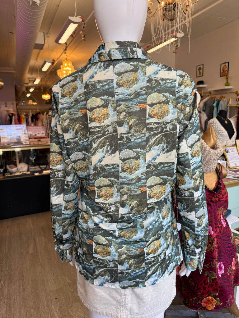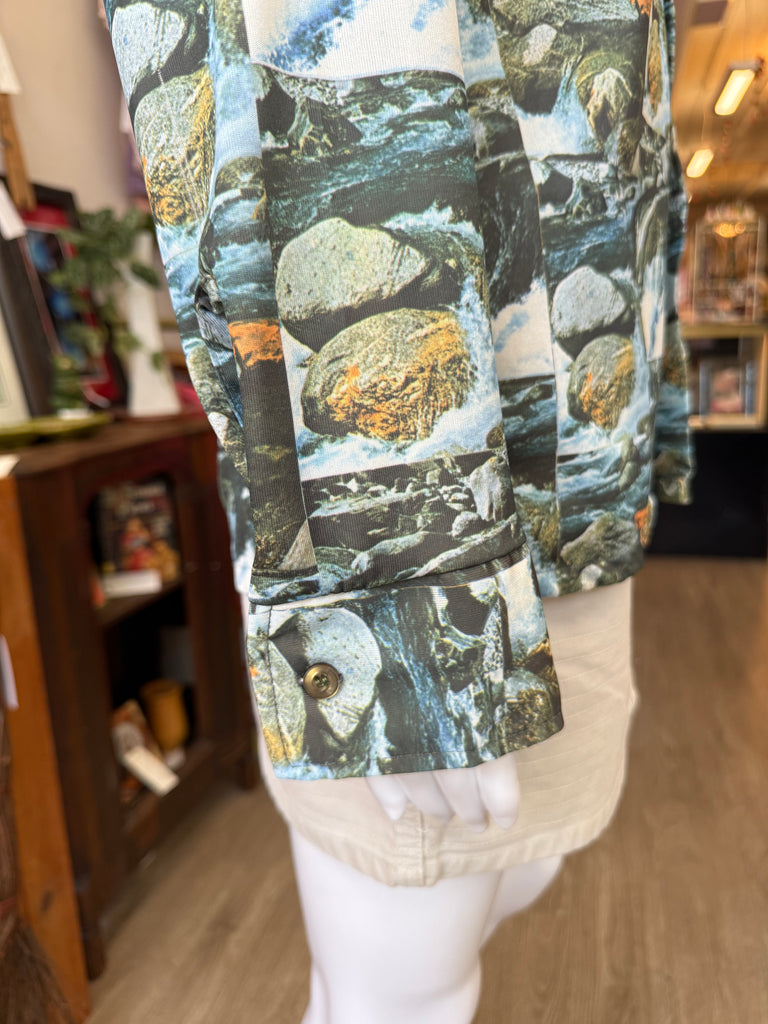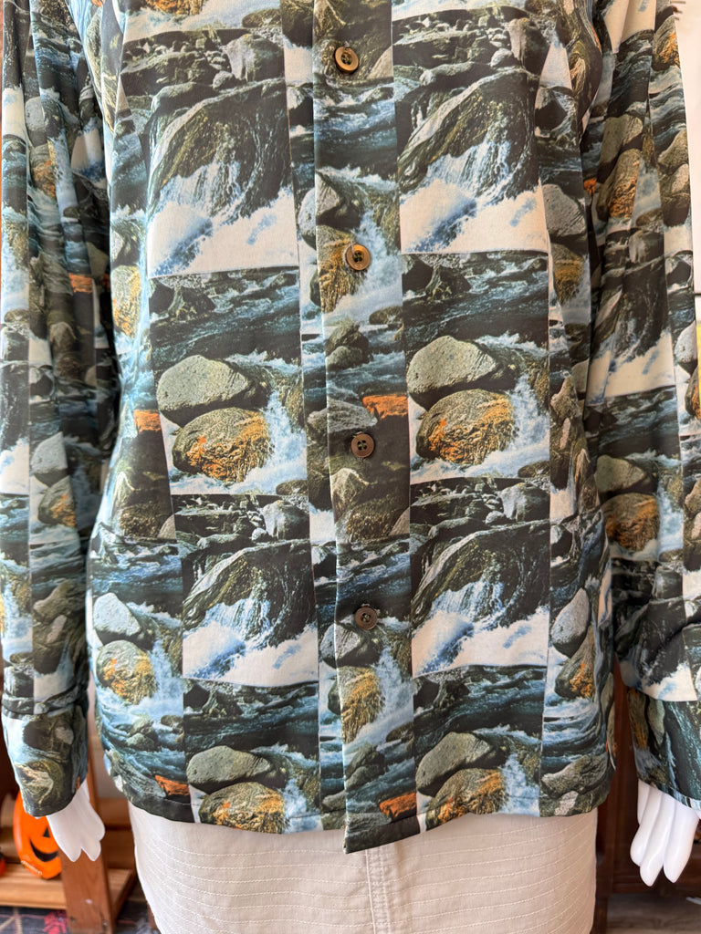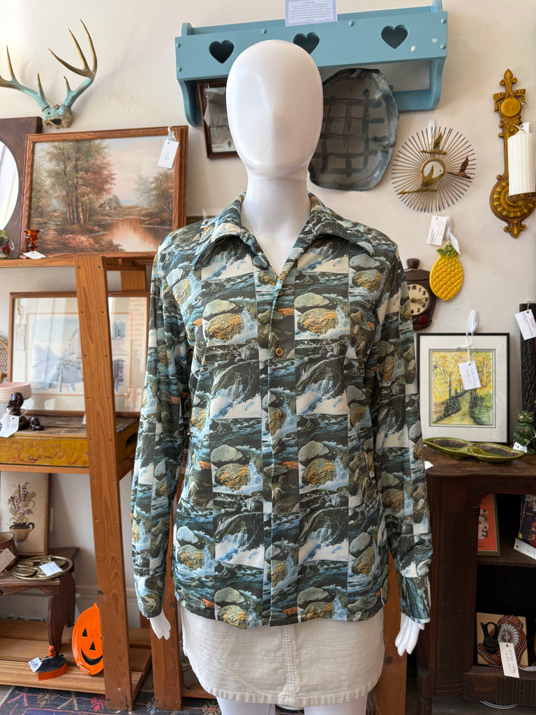 70s vintage Kmart button-front shirt in a striking landscape/river rock scenic print (greens, blues, stone). Classic long point collar, button cuffs, and easy unisex fit. Original paper tag still attached. Some loose threads noted; overall amazing vintage condition and ready to wear.