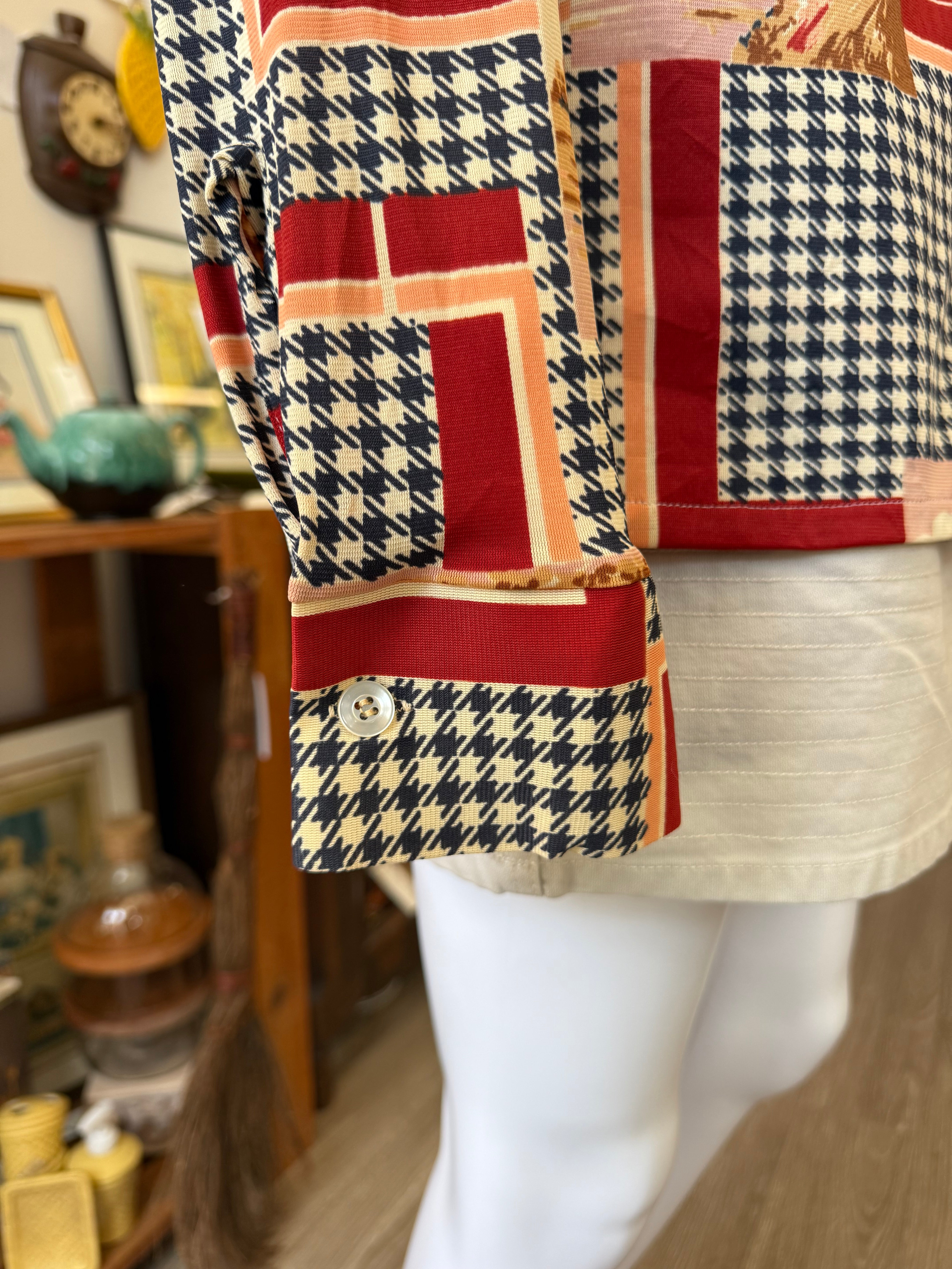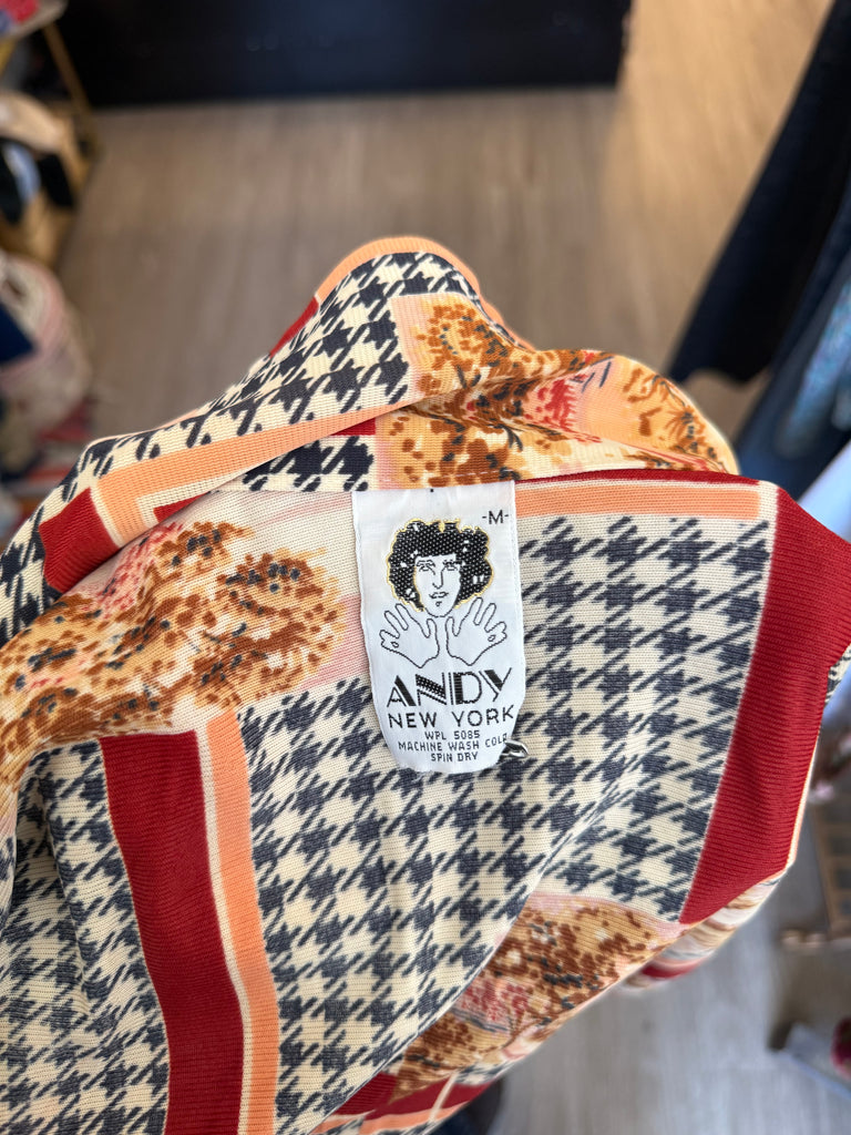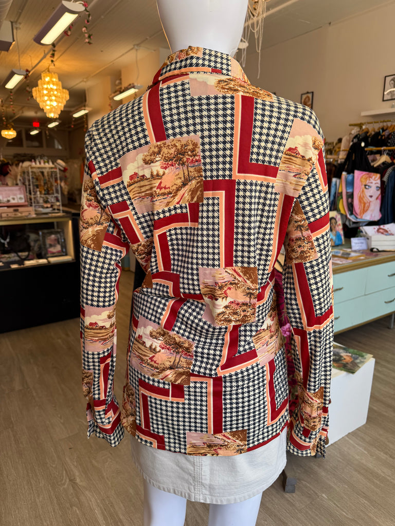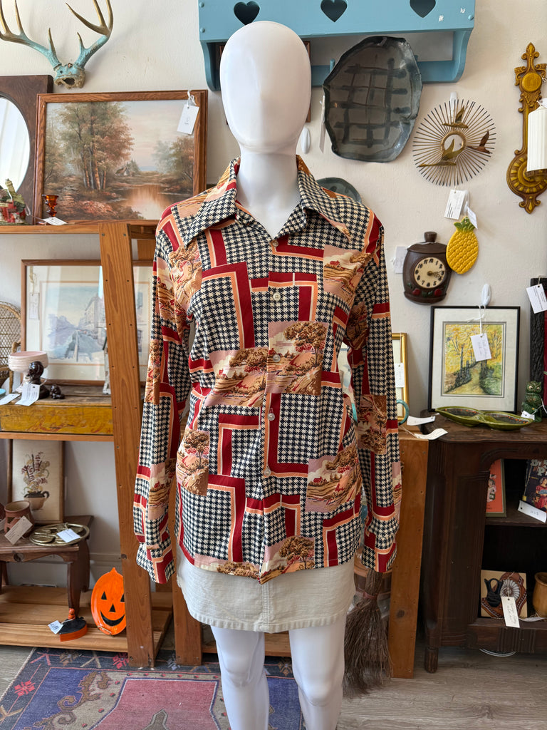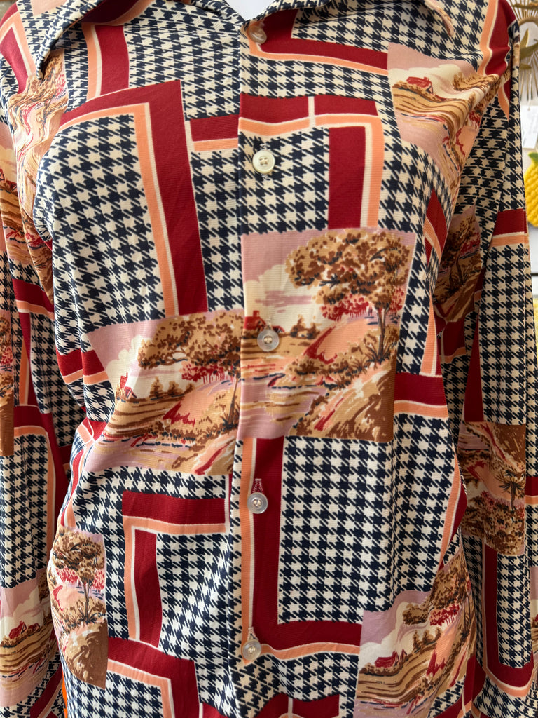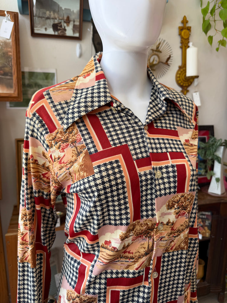 Stunning 1970s long-sleeve button-down by Andy New York featuring a bold patchwork print—houndstooth blocks mixed with scenic panels in warm red, peach, and cream. Classic wide 70s collar, button front and cuffs. Labeled men’s medium; an easy unisex piece that styles tucked, layered, or worn open.
