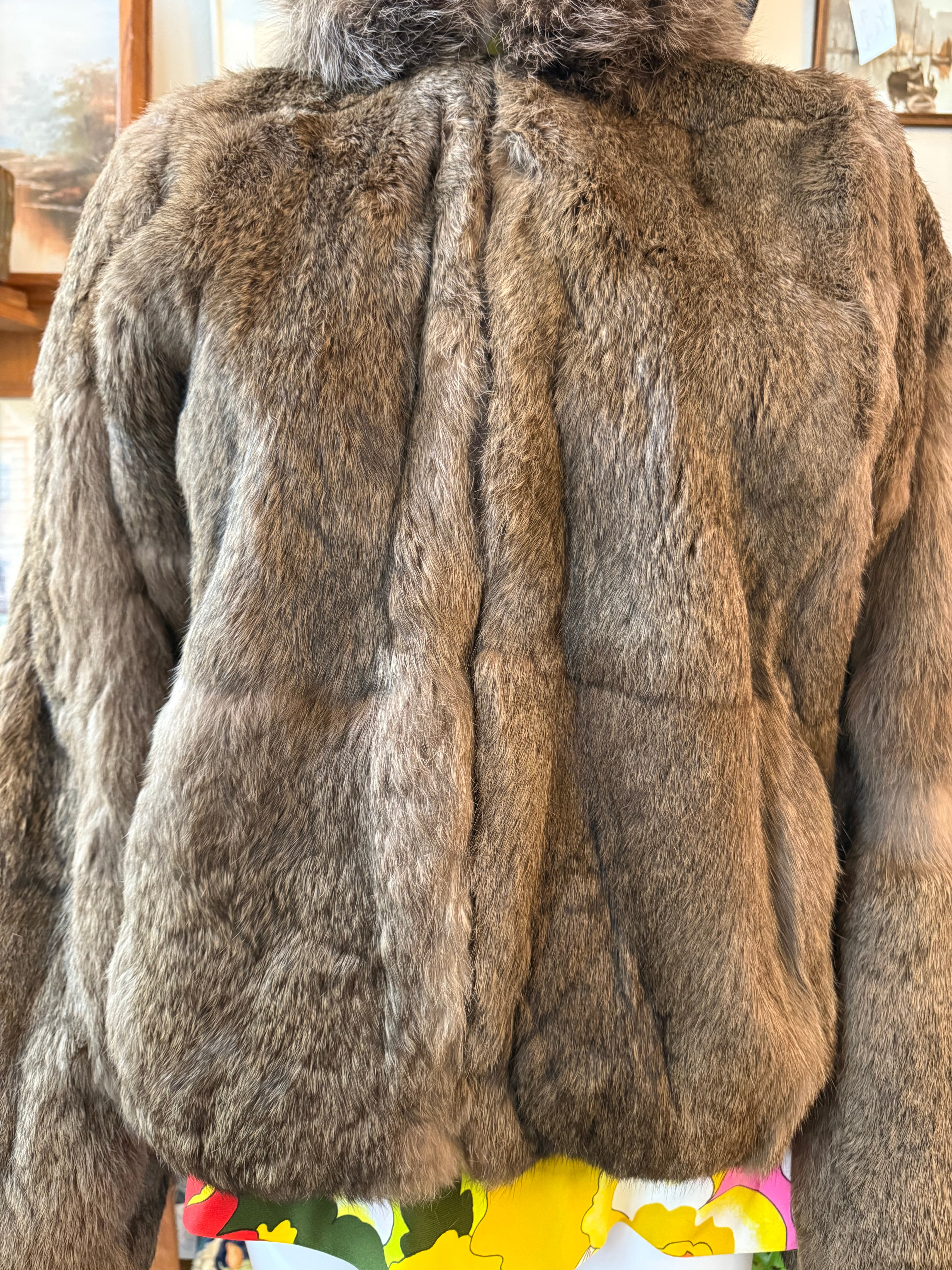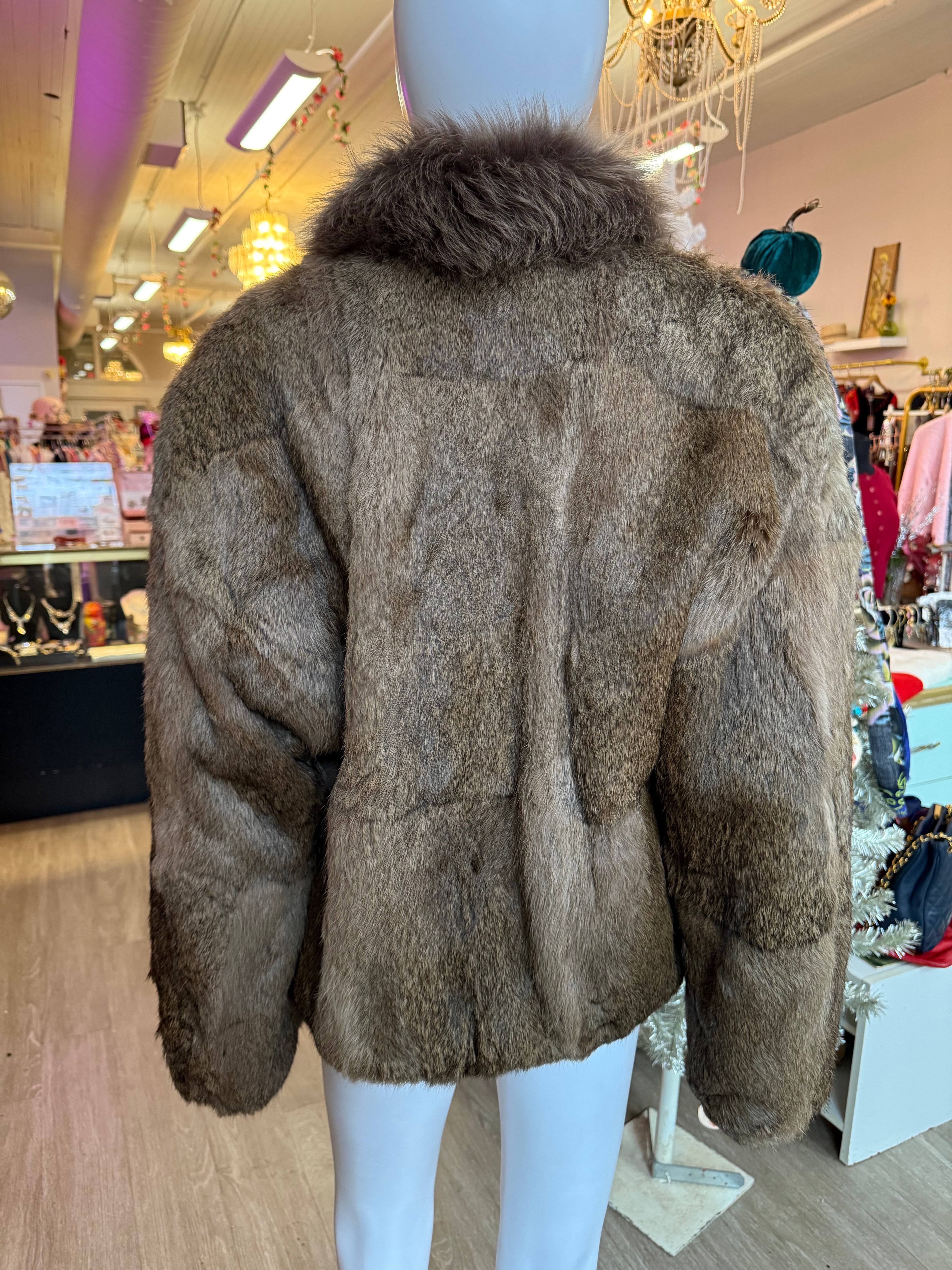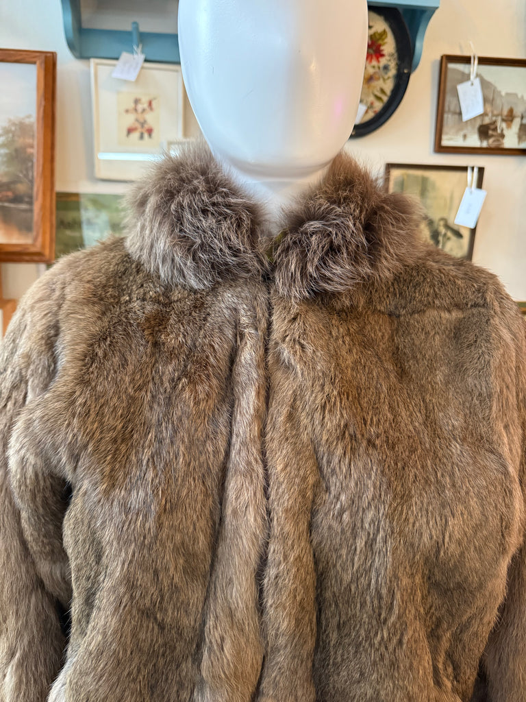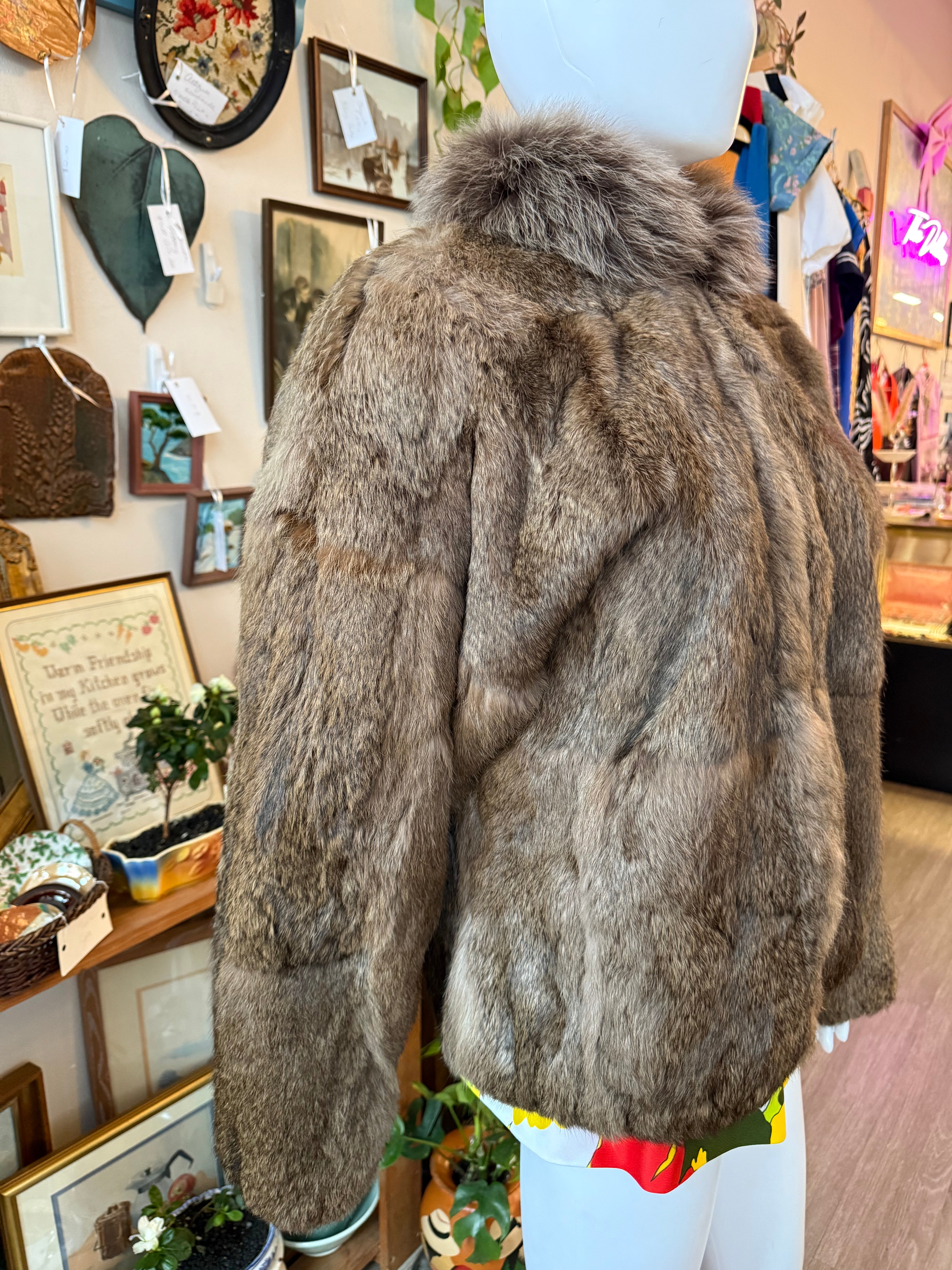 Plush 1970s faux fur coat in a warm chestnut brown tone with a soft, realistic texture. Features a cozy high-pile fur collar, front zipper closure, and full acetate lining for comfort and structure. Unbranded, made in Korea - beautifully crafted with the luxe feel of genuine fur but cruelty-free.