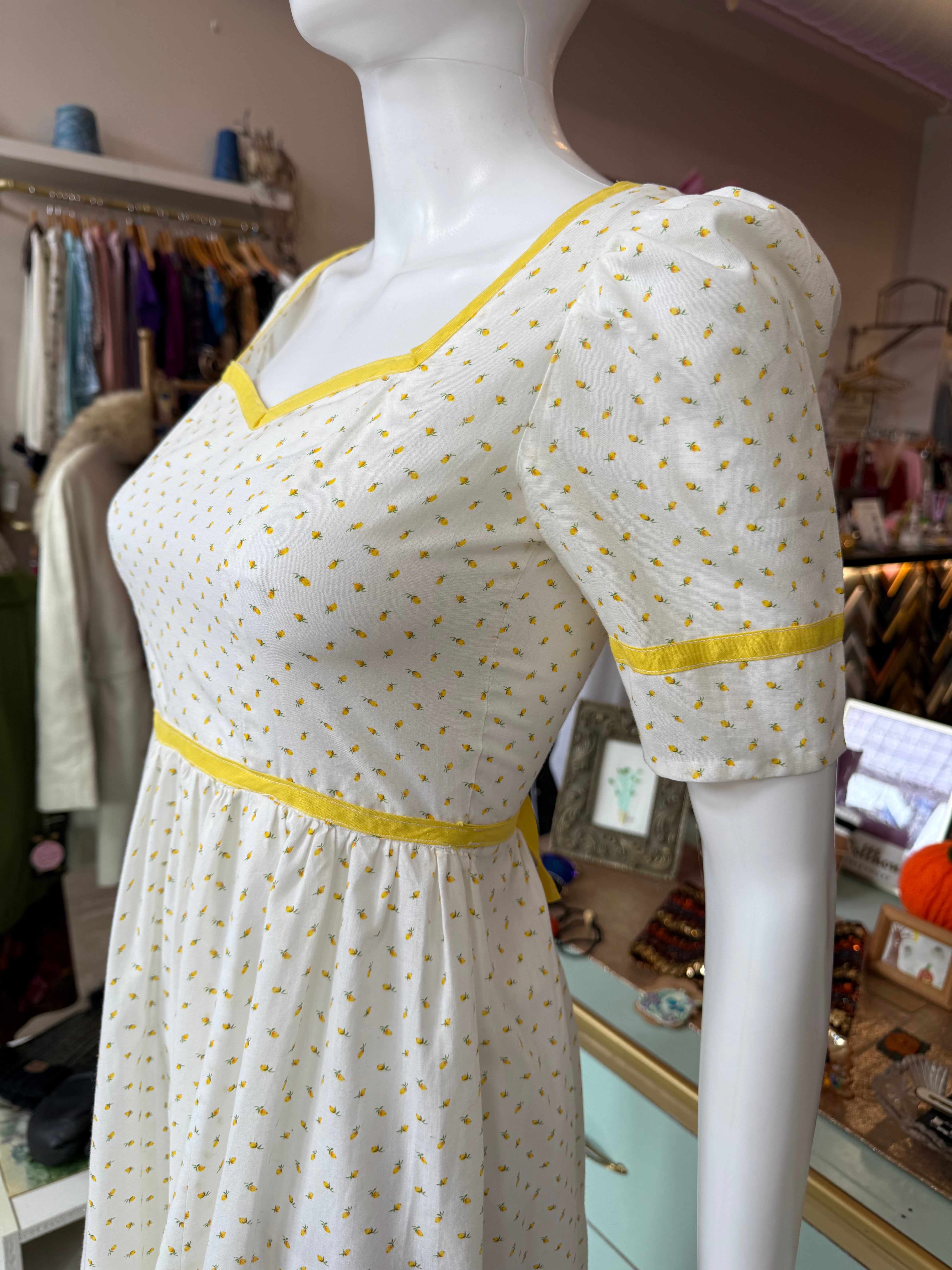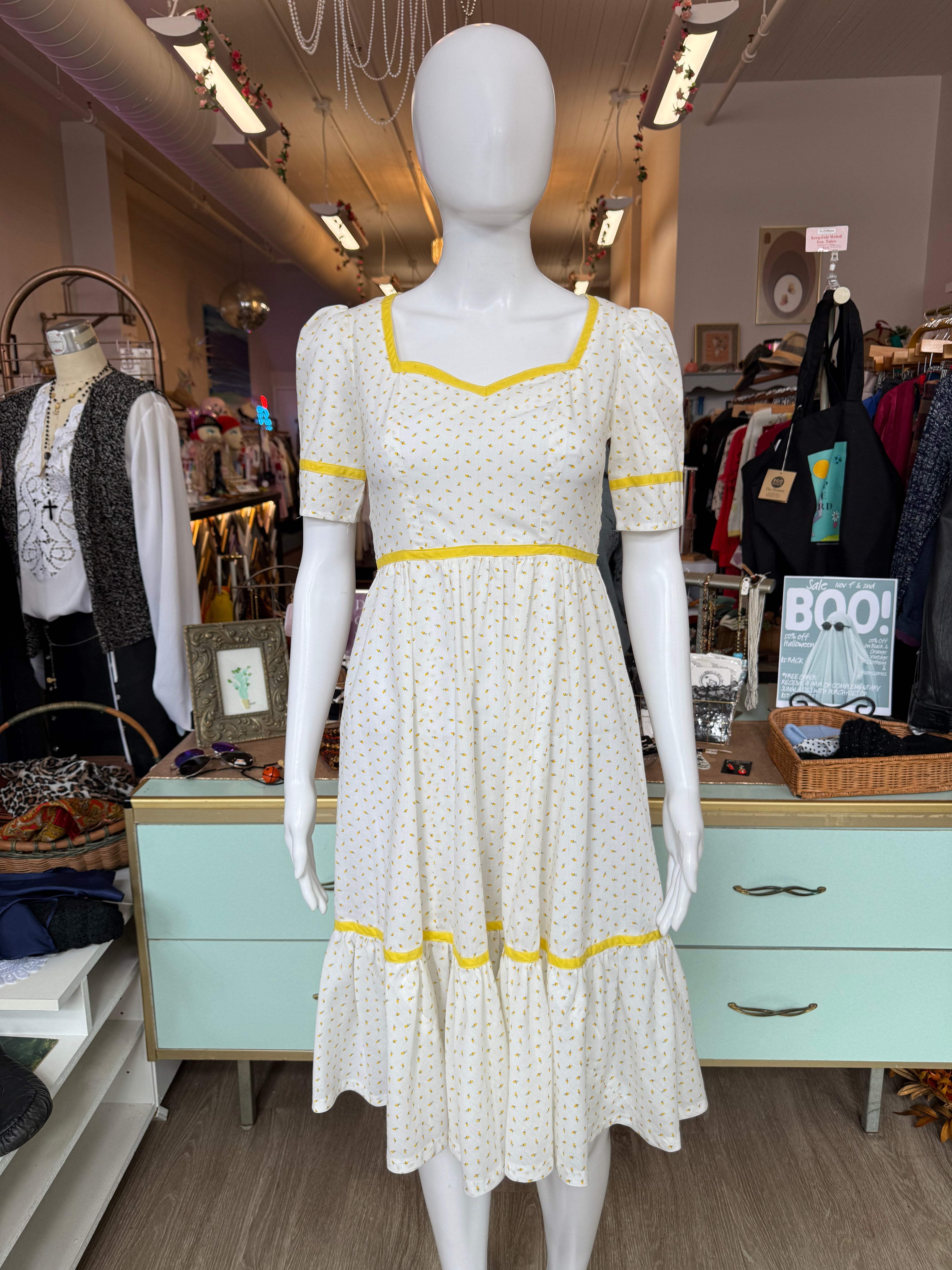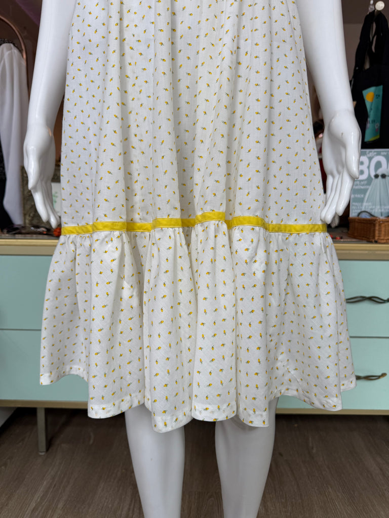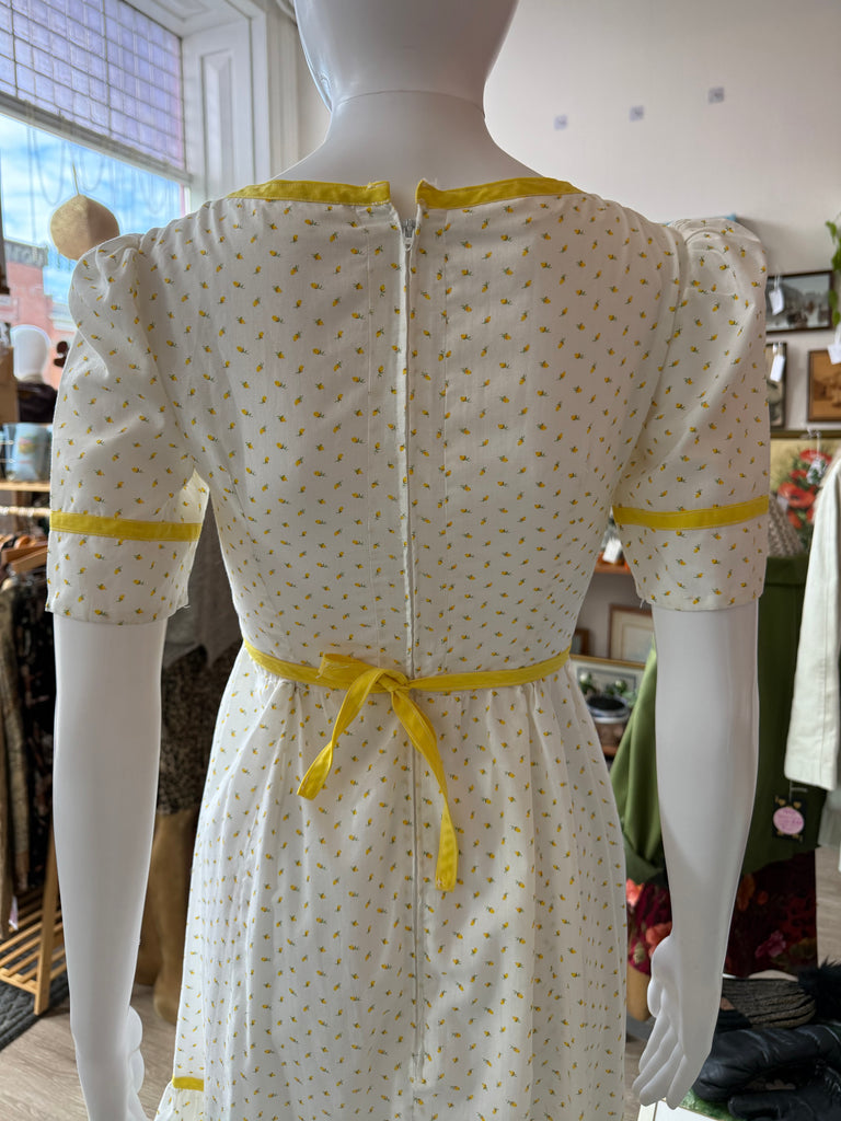The sweetest vintage 1970s handmade prairie / cottagecore dress in white cotton with tiny pale yellow floral print and matching yellow trim. Features a sweetheart neckline, short puff sleeves, and a ruffled hem for that perfect cottagecore silhouette. Finished with a back zipper and waist tie for an adjustable fit.