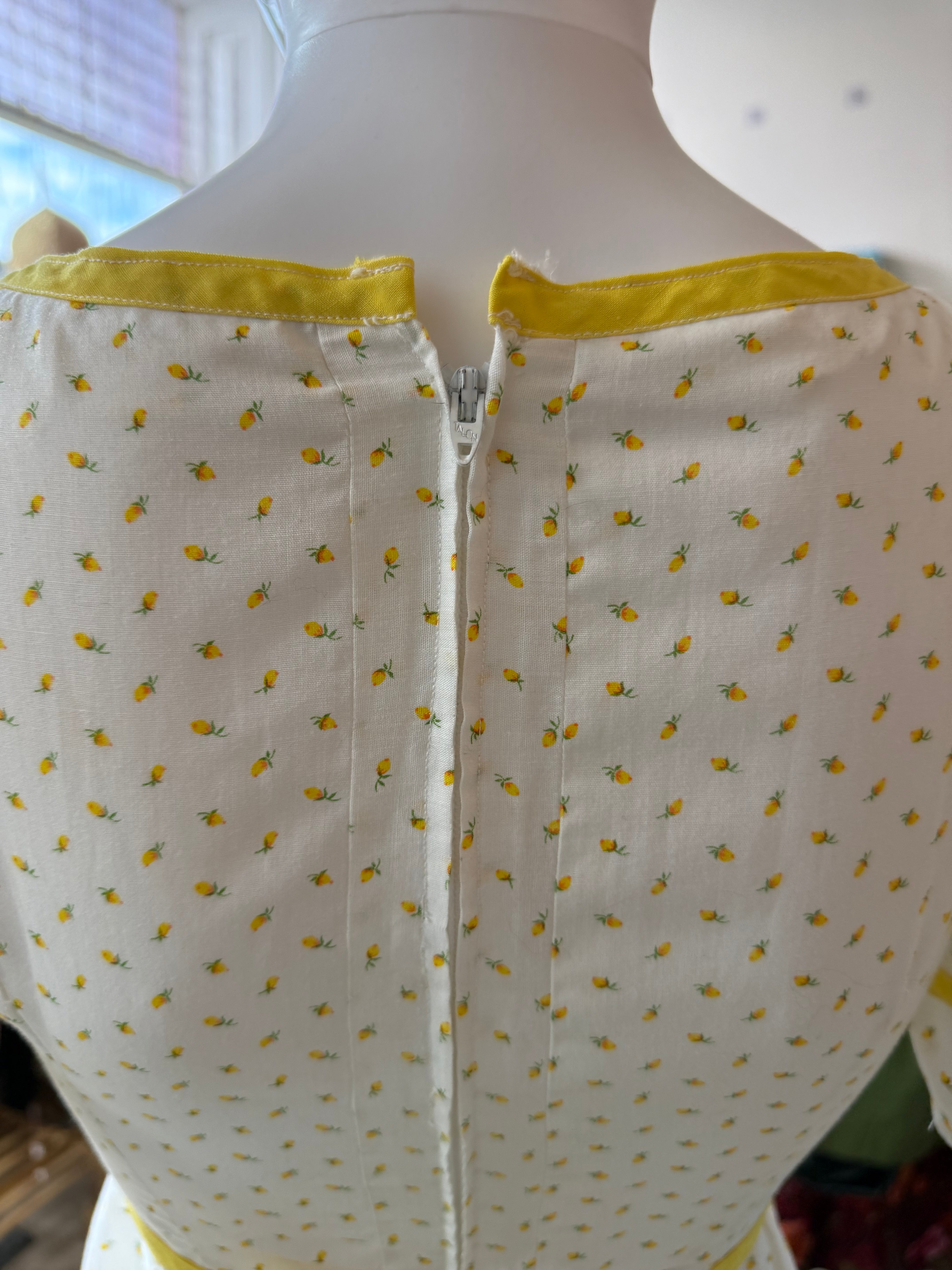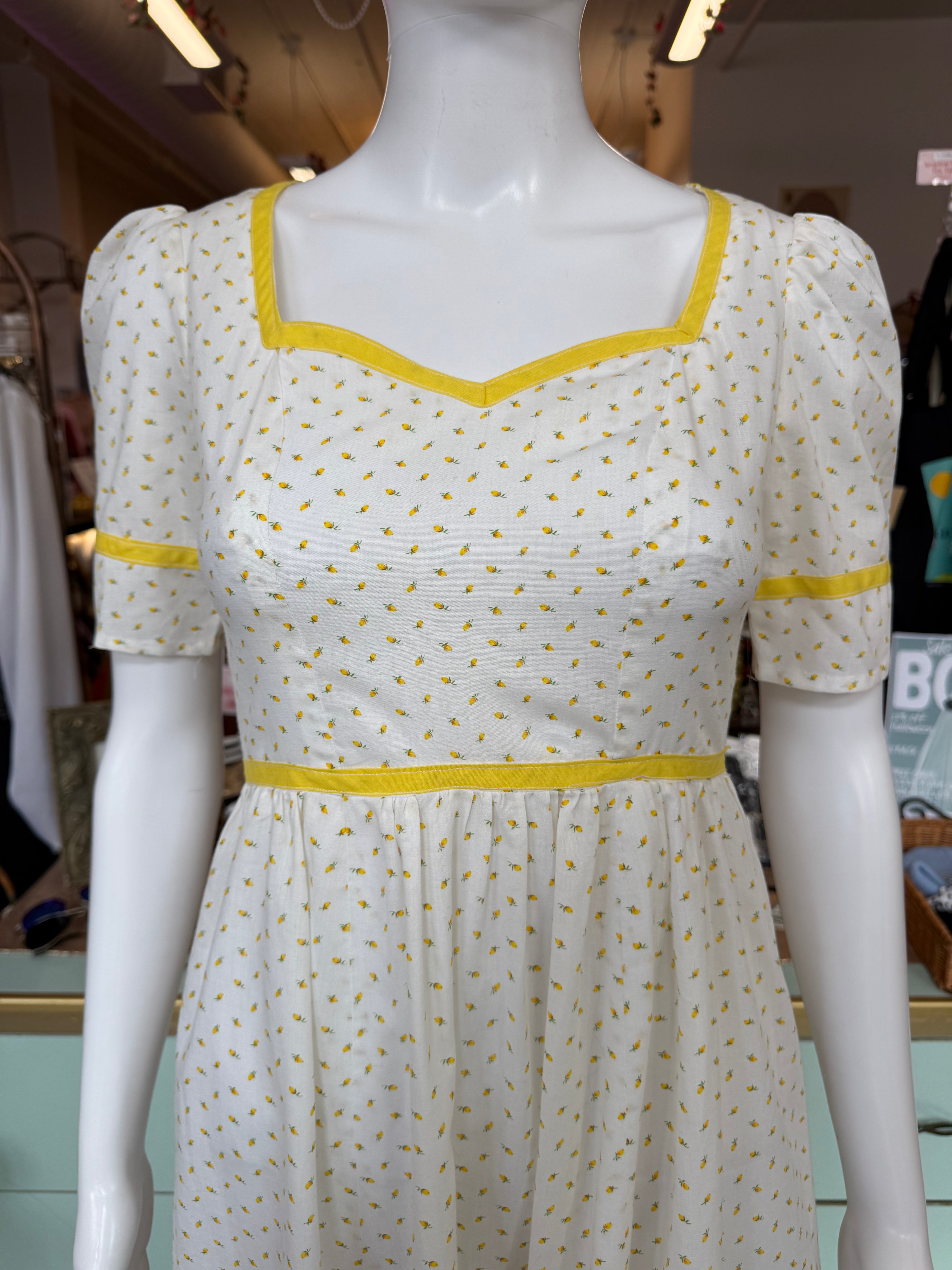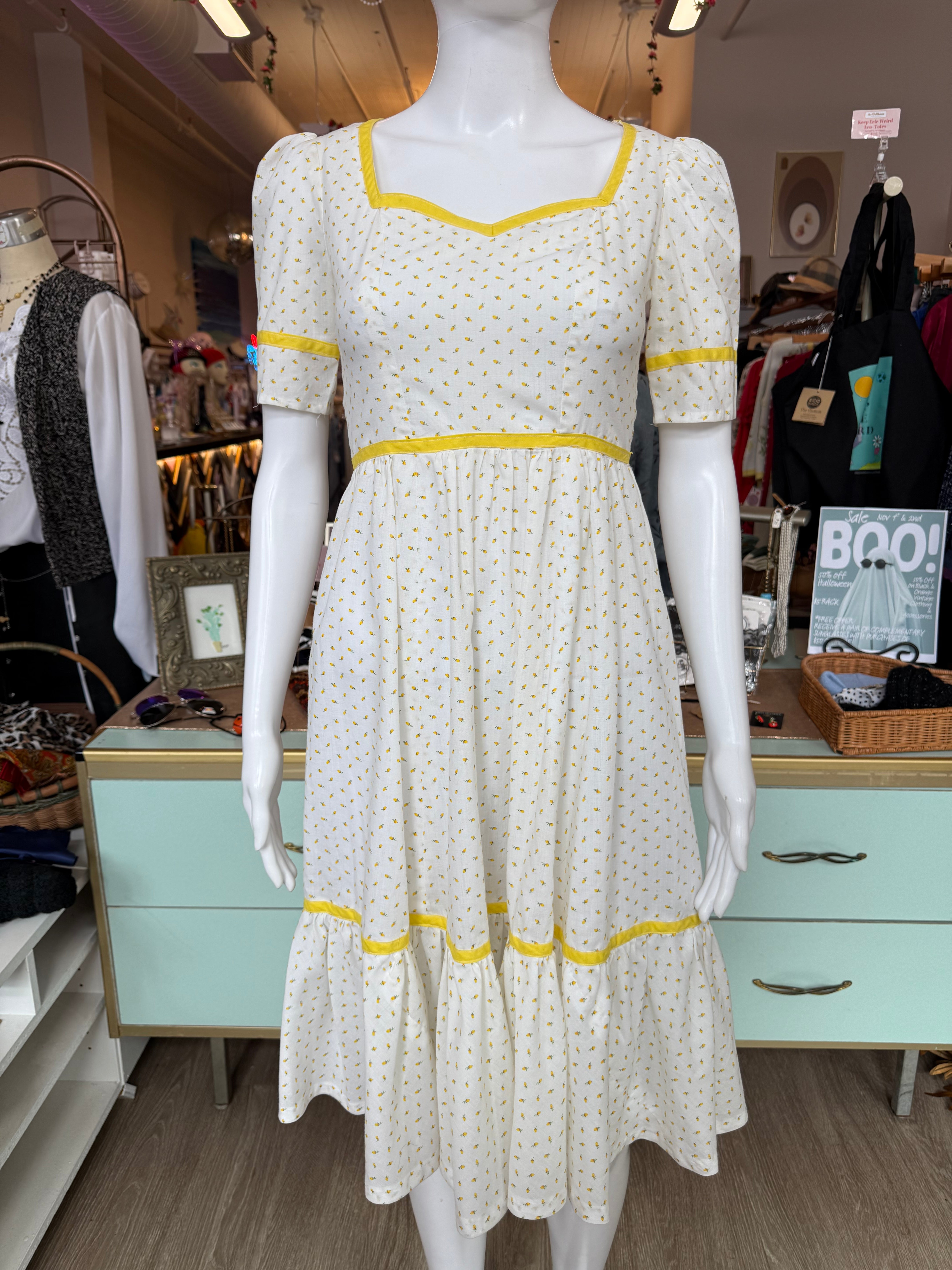 The sweetest vintage 1970s handmade prairie / cottagecore dress in white cotton with tiny pale yellow floral print and matching yellow trim. Features a sweetheart neckline, short puff sleeves, and a ruffled hem for that perfect cottagecore silhouette. Finished with a back zipper and waist tie for an adjustable fit.