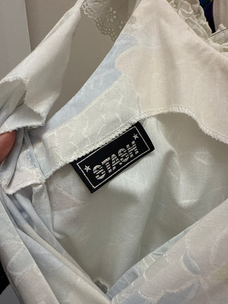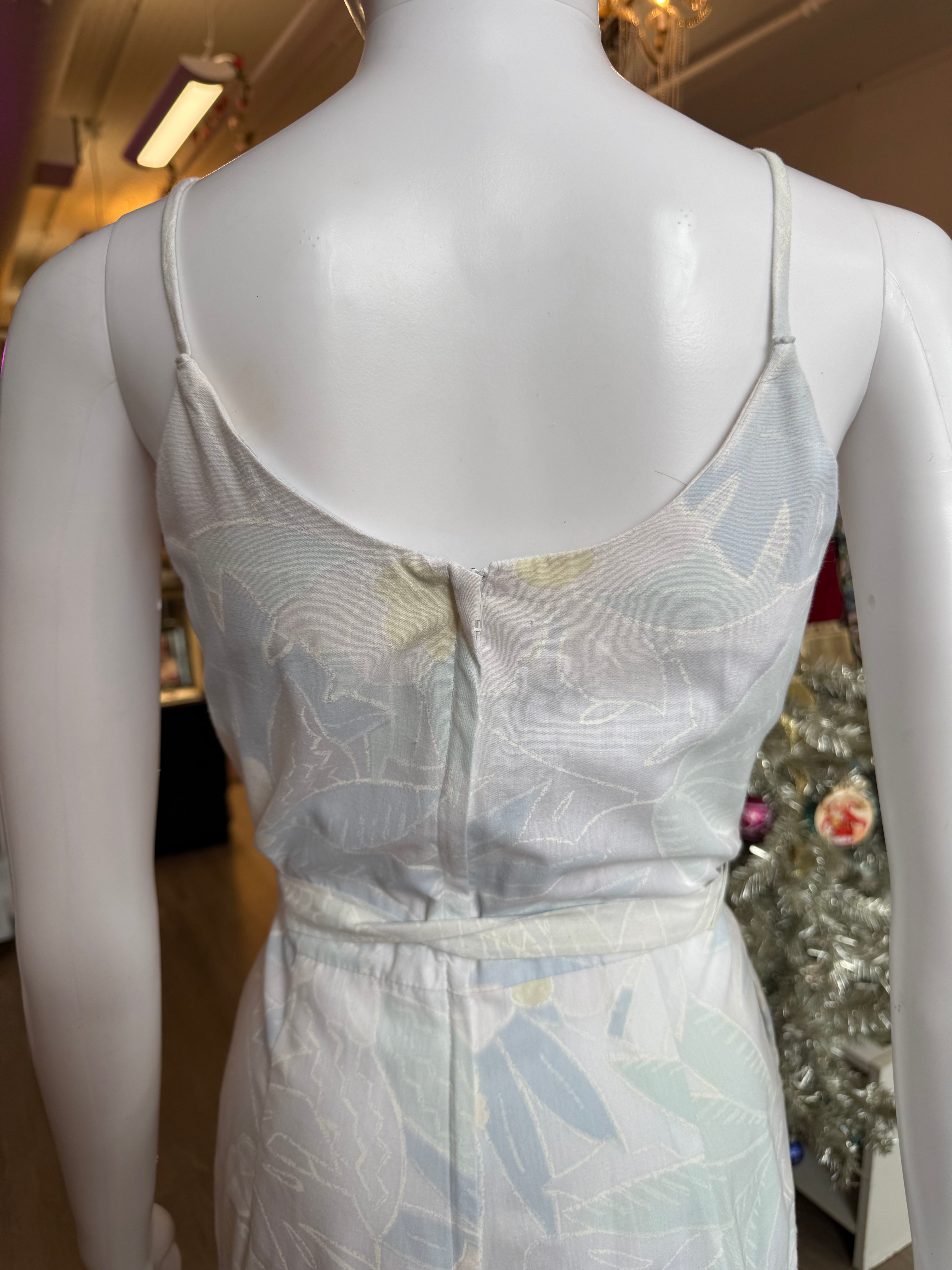 Soft, dreamy, and so classically ’70s. This Stash jumpsuit comes in a pale blue and yellow watercolor floral print with a faux wrap bodice, spaghetti straps, and a matching waist tie that cinches things in just right. Lightweight fabric, giving it that effortlessly floaty vintage feel. Back zipper closure.