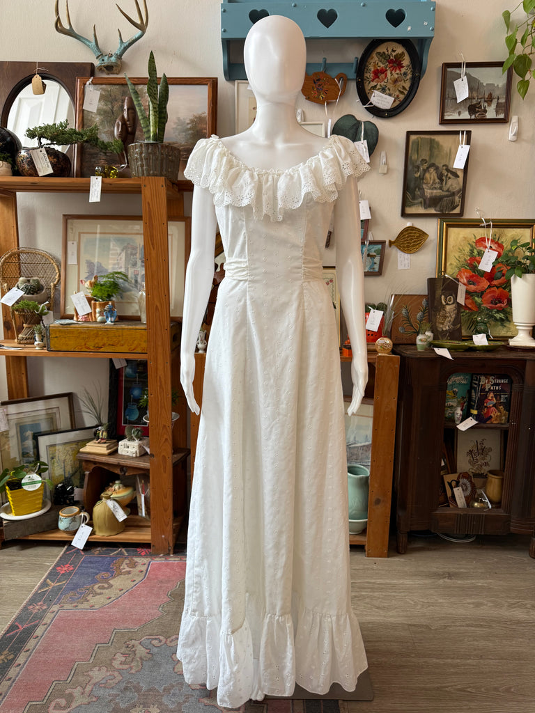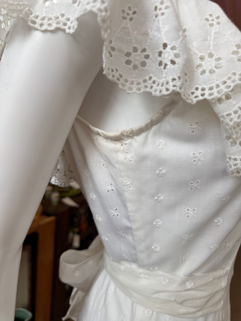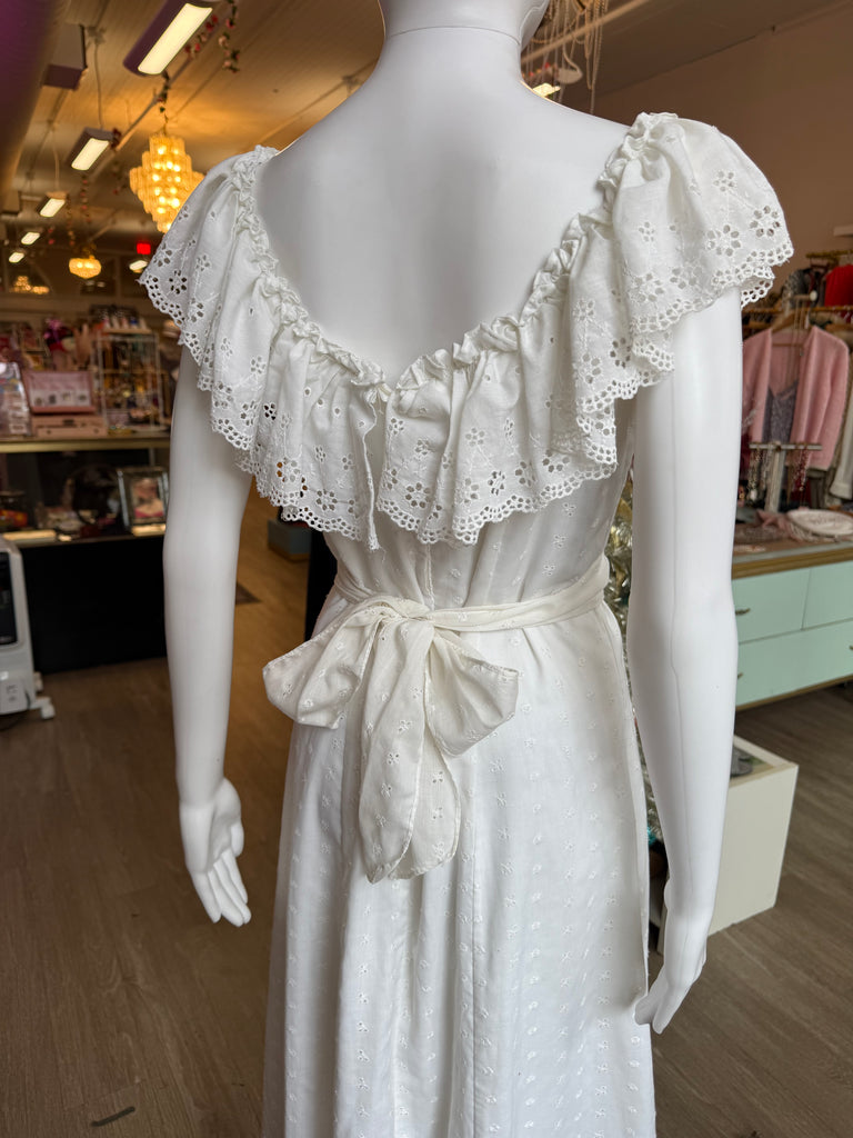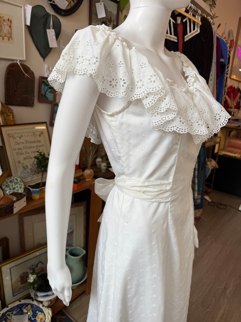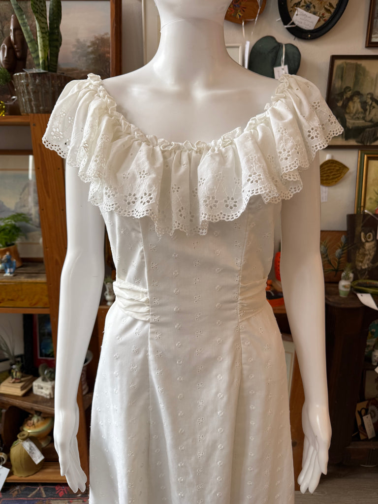 Romantic 1970s prairie maxi dress in soft white eyelet floral with the sweetest ruffled neckline. Features an off-the-shoulder style flounce trimmed in delicate eyelet lace, a fitted bodice, and a long flowing skirt with a subtle ruffled hem. Comes with its original matching tie belt for shaping the waist. Back zipper closure. Unbranded.
