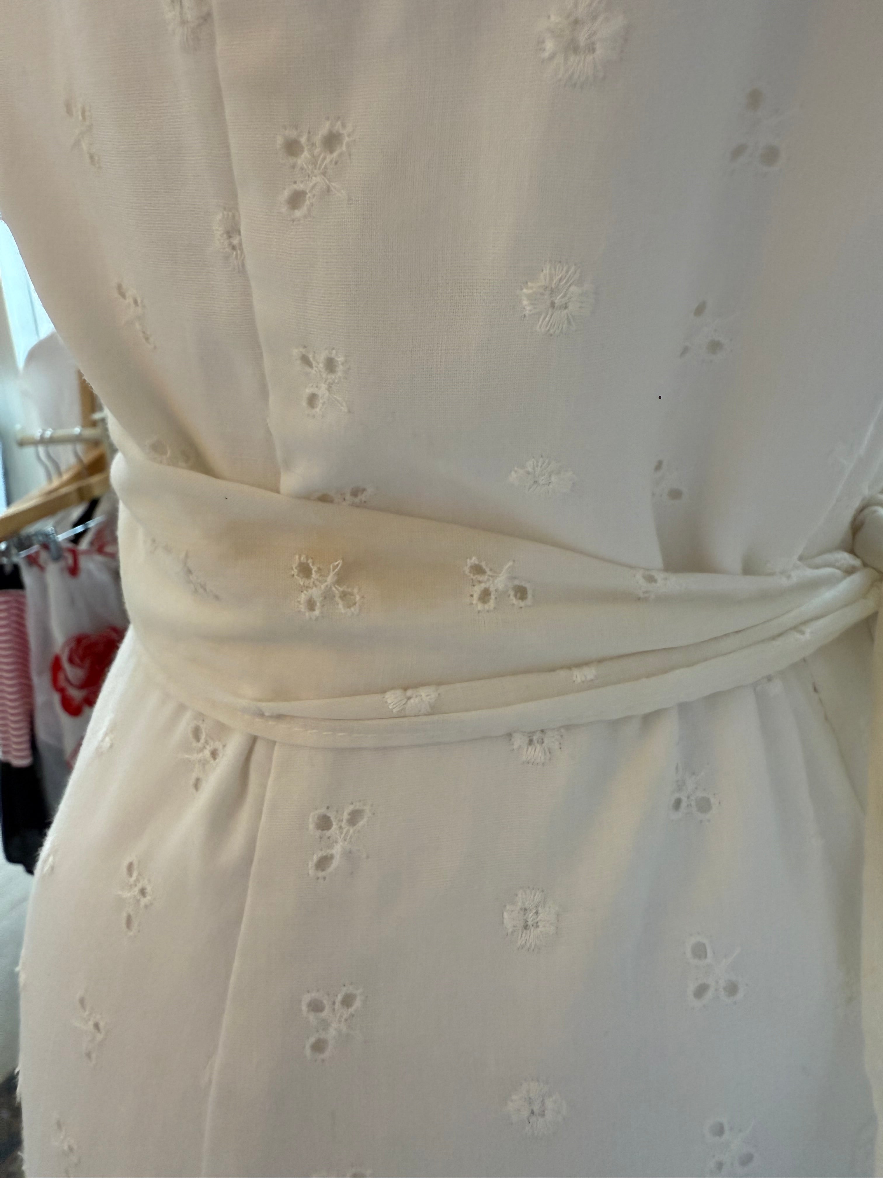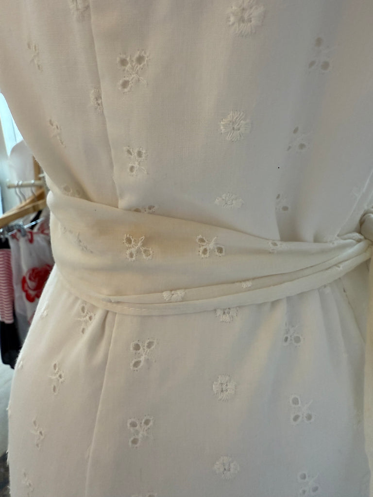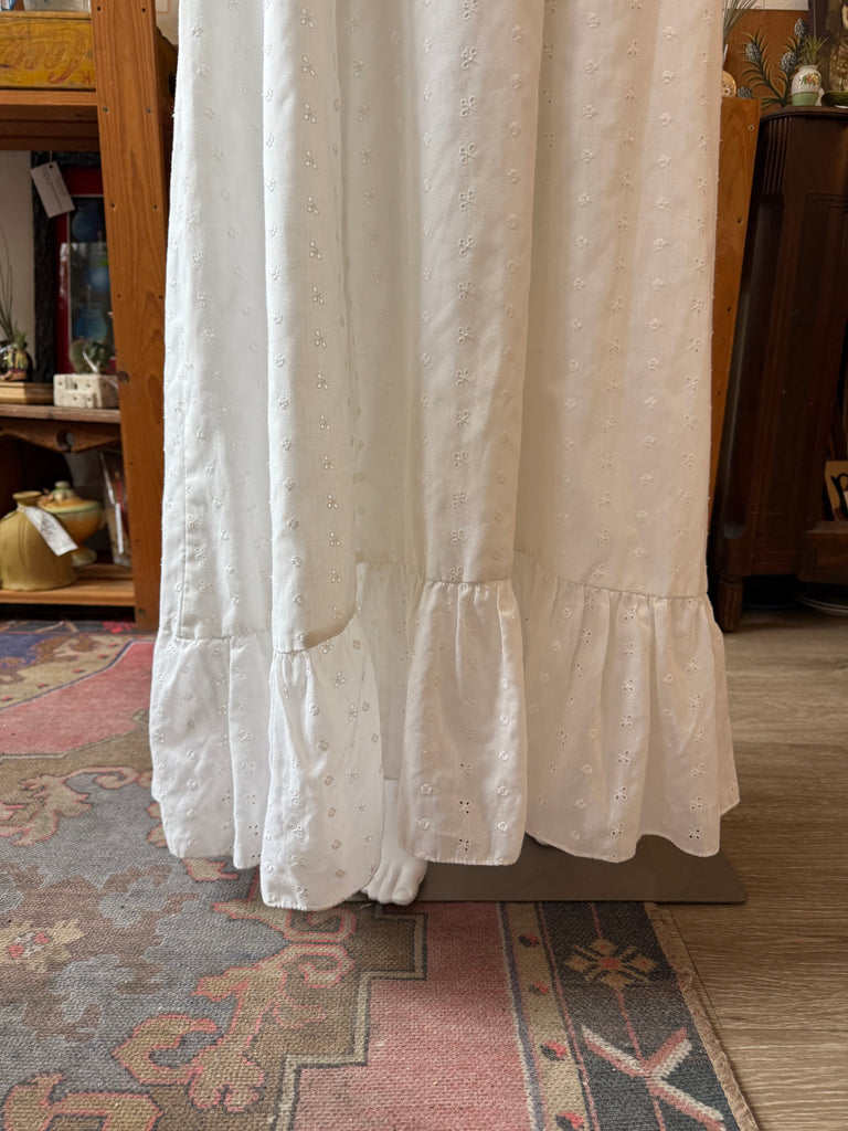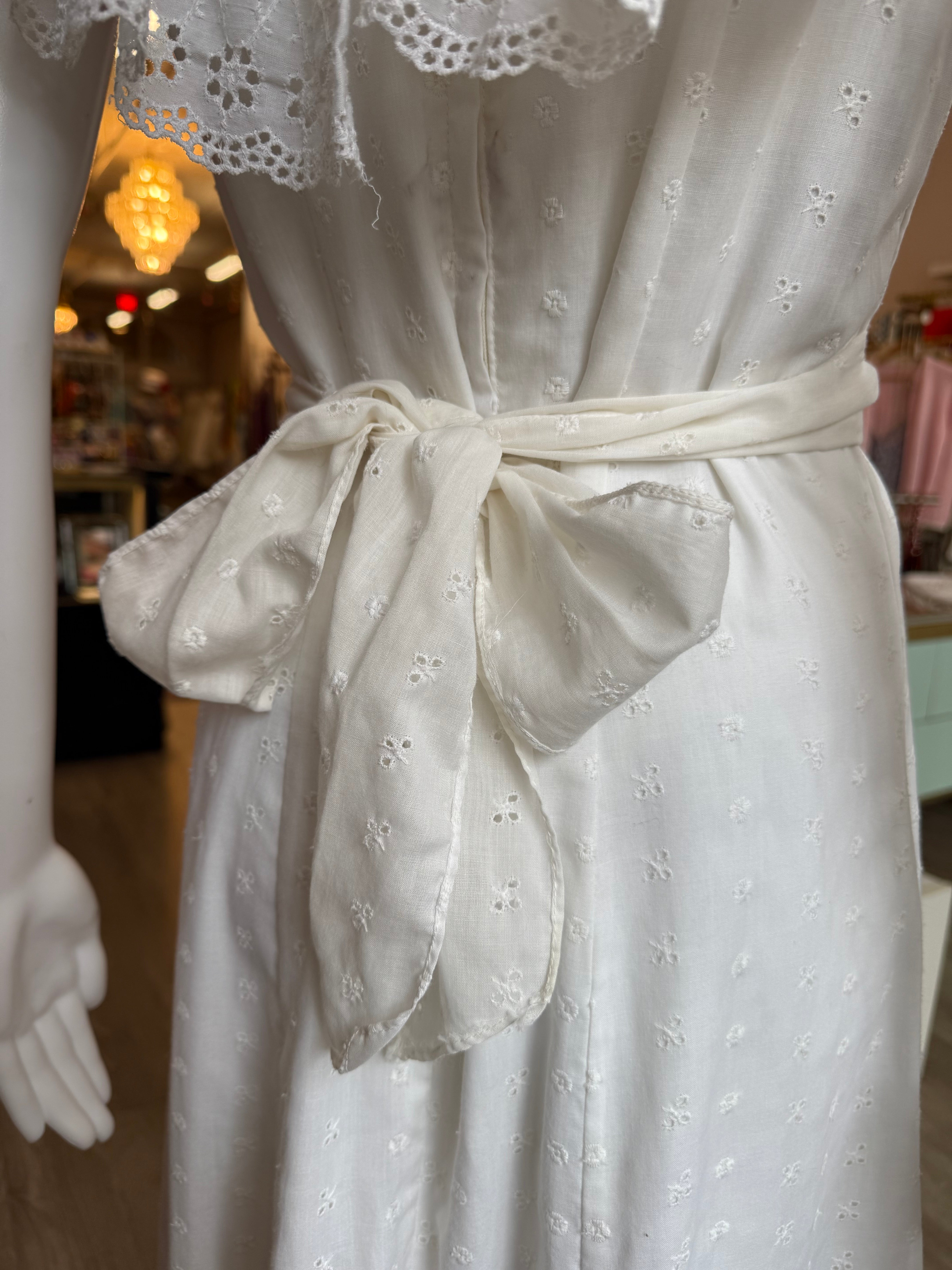 Romantic 1970s prairie maxi dress in soft white eyelet floral with the sweetest ruffled neckline. Features an off-the-shoulder style flounce trimmed in delicate eyelet lace, a fitted bodice, and a long flowing skirt with a subtle ruffled hem. Comes with its original matching tie belt for shaping the waist. Back zipper closure. Unbranded.