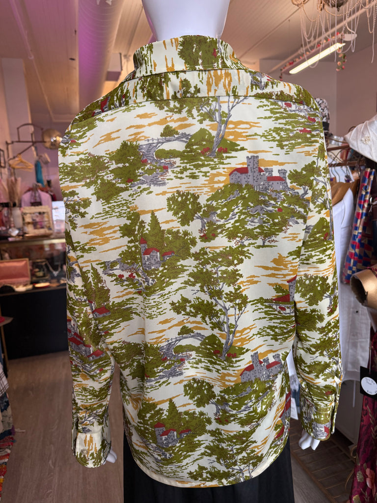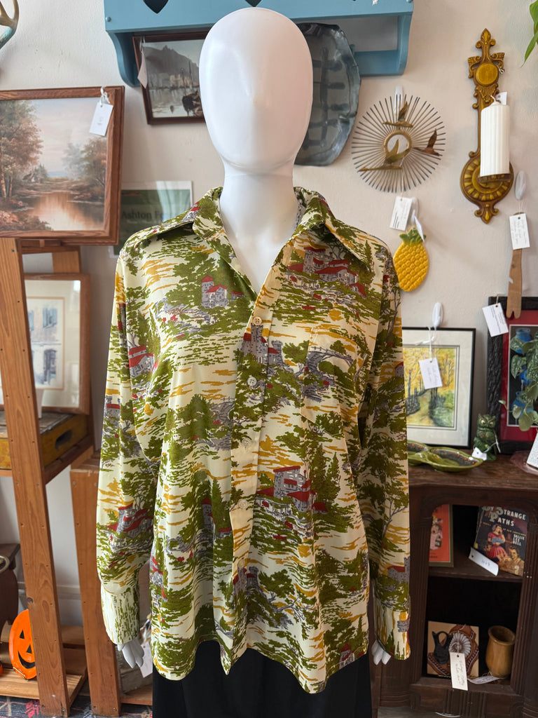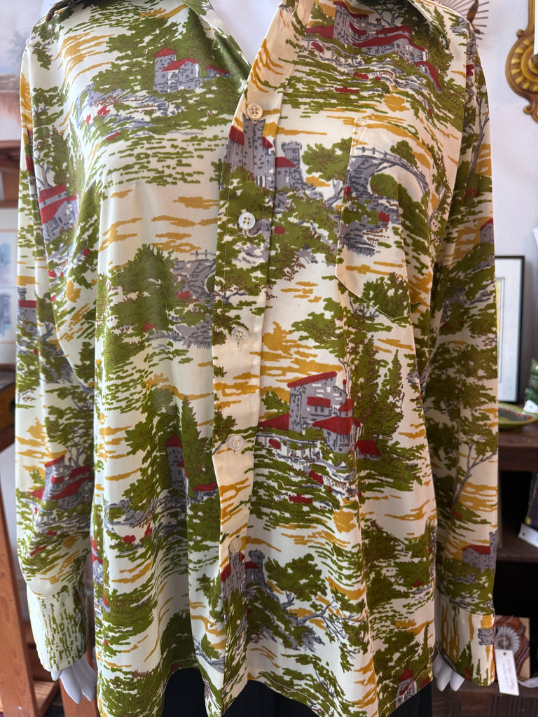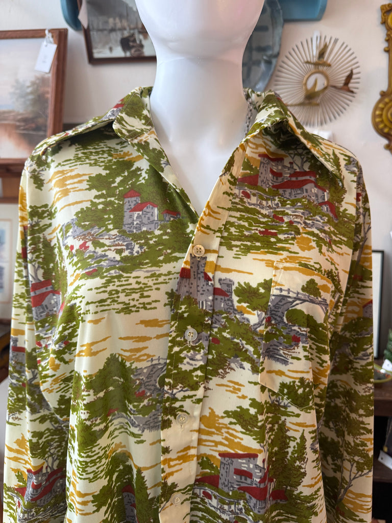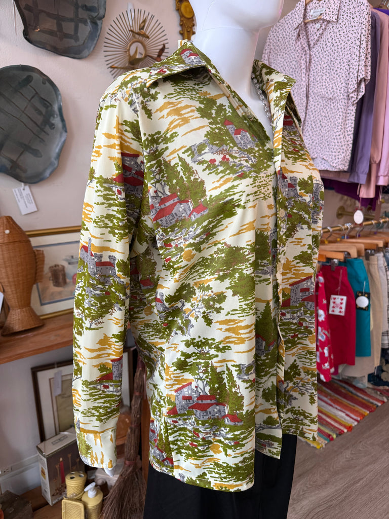 70s button-front shirt by Sutton Place in a standout scenic/landscape novelty print (olive, mustard, cream, grey with red-roof houses). Classic long point “dagger” collar, single chest pocket, and button cuffs. Lightweight textured polyester; made in Korea. Unisex fit.
