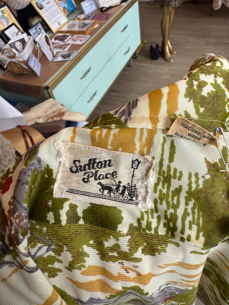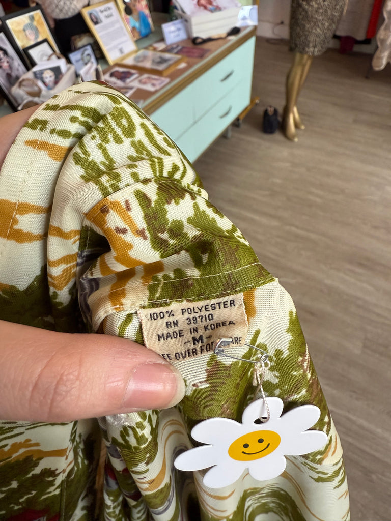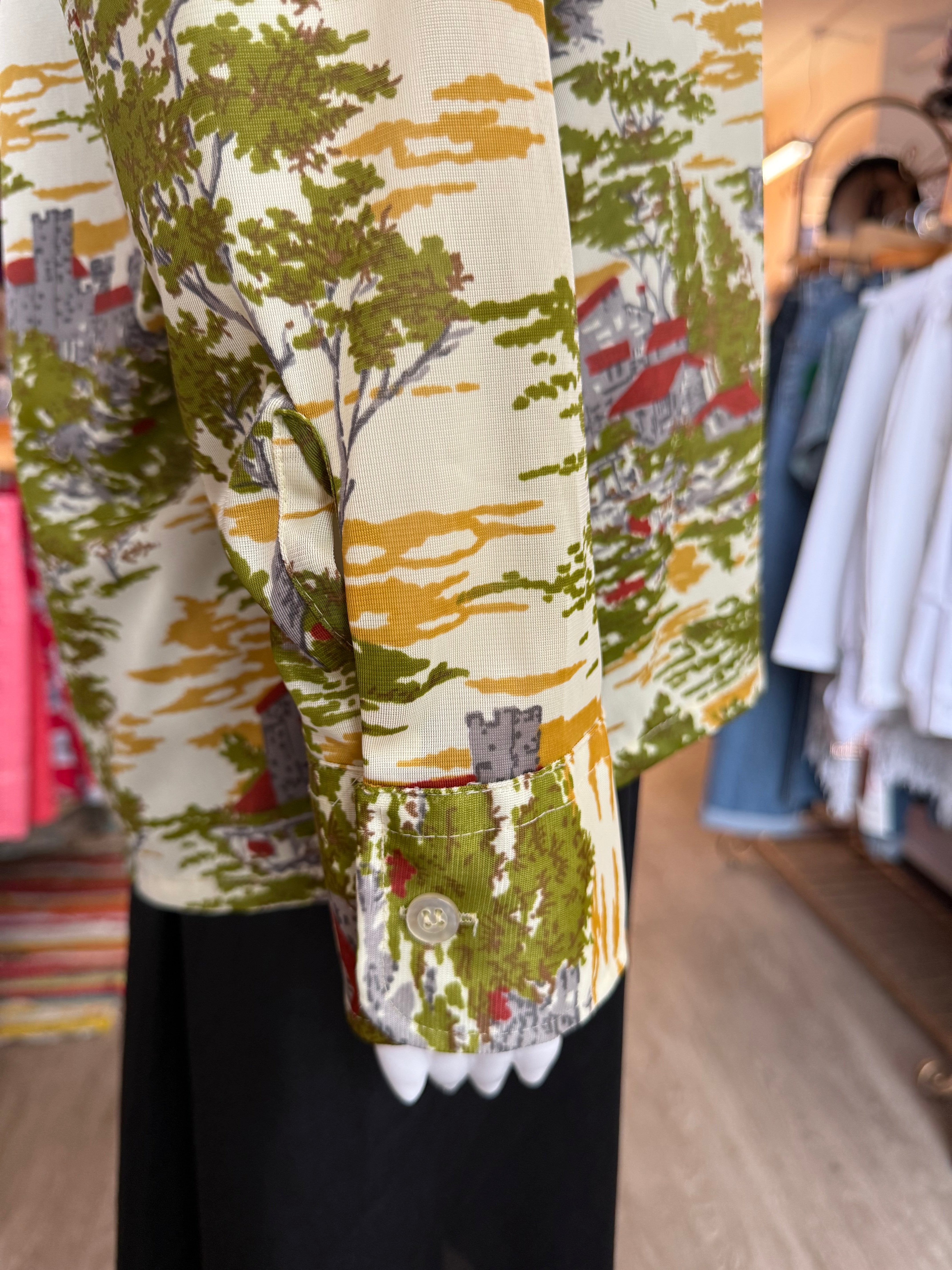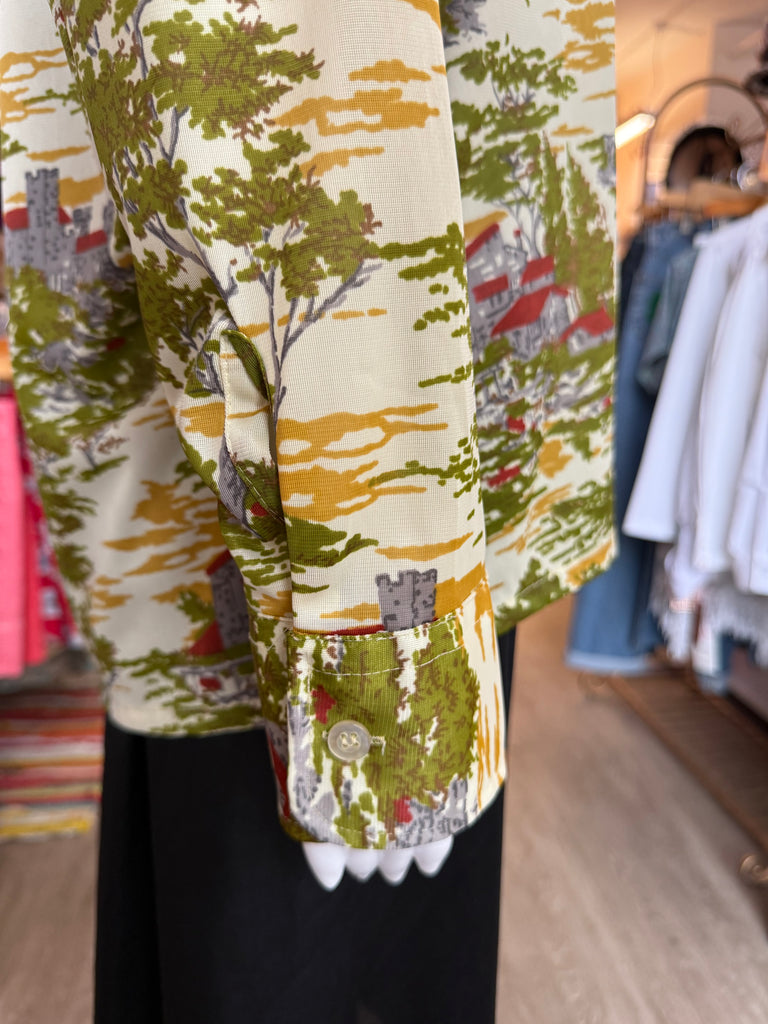 70s button-front shirt by Sutton Place in a standout scenic/landscape novelty print (olive, mustard, cream, grey with red-roof houses). Classic long point “dagger” collar, single chest pocket, and button cuffs. Lightweight textured polyester; made in Korea. Unisex fit.