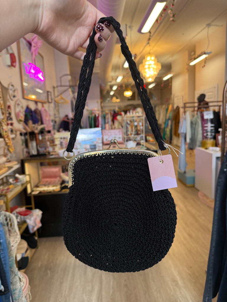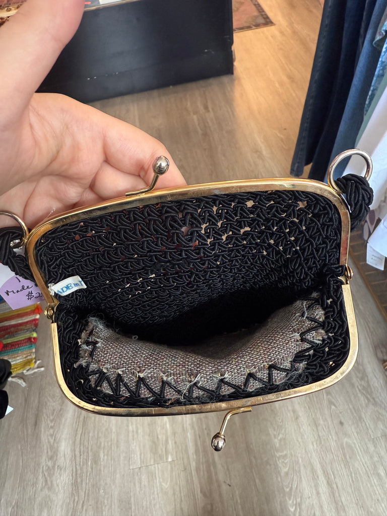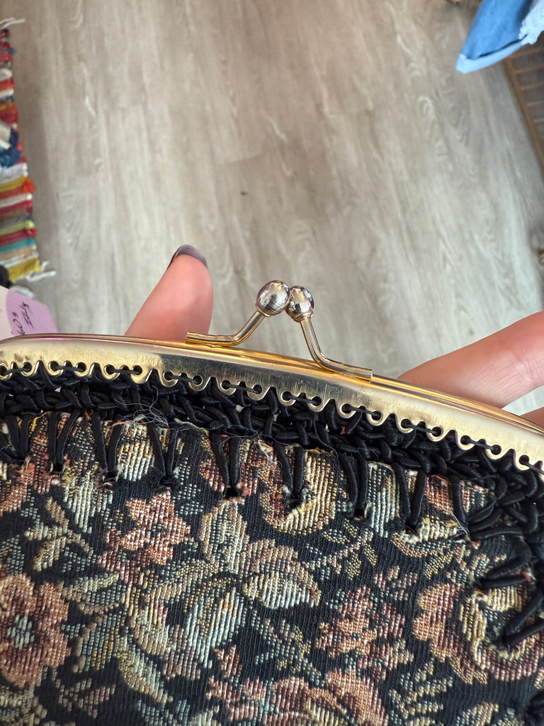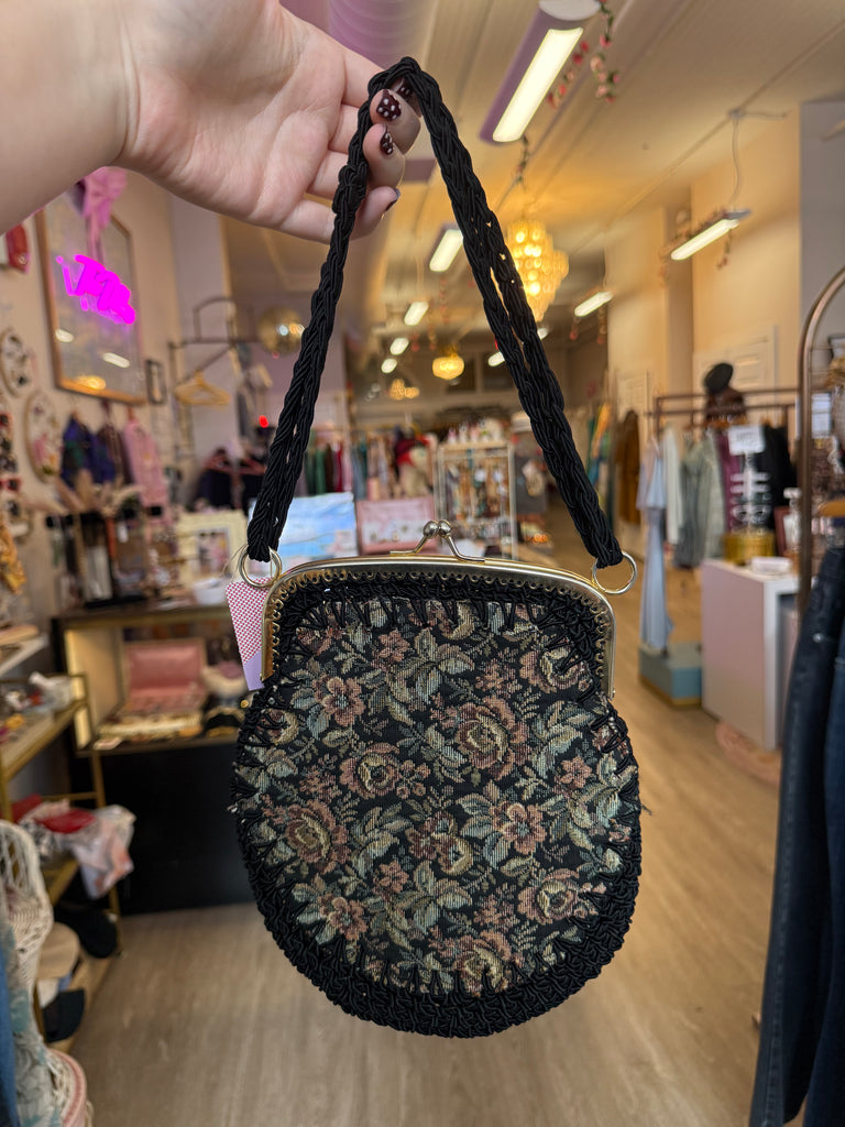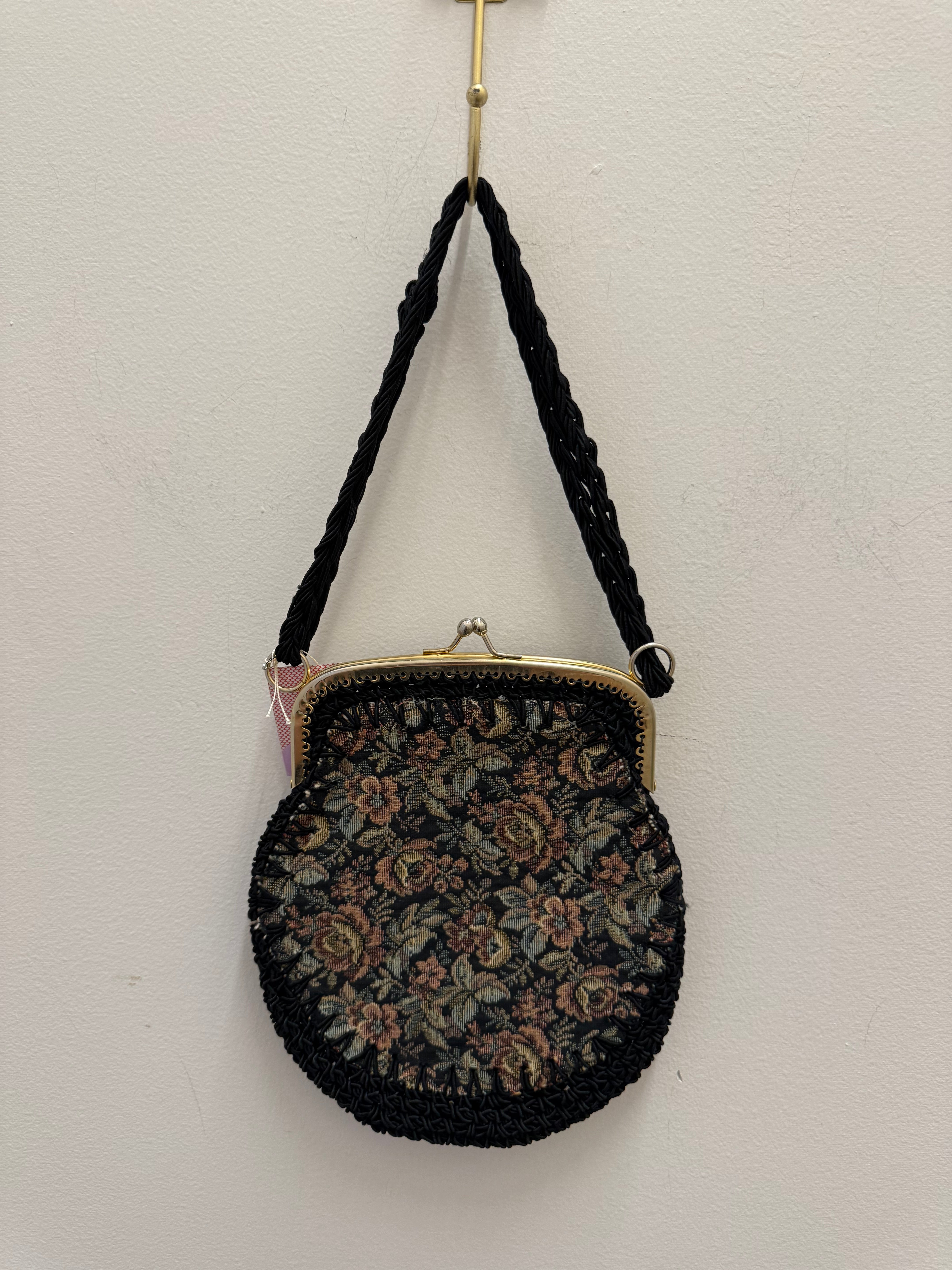 Charming 1960s tapestry handbag made in Italy, featuring a floral jacquard front and a black woven back with matching braided handle. Accented with gold-tone metal hardware and a kiss-lock clasp. Interior is partially lined with sturdy woven fabric. Some light wear to the frame consistent with age. A beautifully detailed midcentury piece.