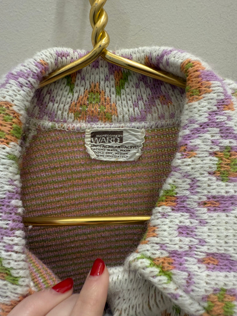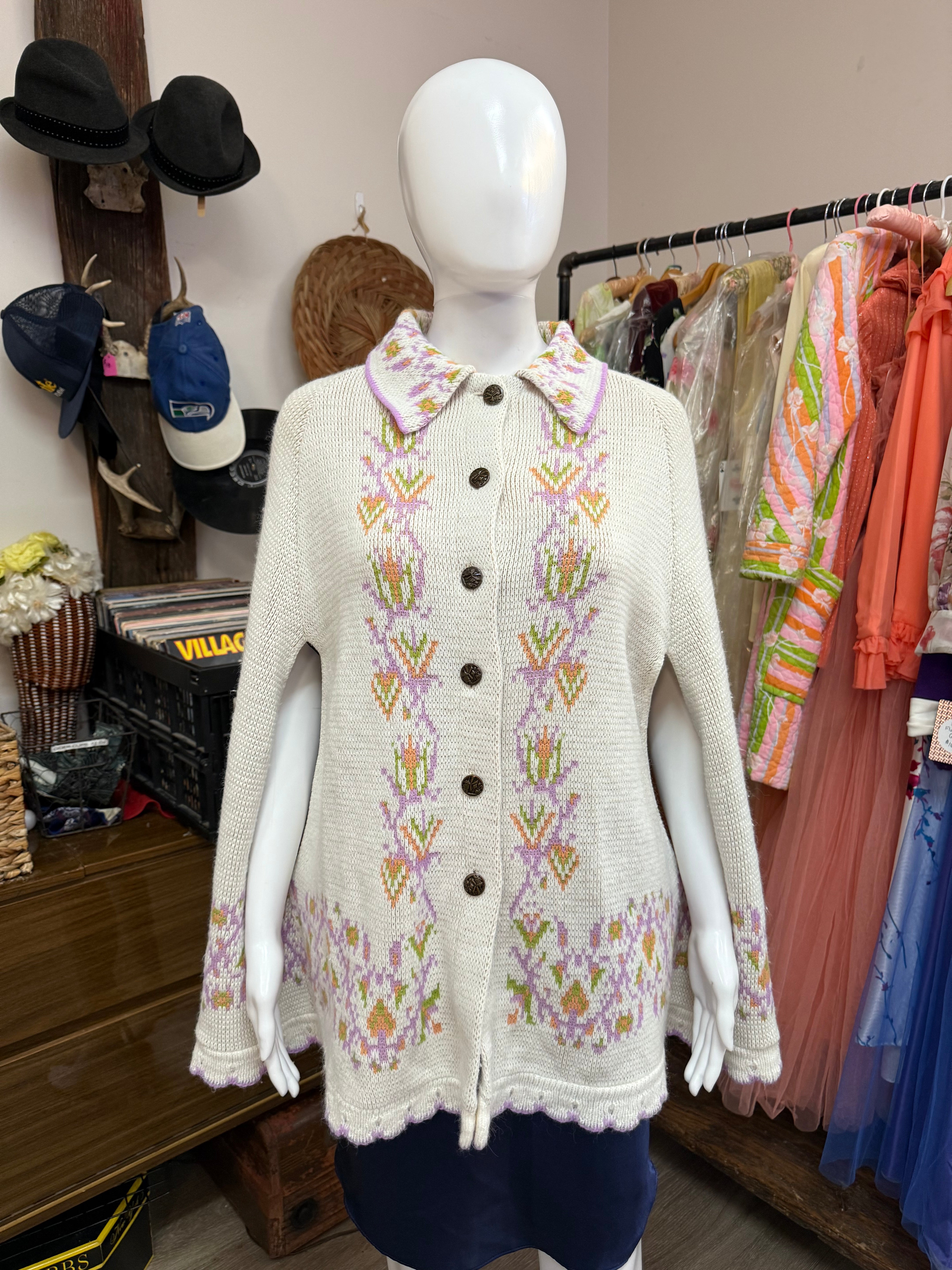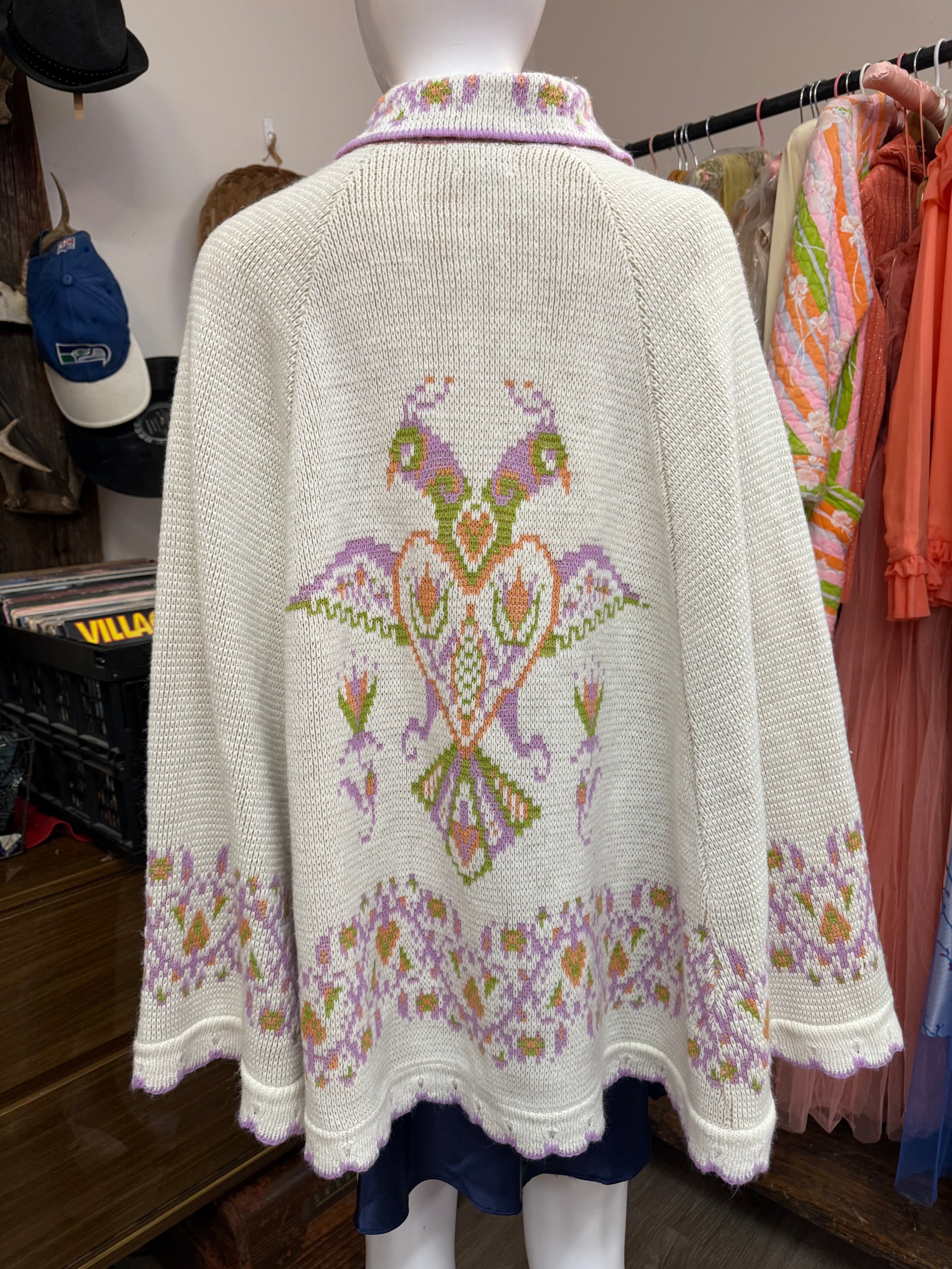 Unique 1970s Montgomery Ward cape-style sweater in soft ivory acrylic with a beautiful woven folk-inspired pattern in lavender, green, and peach. Features a pointed collar, front button closure, and scalloped trim along the hem and cuffs. The back showcases an intricate woven bird motif and floral style design.