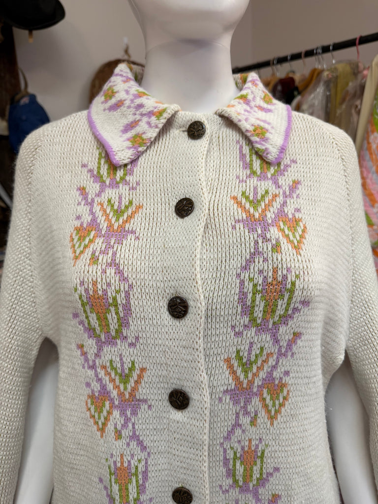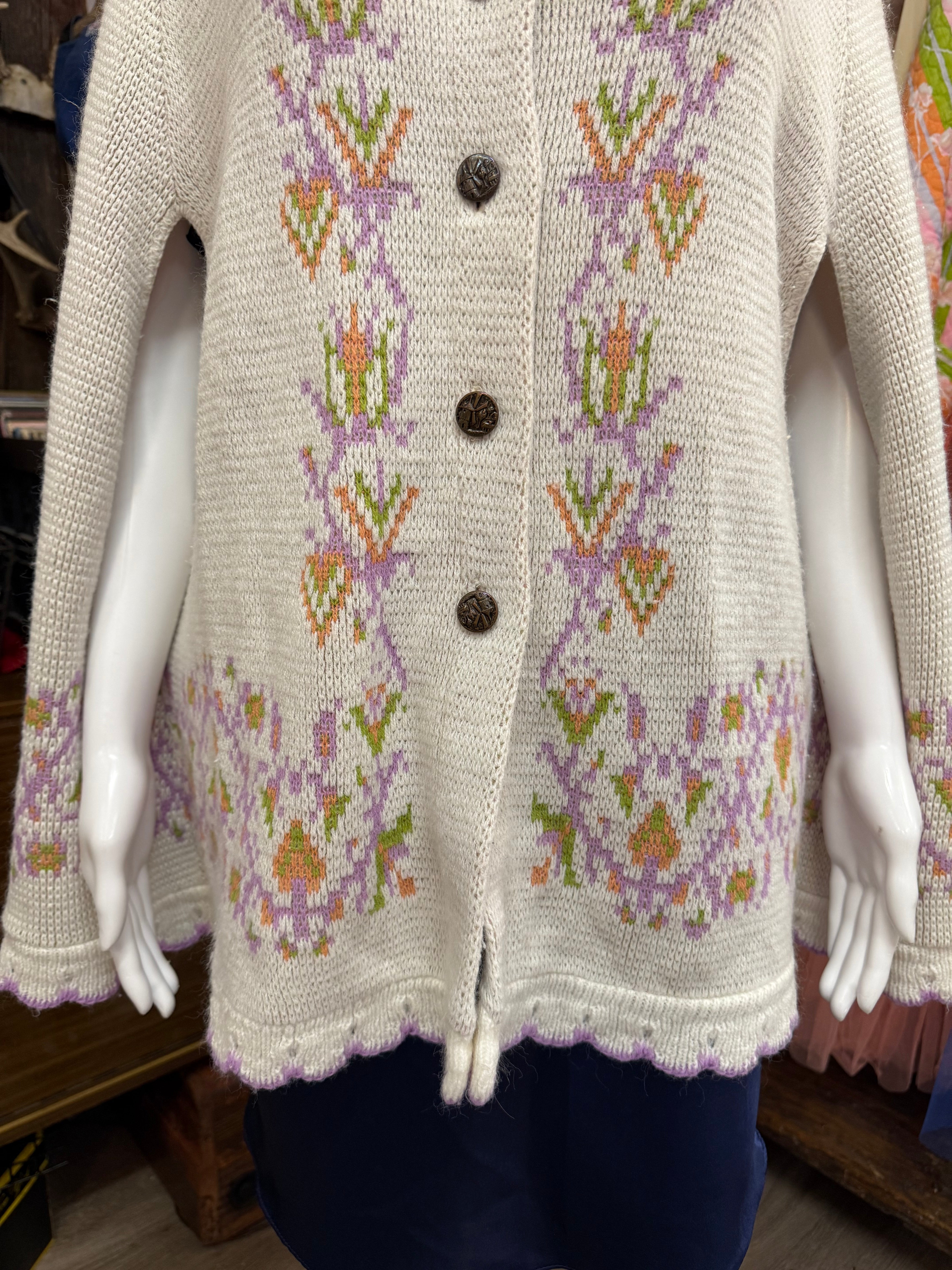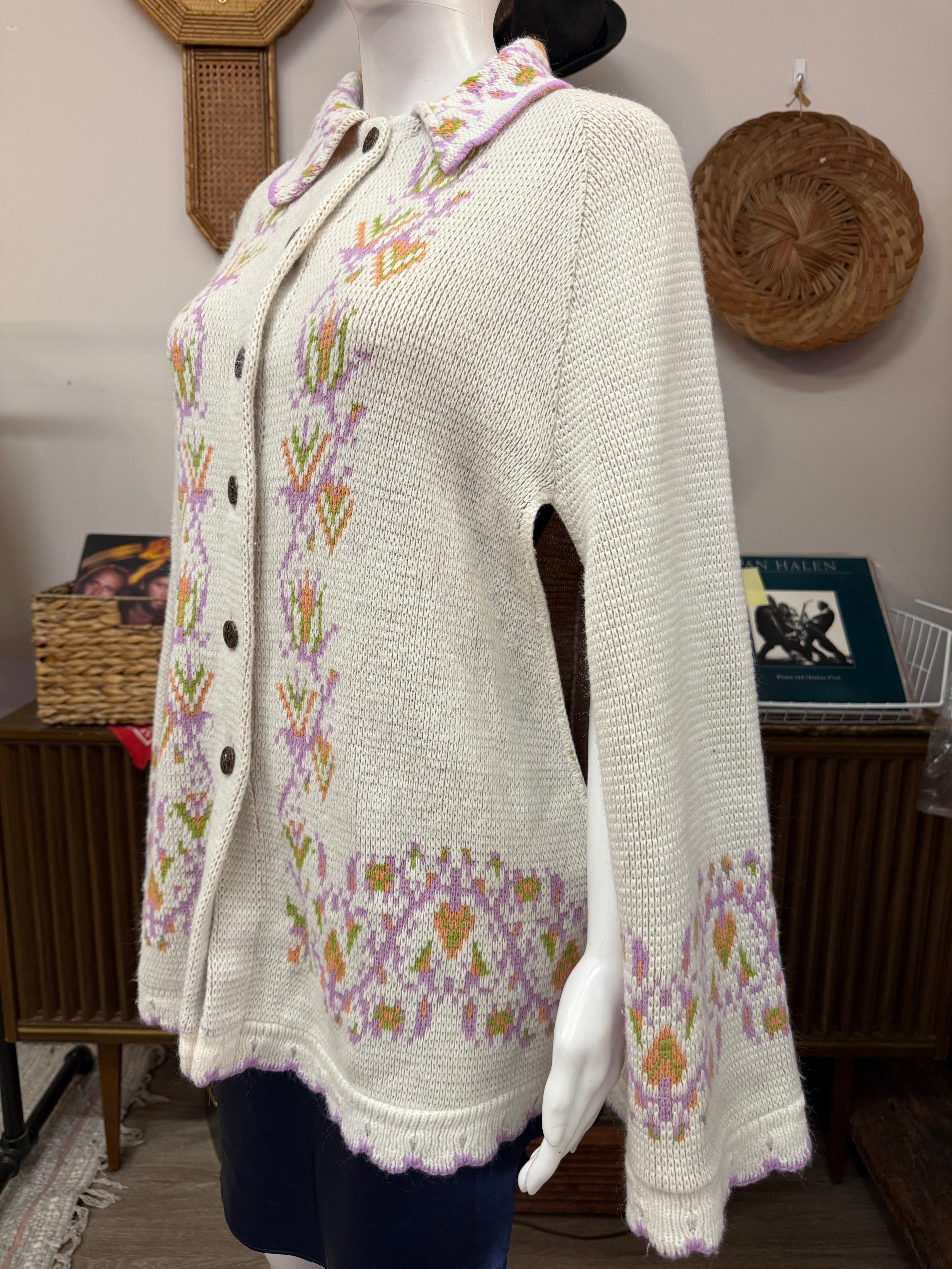 Unique 1970s Montgomery Ward cape-style sweater in soft ivory acrylic with a beautiful woven folk-inspired pattern in lavender, green, and peach. Features a pointed collar, front button closure, and scalloped trim along the hem and cuffs. The back showcases an intricate woven bird motif and floral style design.