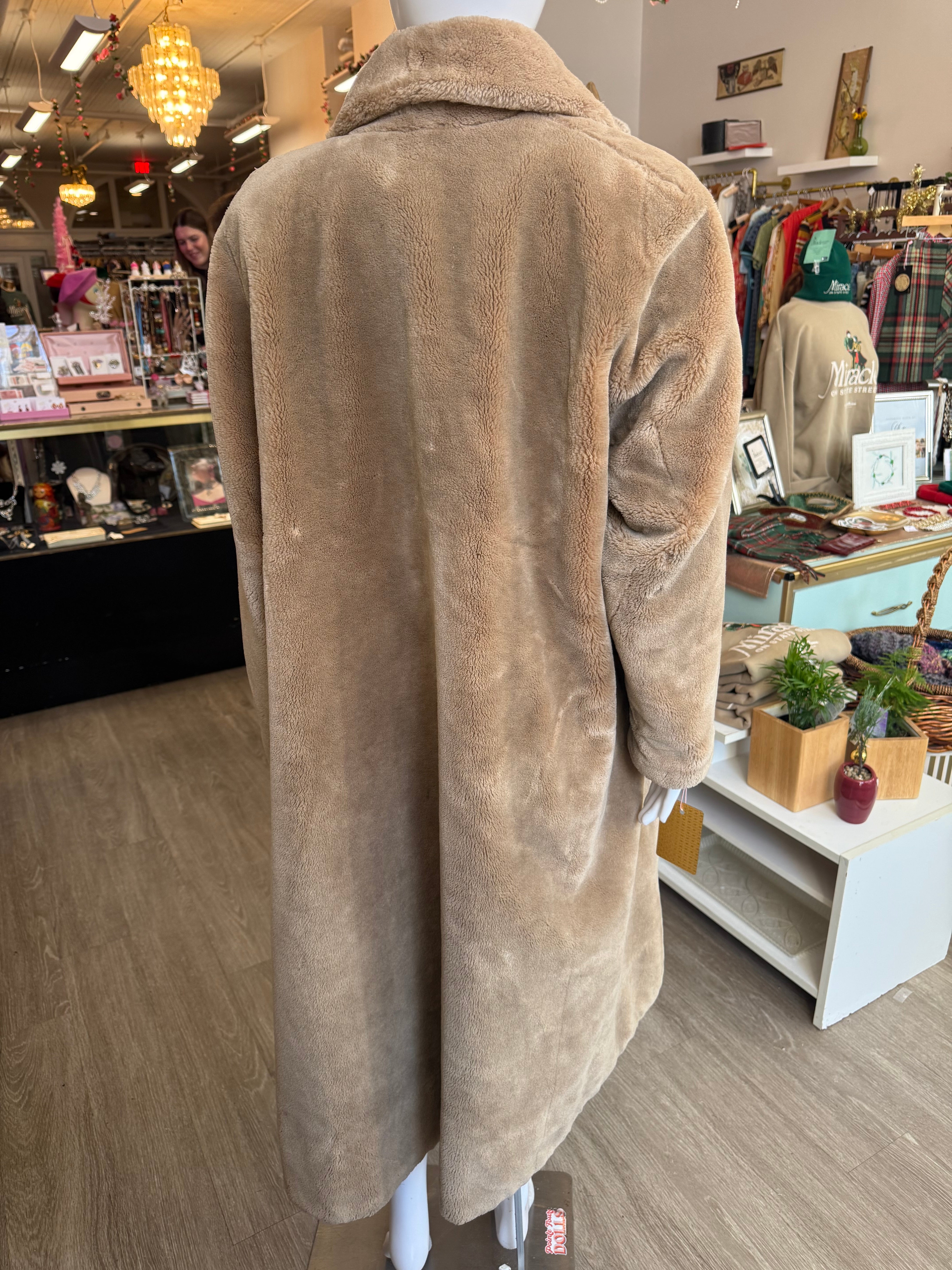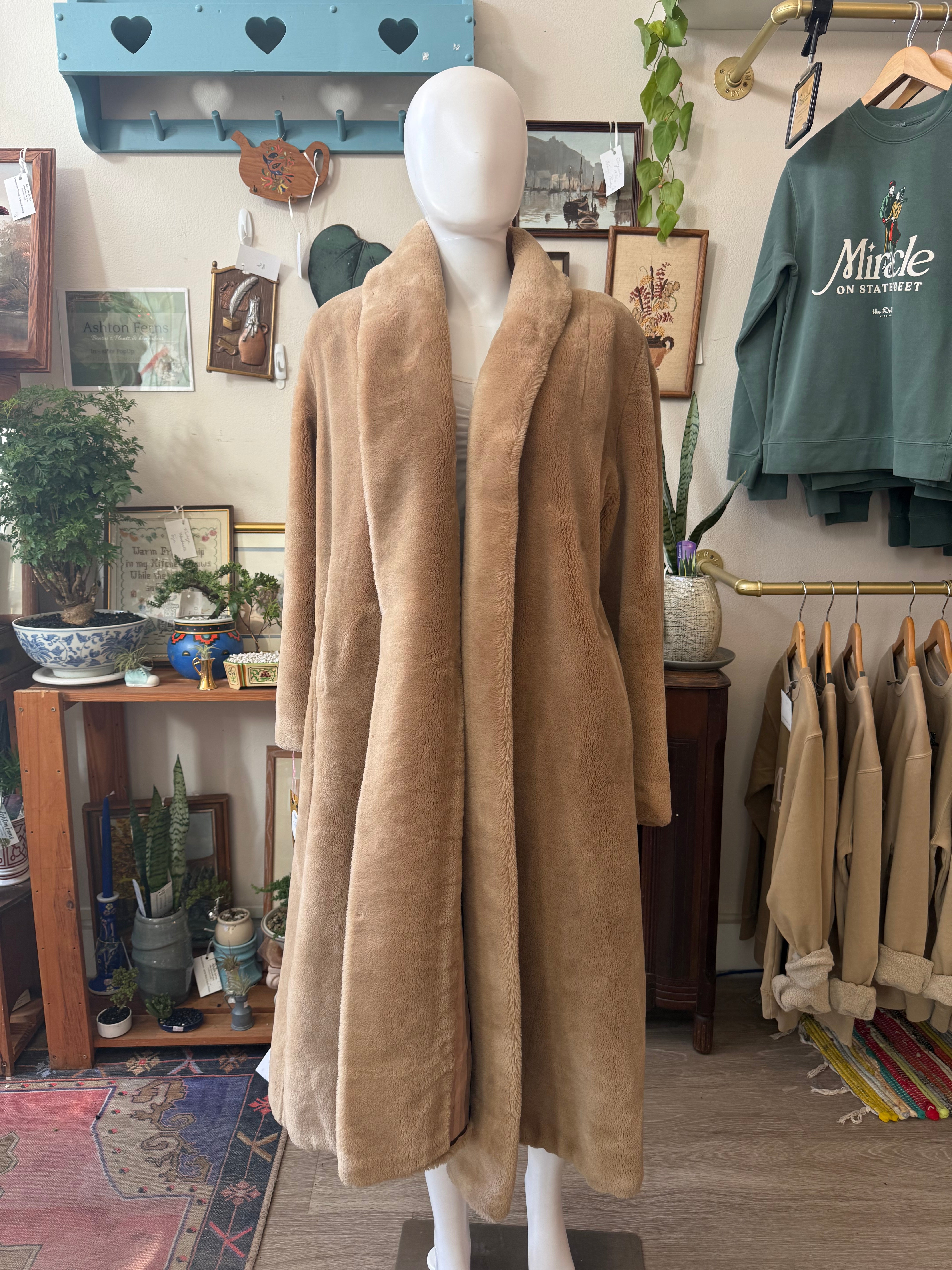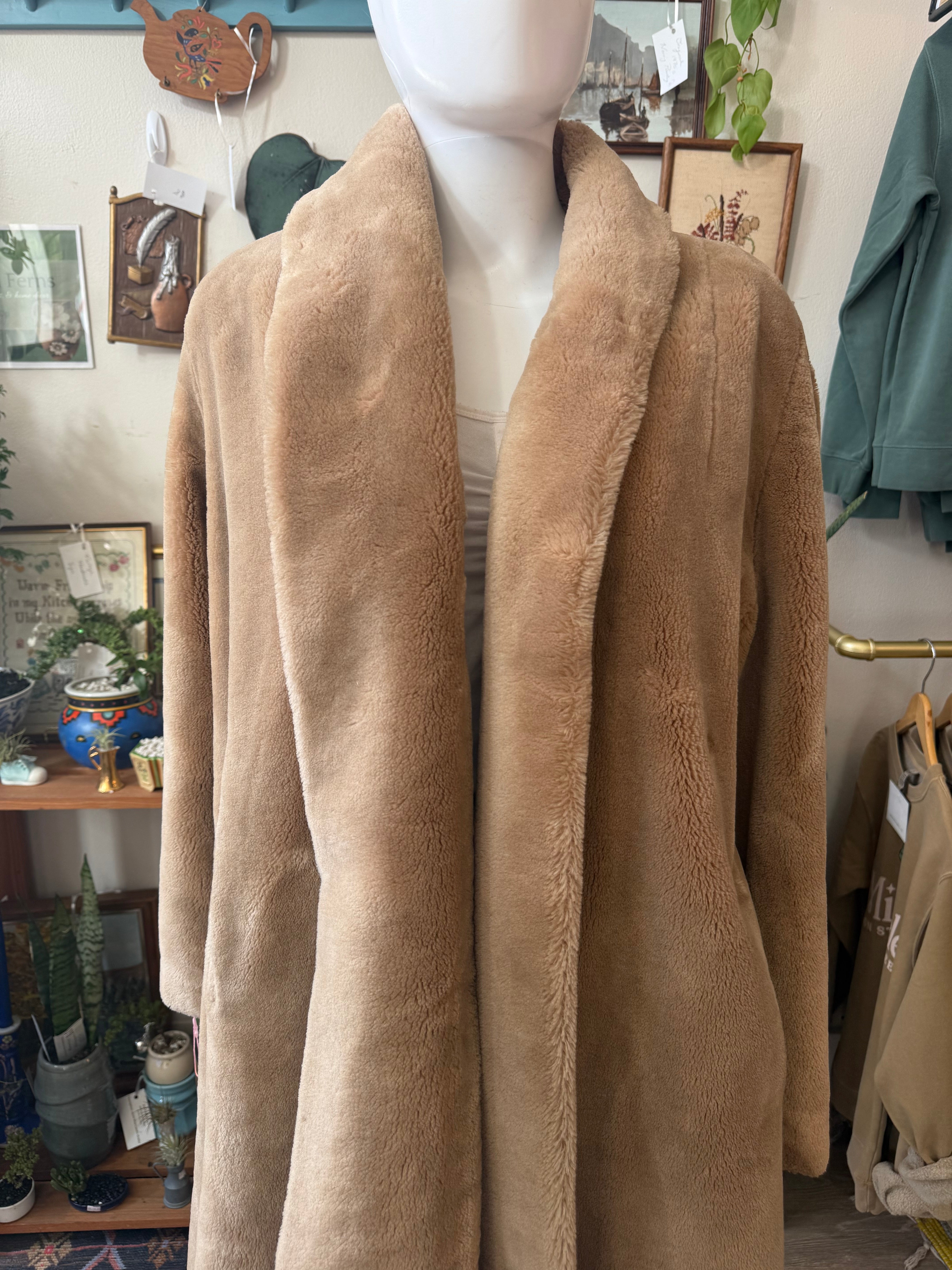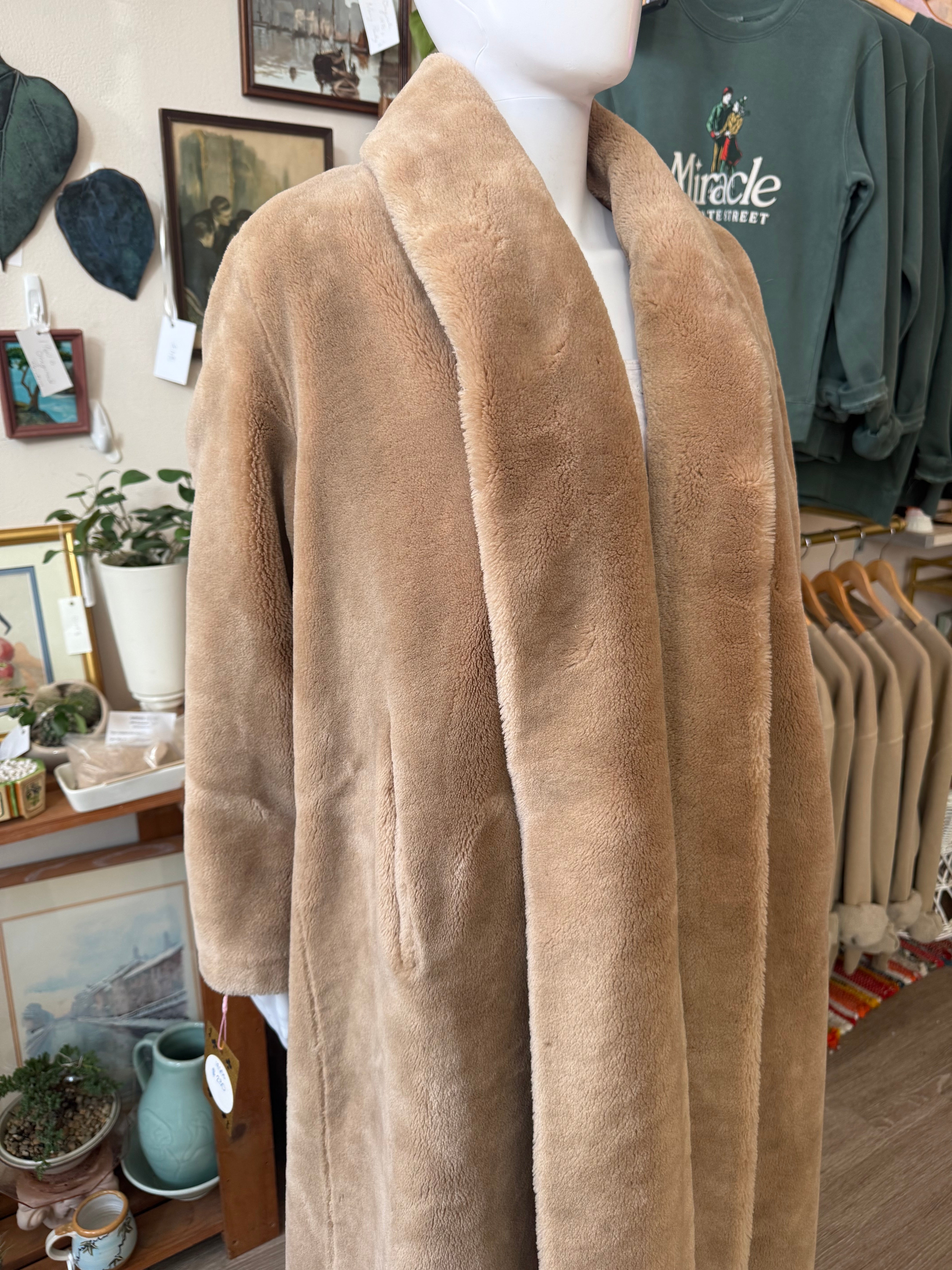 Authentic 1960s faux fur coat by Baronessa, crafted in an ultra-soft plush pile with a relaxed, dramatic drape. Features an open-front design with no closure, allowing it to wear effortlessly oversized and fluid. The standout interior is finished with a bold striped lining that adds a striking vintage contrast and elevates the overall construction. Full-length silhouette with generous volume through the body and sleeves, making it perfect for layering over dresses or heavier knits. True mid-century statement outerwear with excellent texture and visual impact.