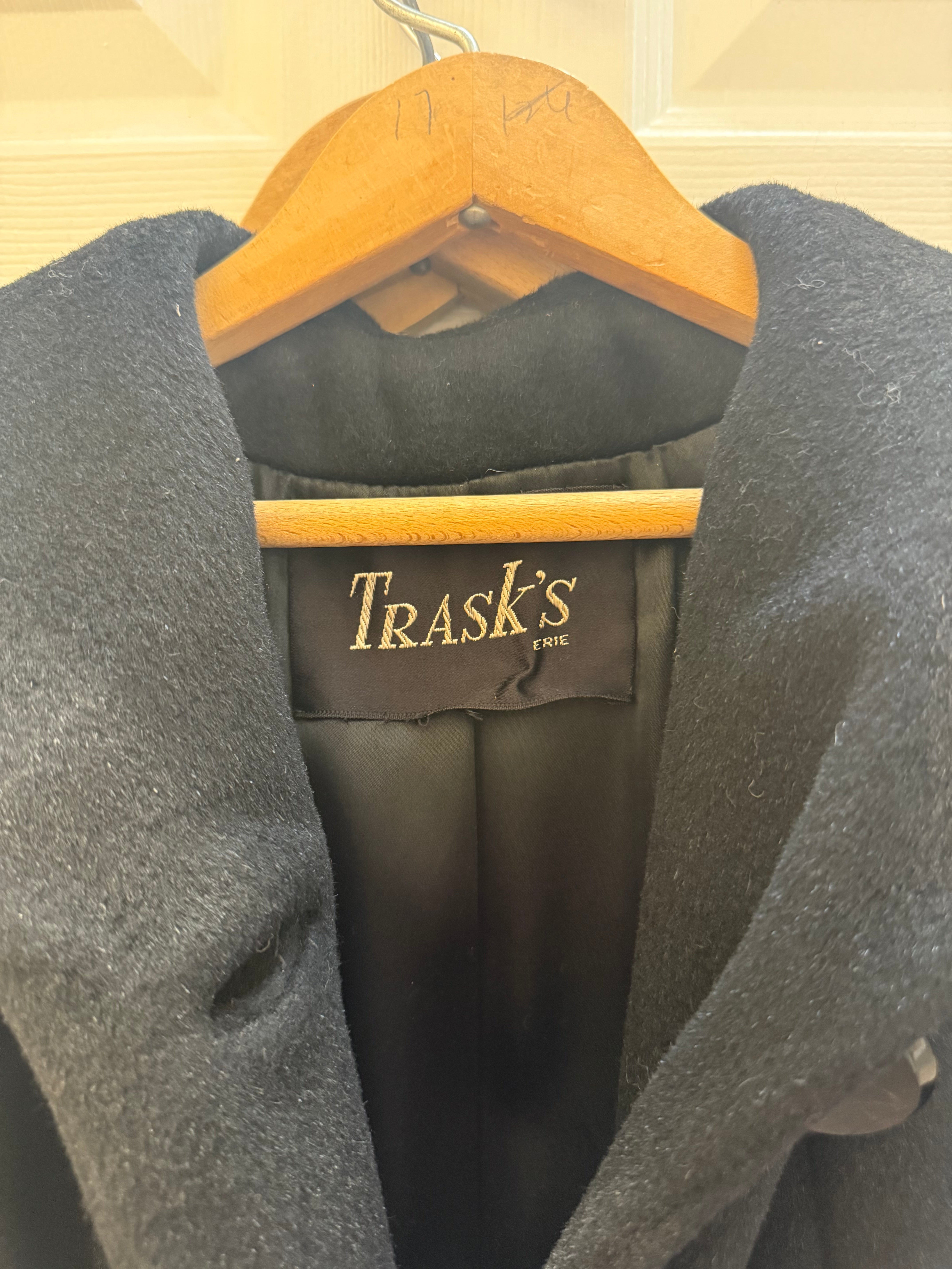 Striking authentic 1960s mod coat by Trask's, featuring a minimalist A-line silhouette and bold sculptural collar typical of the era. Crafted using Blin & Blin wool fabric imported from France, a highly regarded mid-century textile mill known for producing luxury European coatings. Union tag present, confirming period authenticity and quality construction.