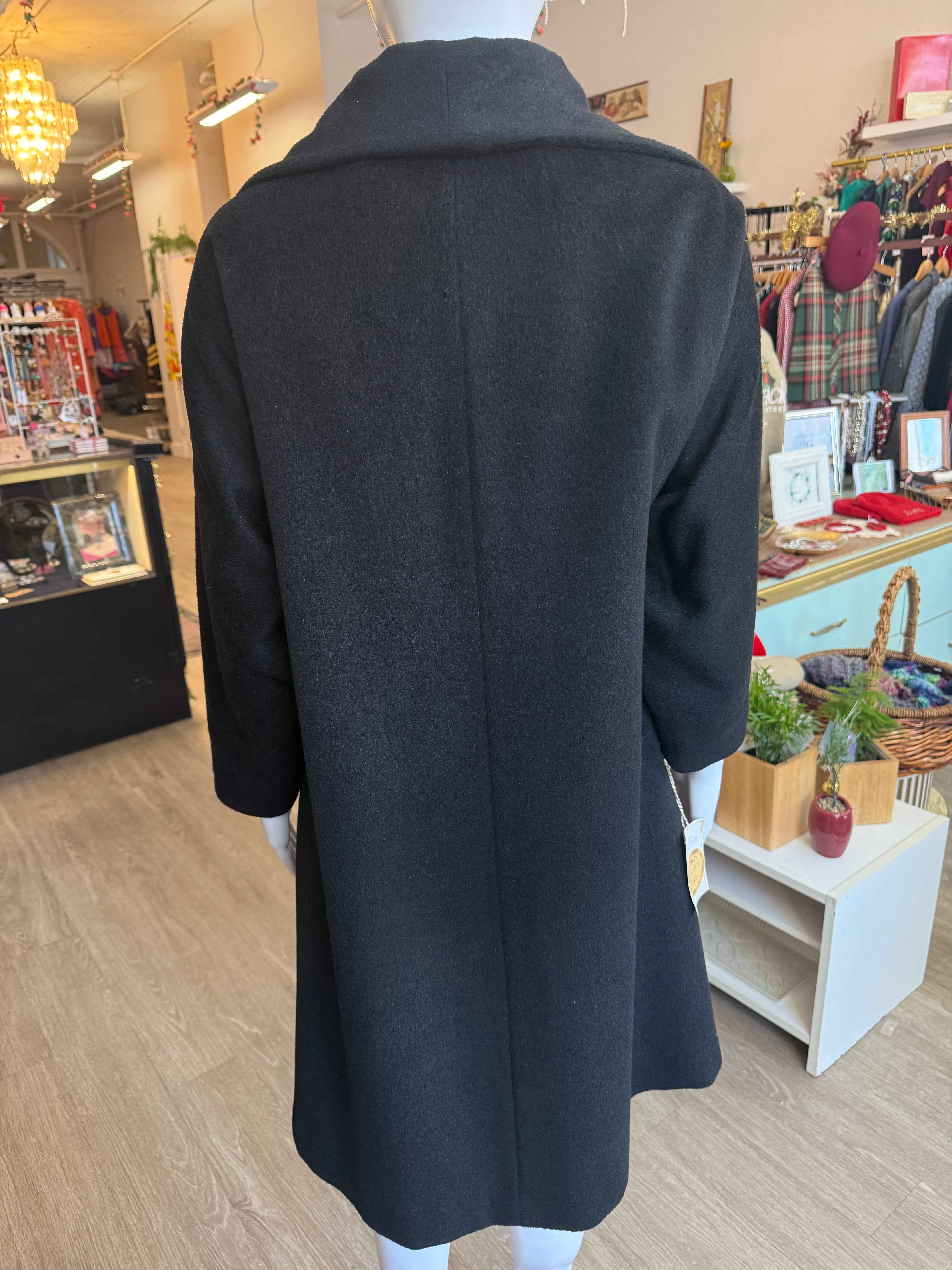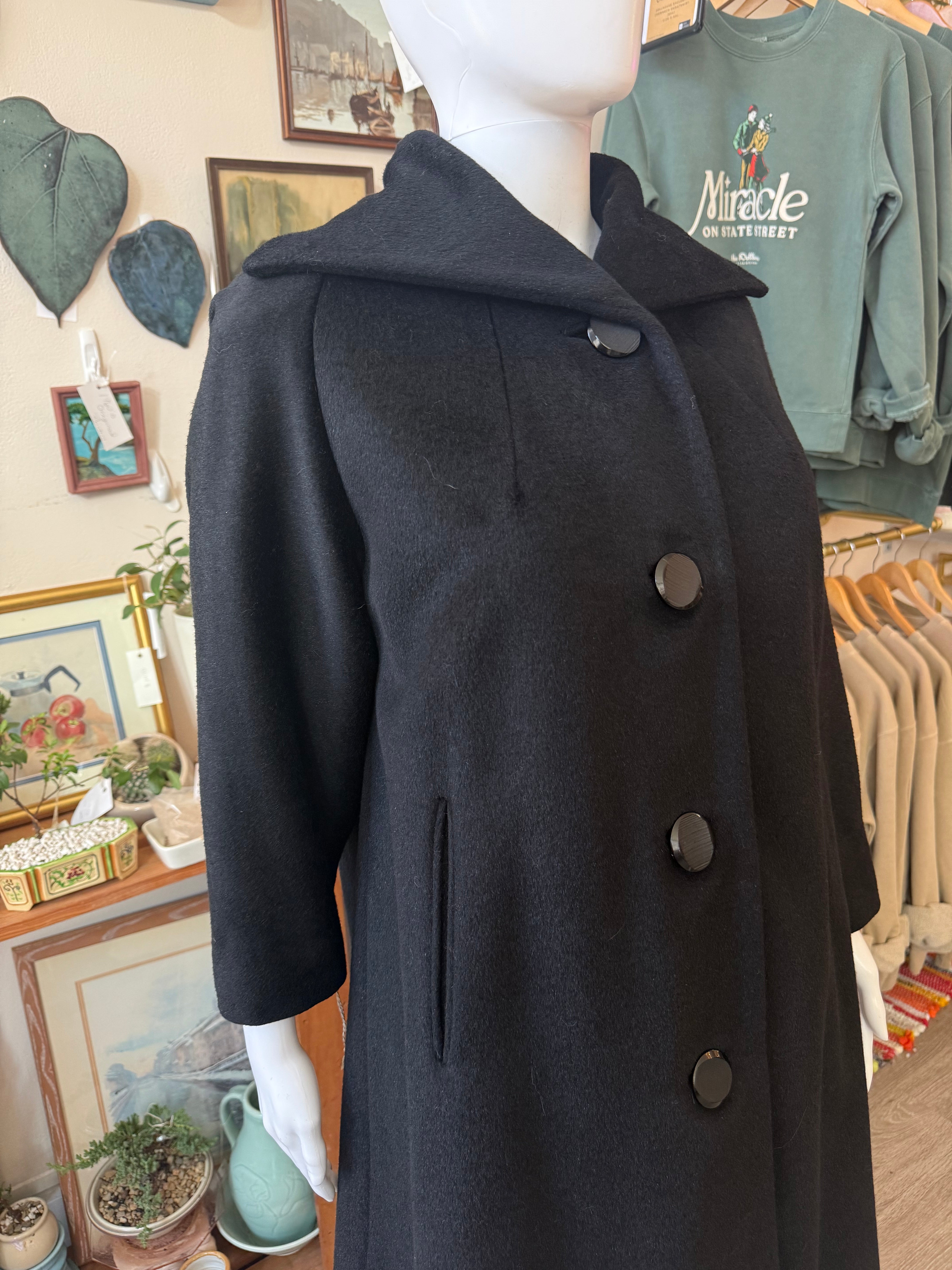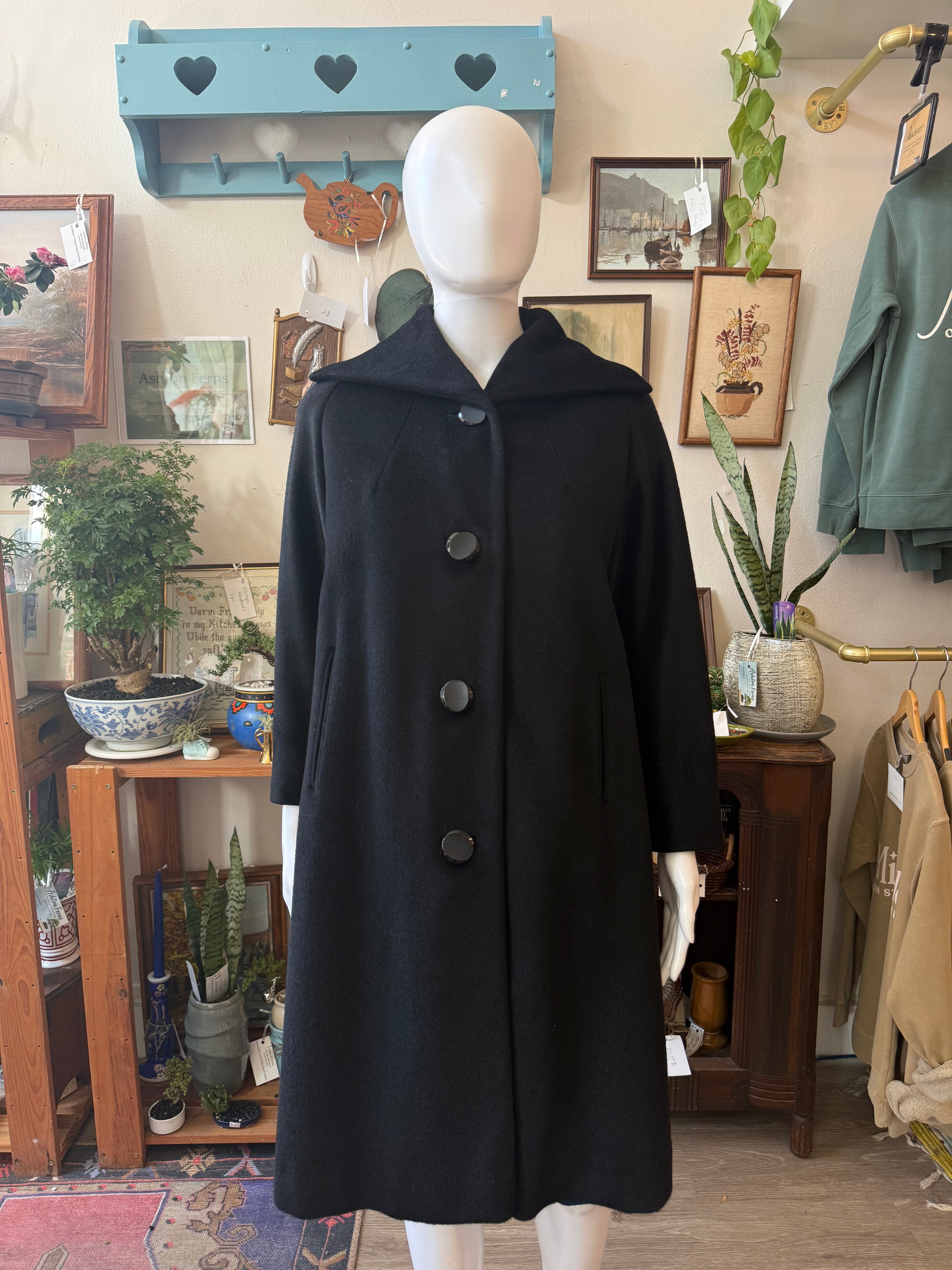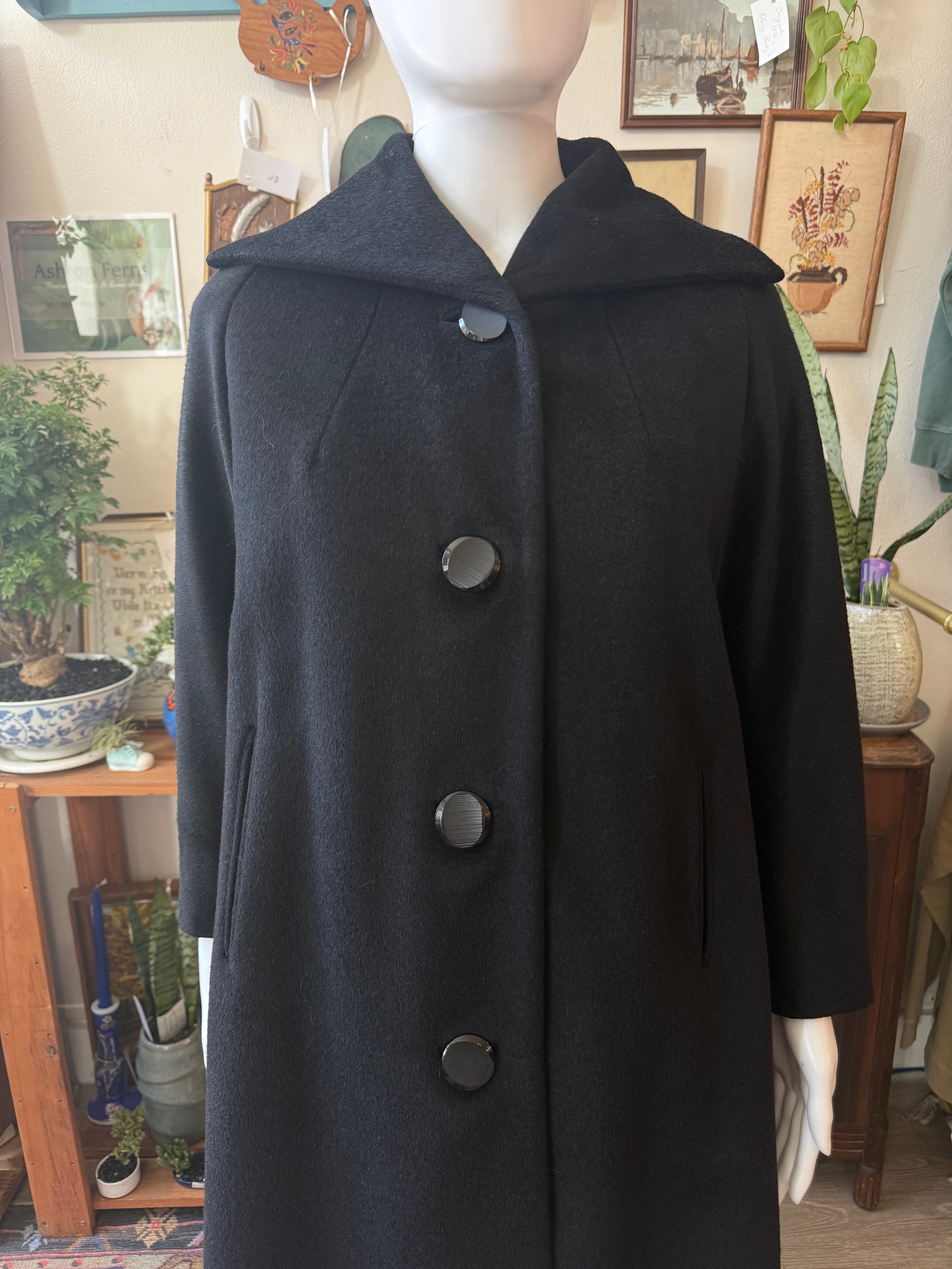 This coat is fully lined in black and fastens with a clean front button closure accented by oversized round buttons. The design is structured yet understated, with subtle vertical seaming and discreet slit pockets that keep the silhouette sharp and uncluttered. Finished in classic jet black, making it an endlessly wearable vintage outerwear staple.