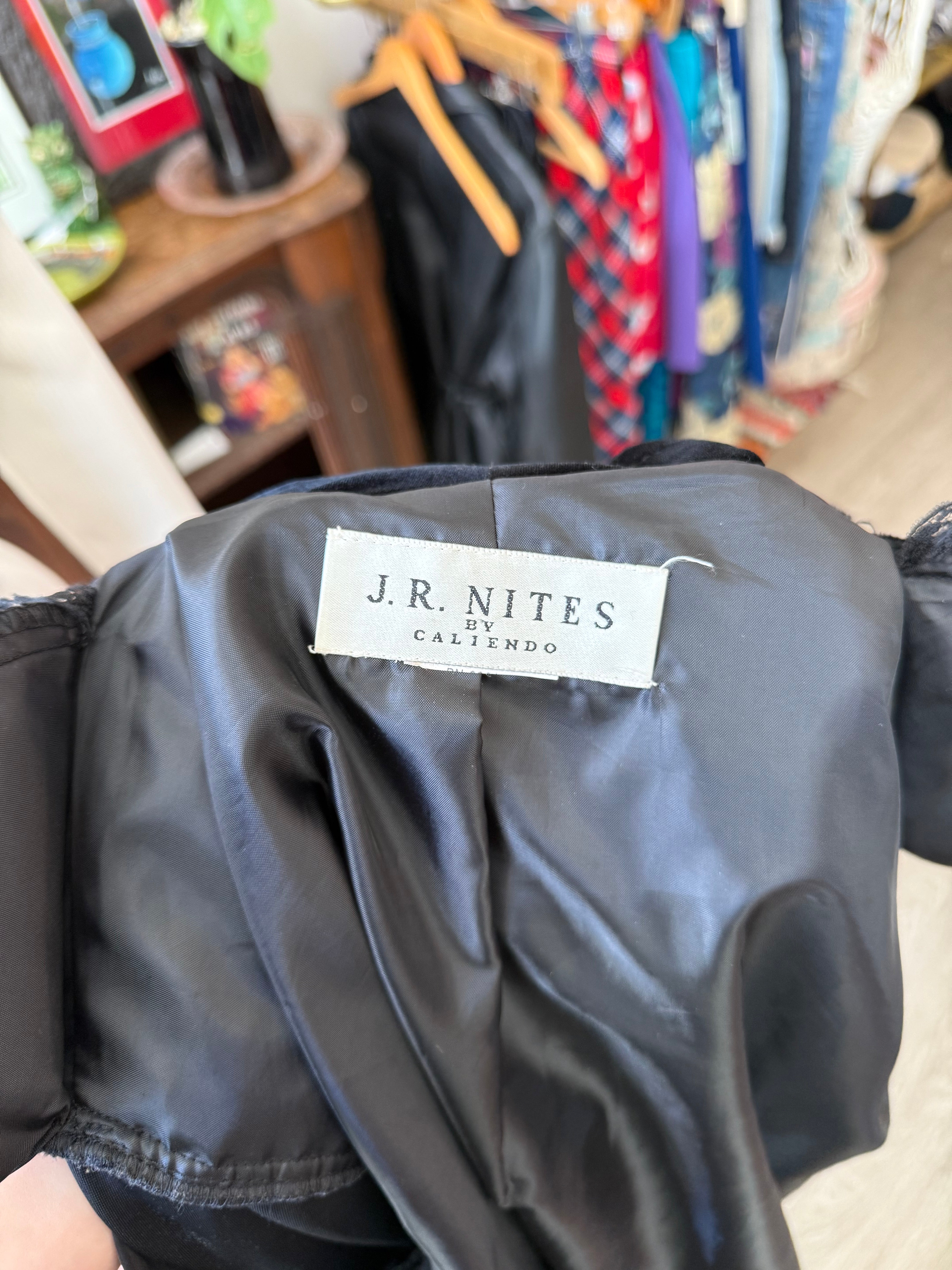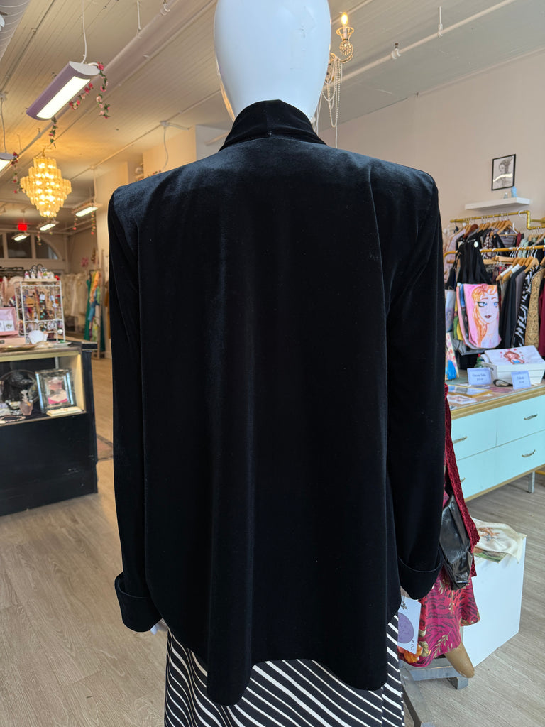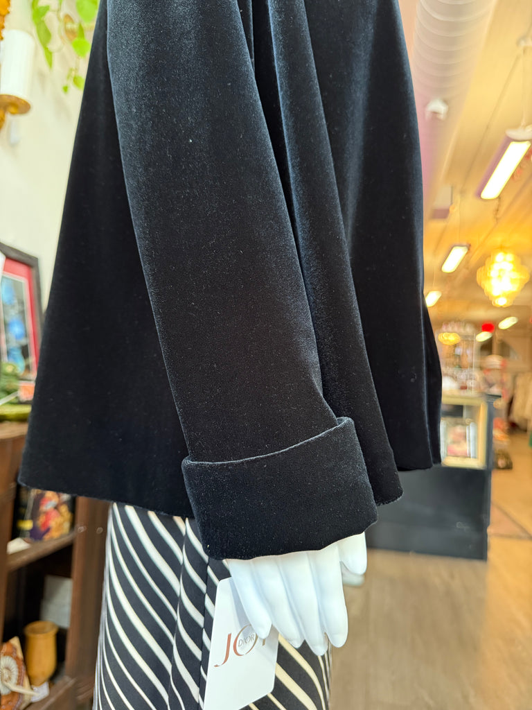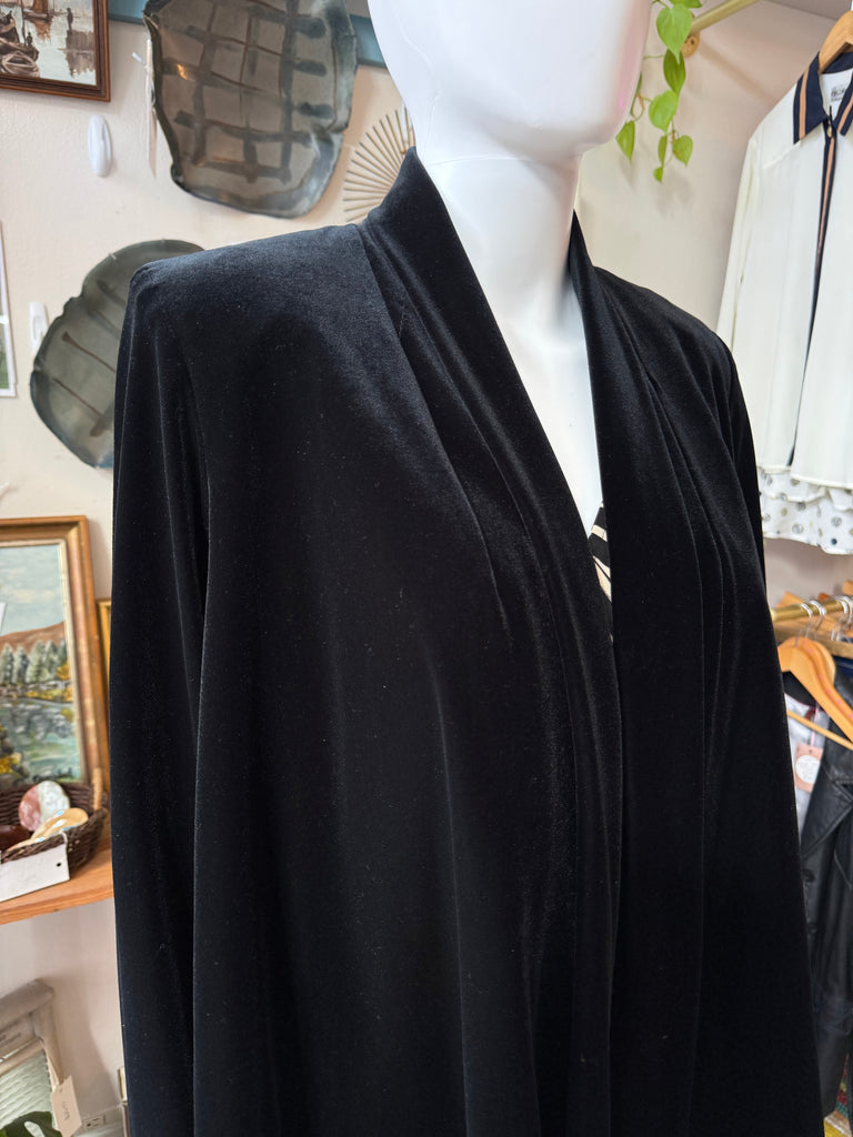 Plush black velvet swing coat from the 90s by J.R. Nites by Caliendo. Classic open-front, softly draped silhouette with cuffed sleeves and built-in shoulder pads for that elegant, structured shape. Effortlessly dressy yet wearable - perfect over slip dresses, trousers, or denim. Would best fit a modern small or medium.