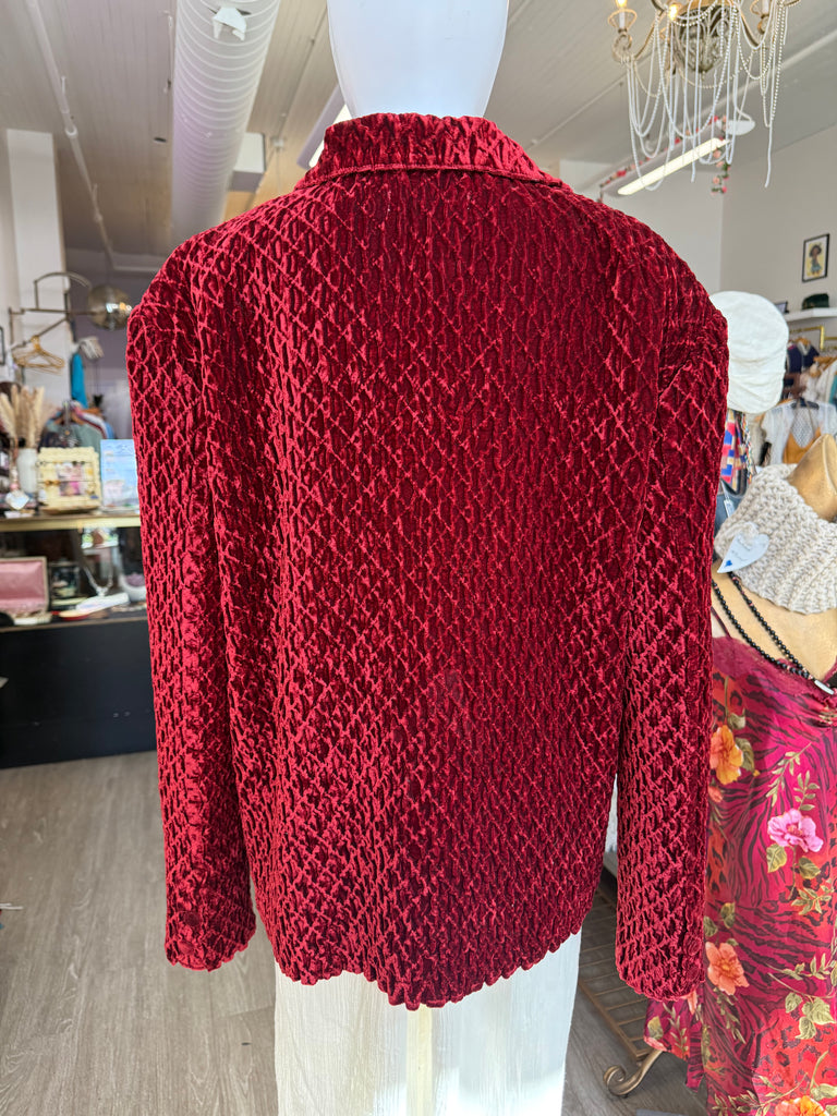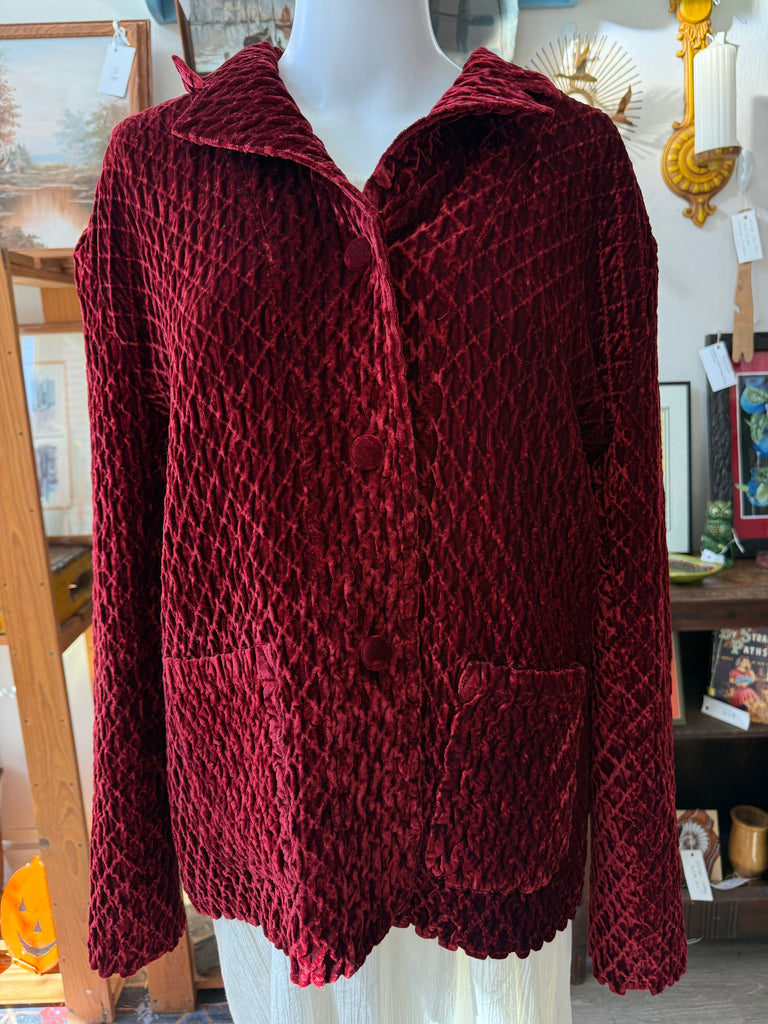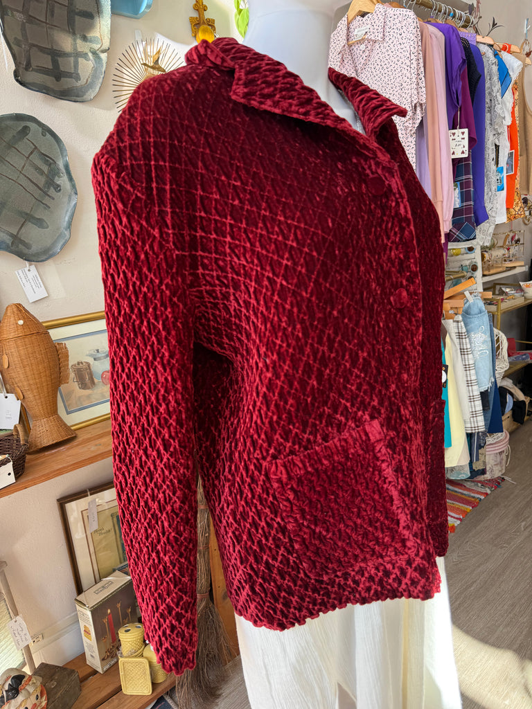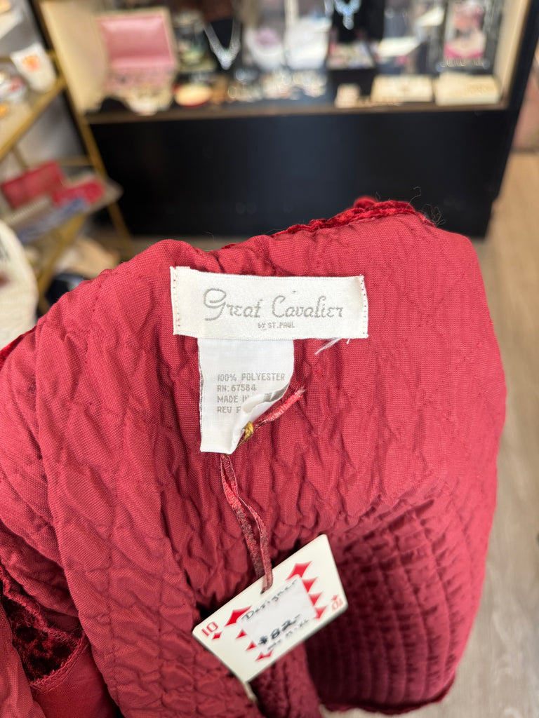 Plush 90s designer coat in a deep burgundy, by Great Cavalier by St. Paul. Quilted/waffle-textured velour with covered buttons and roomy patch pockets. 100% polyester with shoulder pads for structure. Some loose threads and small marks, but in overall amazing vintage condition.