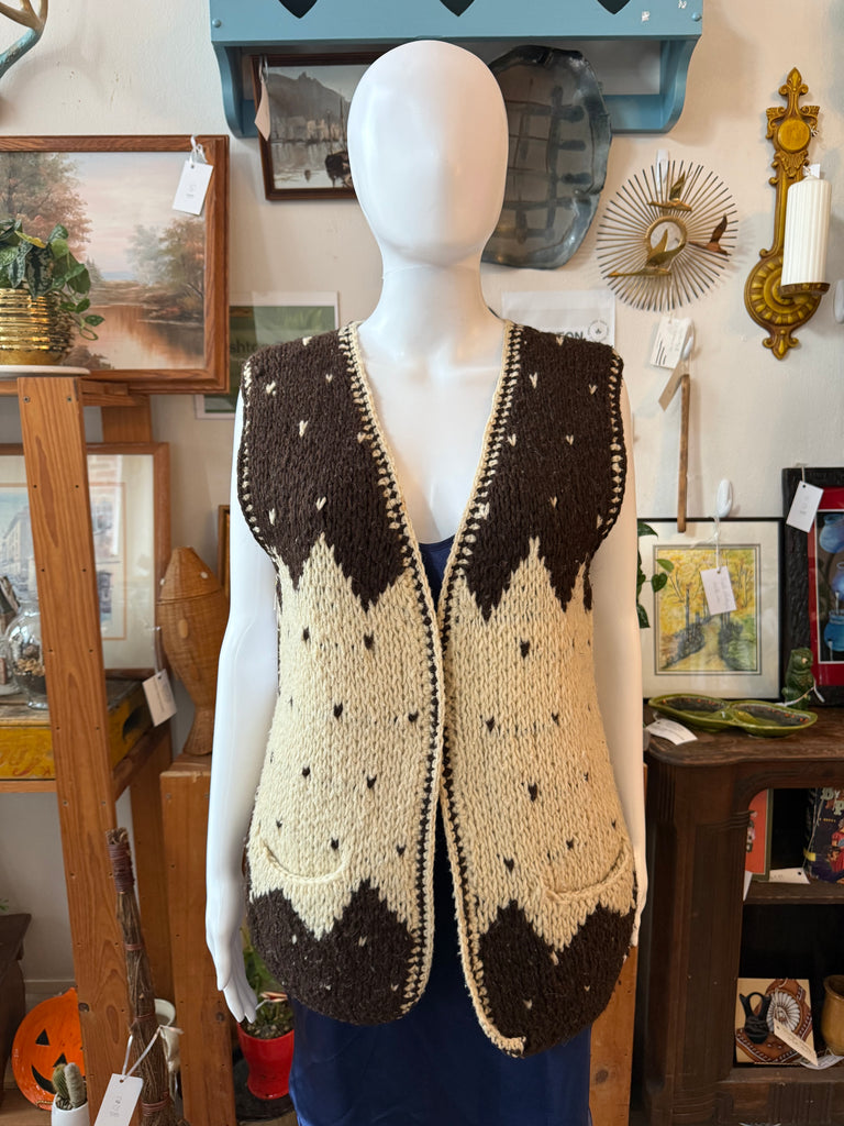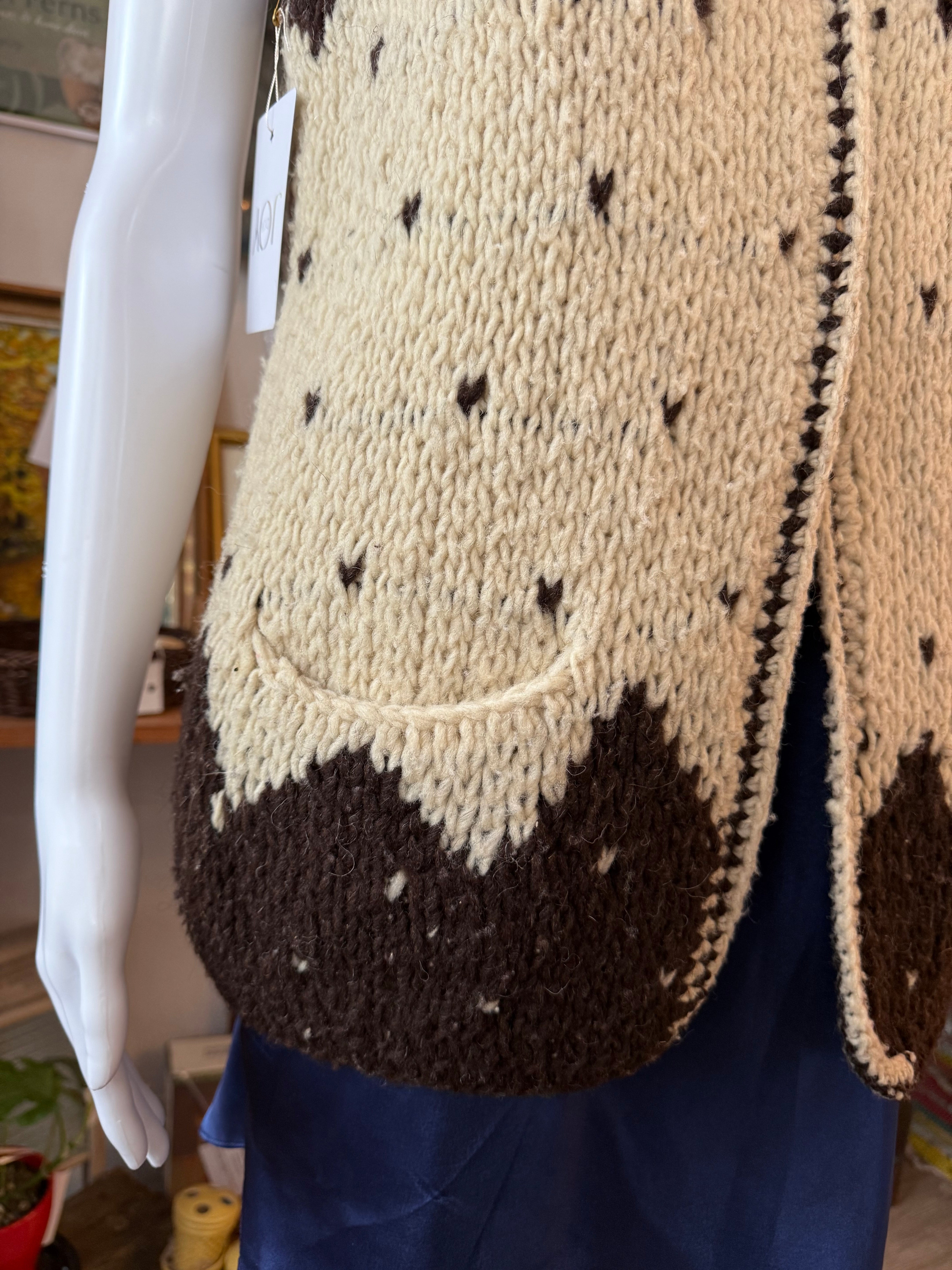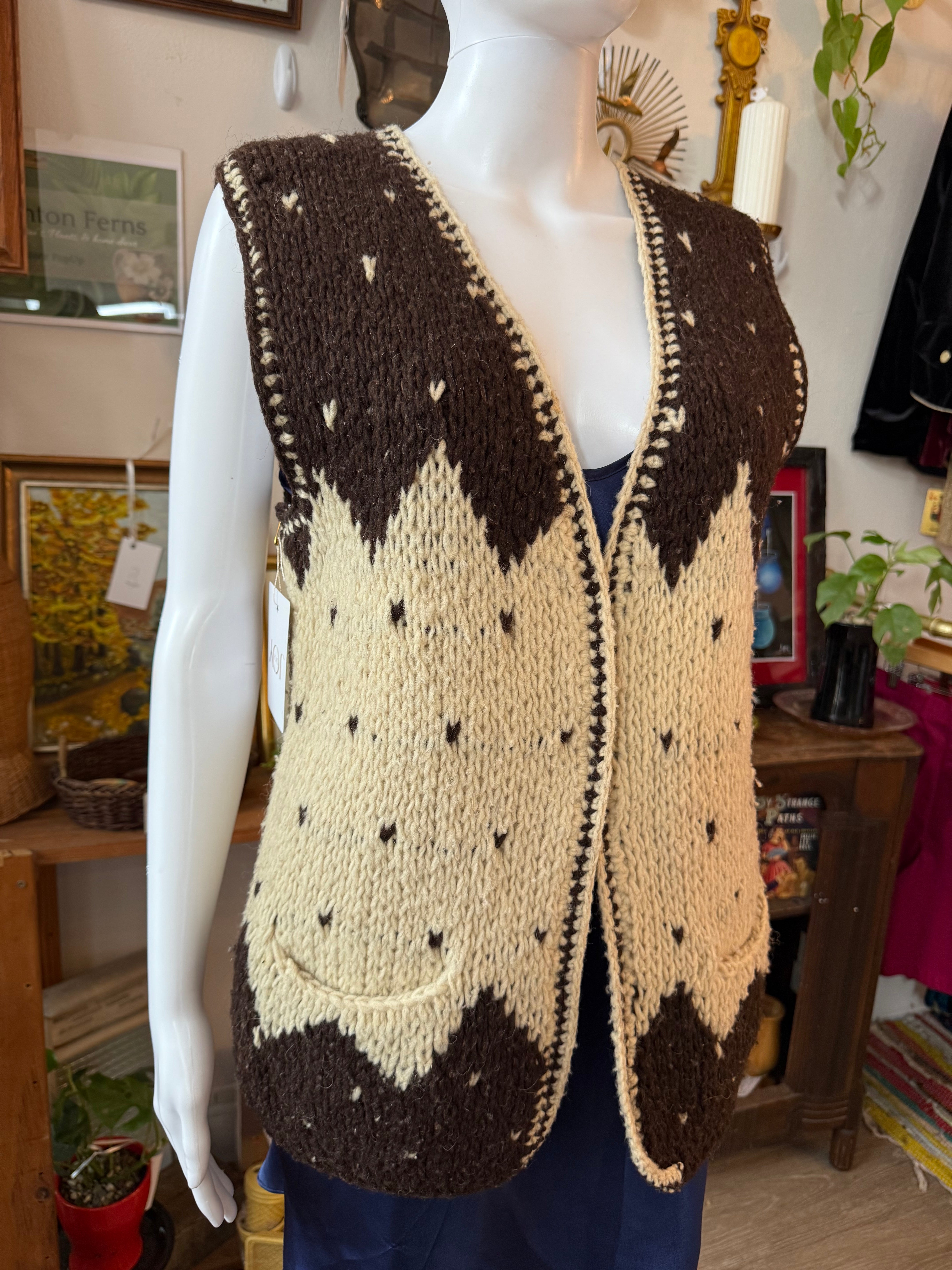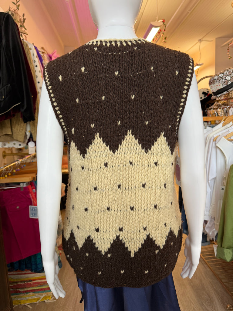 Cozy 1970s handmade open-front sweater vest in a chunky wool blend. Features a bold two-tone geometric zigzag pattern in dark brown and cream with small contrasting stitch details throughout. Designed without closures for a relaxed fit and finished with two front pockets and hand-crocheted trim.