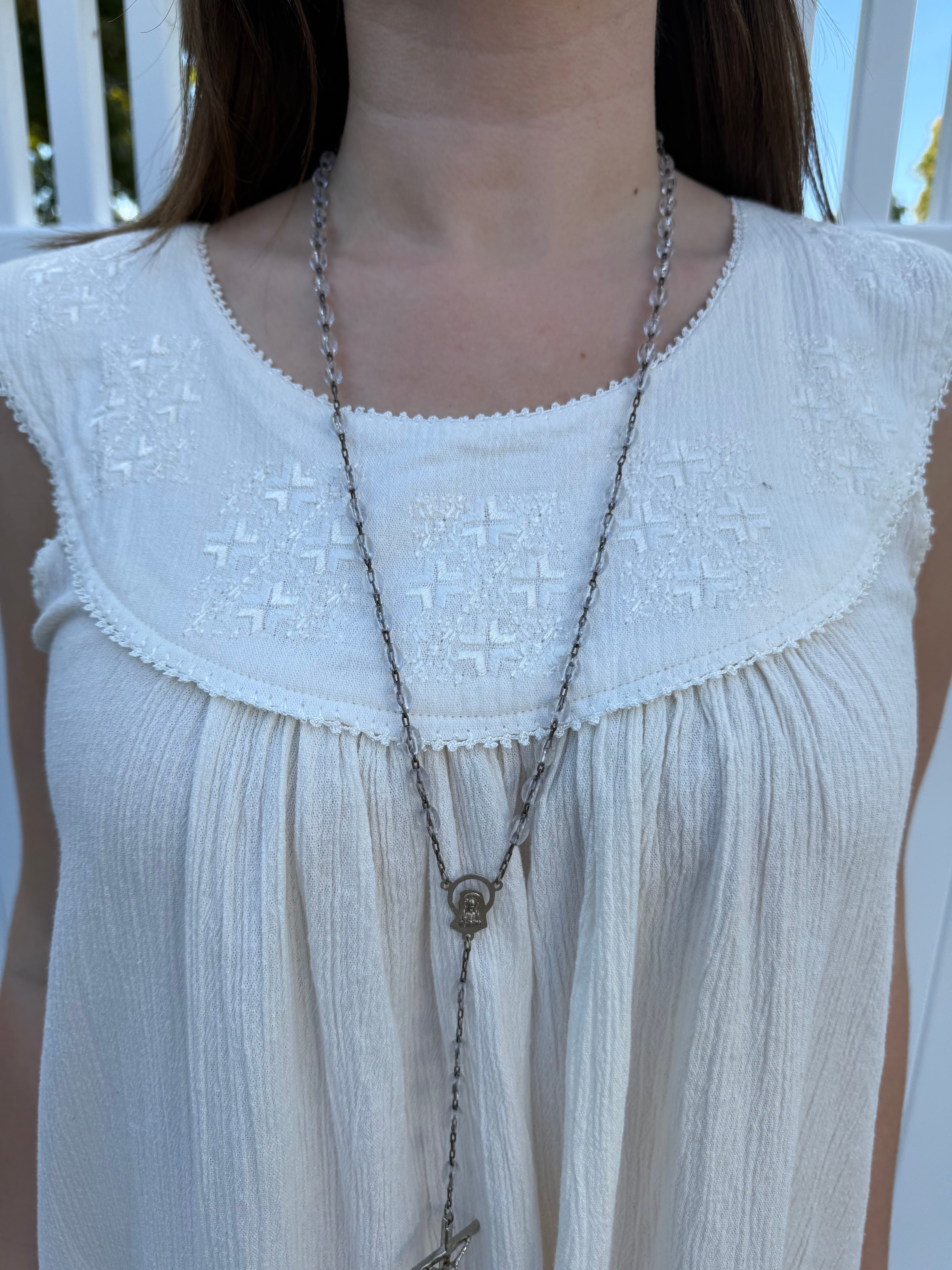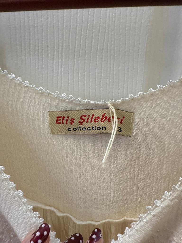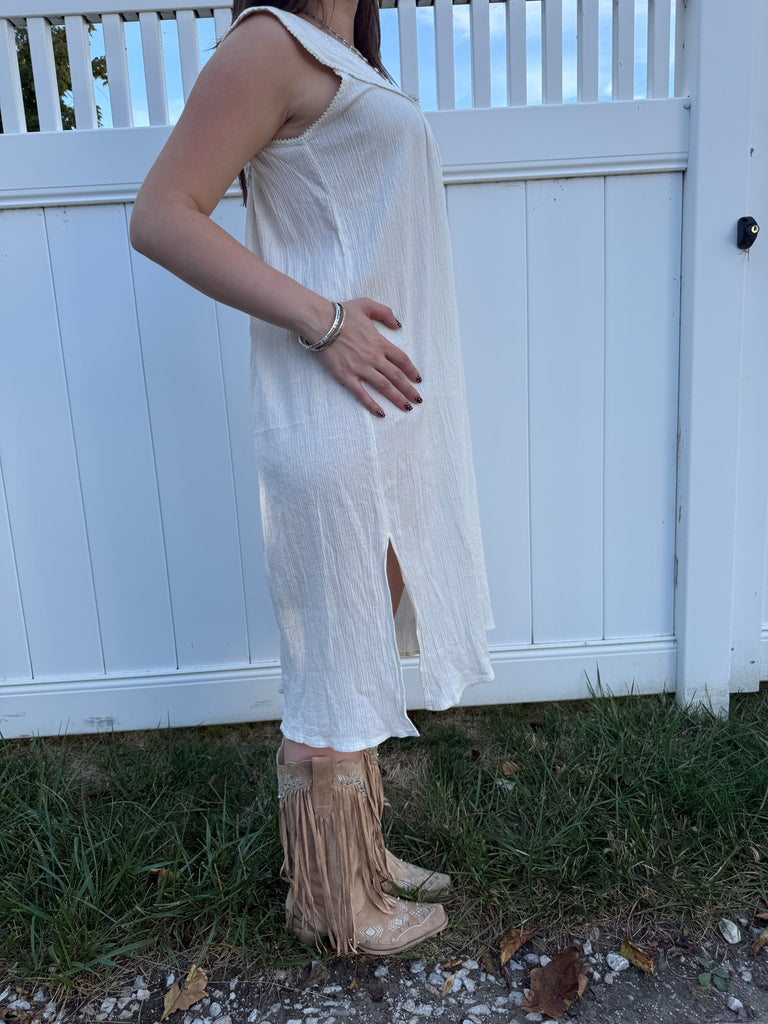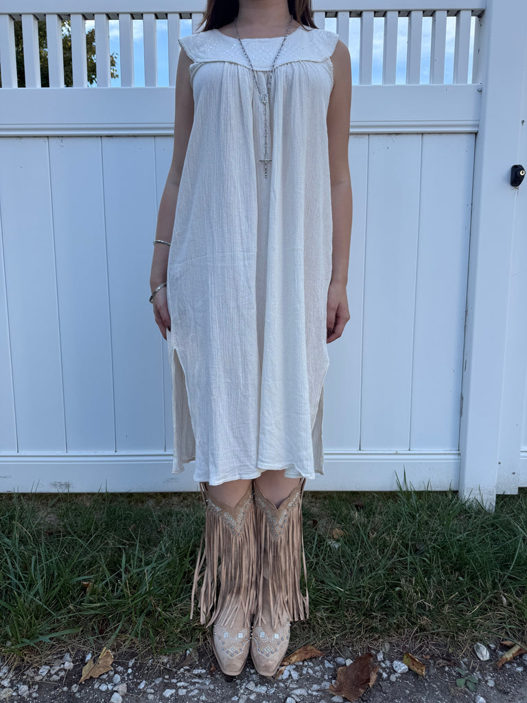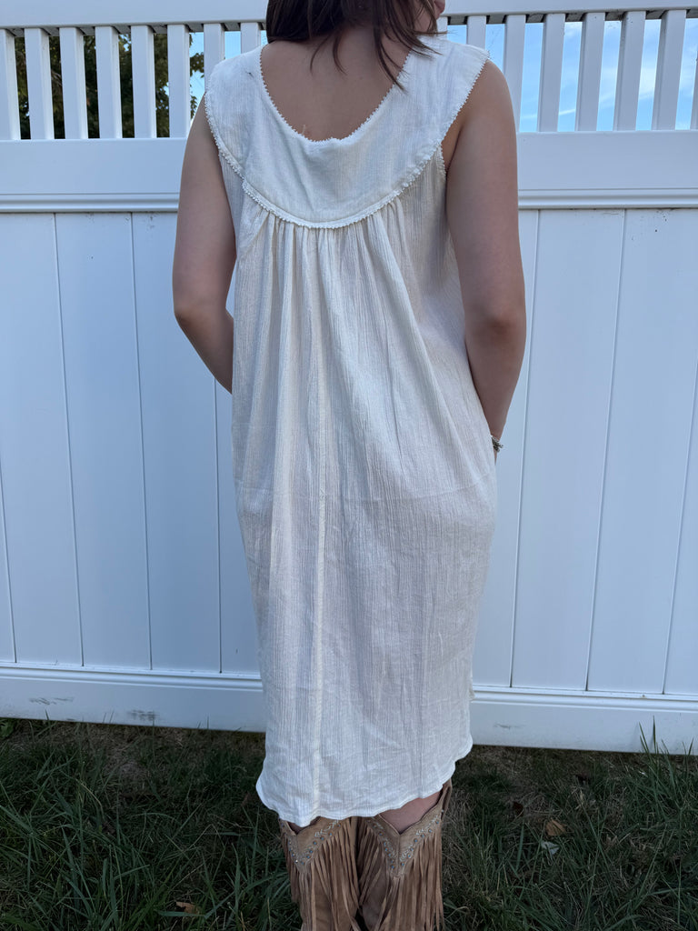 Romantic 1990s prairie-inspired dress by Elis Silebezi in soft ivory crinkle cotton. Features delicate Edwardian-style embroidery across the yoke, a rounded neckline, and relaxed sleeveless cut. The lightweight fabric falls effortlessly to a mid-length hem with subtle side slits for movement and flow.