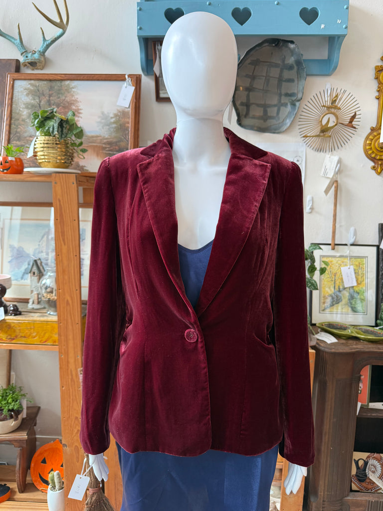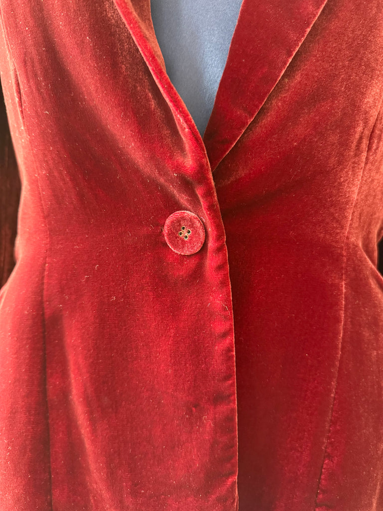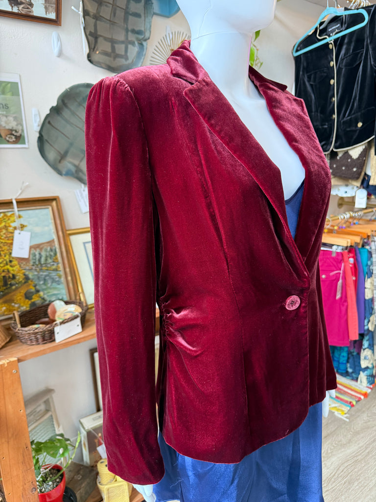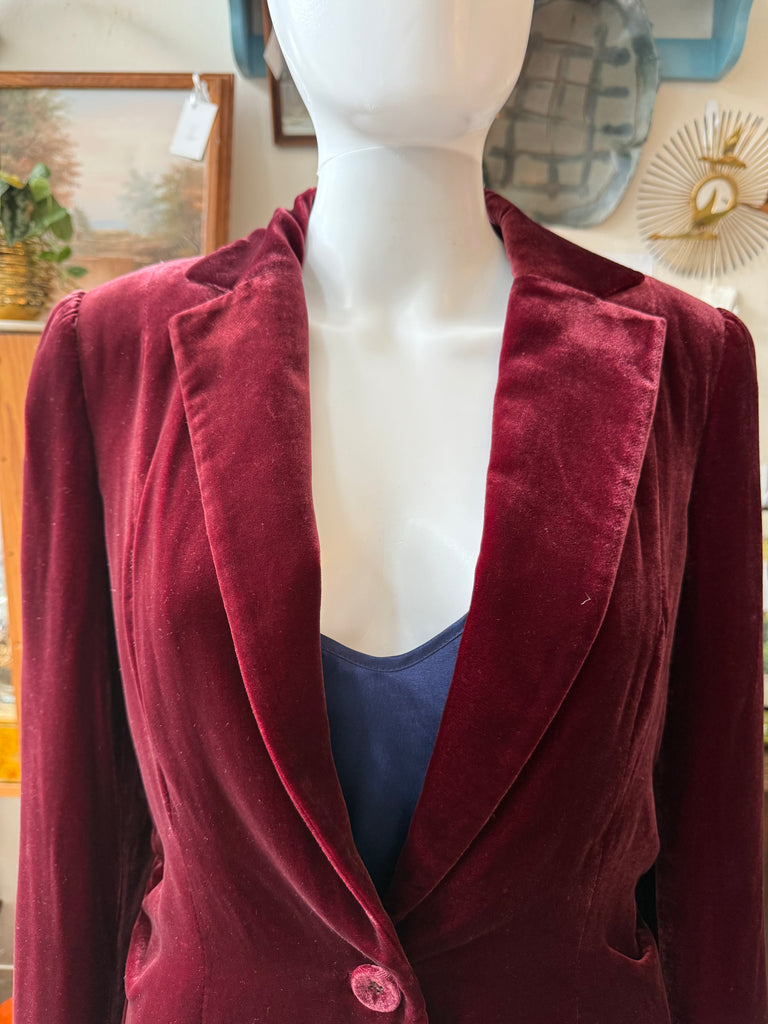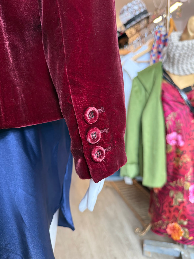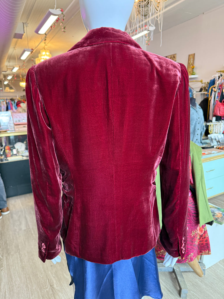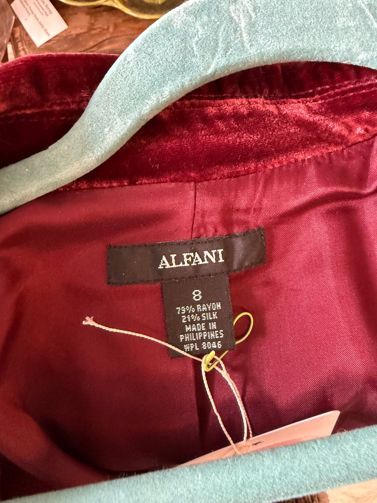 Elegant 1990s Alfani blazer in a rich wine-red velvet with a soft, lustrous finish. Features a deep V-neckline, single-button front closure, and subtle waist shaping for a sleek, tailored fit. Made from a luxurious 79% rayon and 21% silk blend with a fully lined interior. Button detailing at the cuffs completes the refined look.
