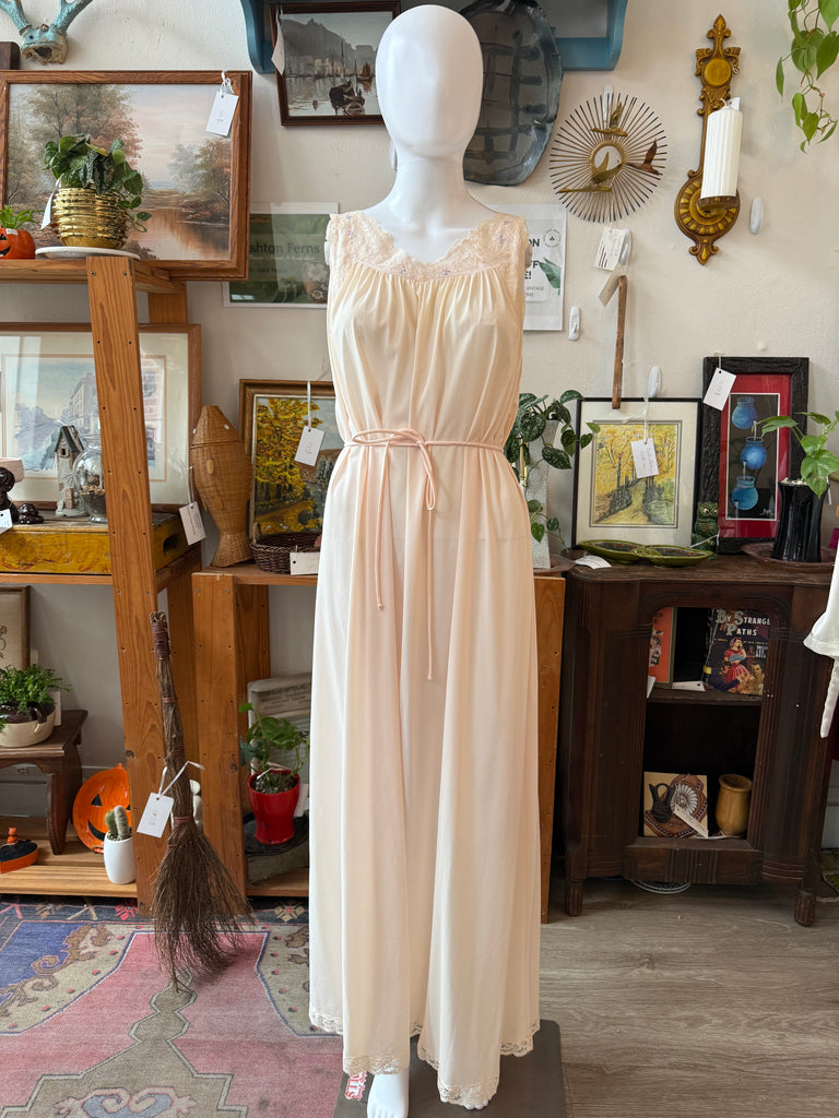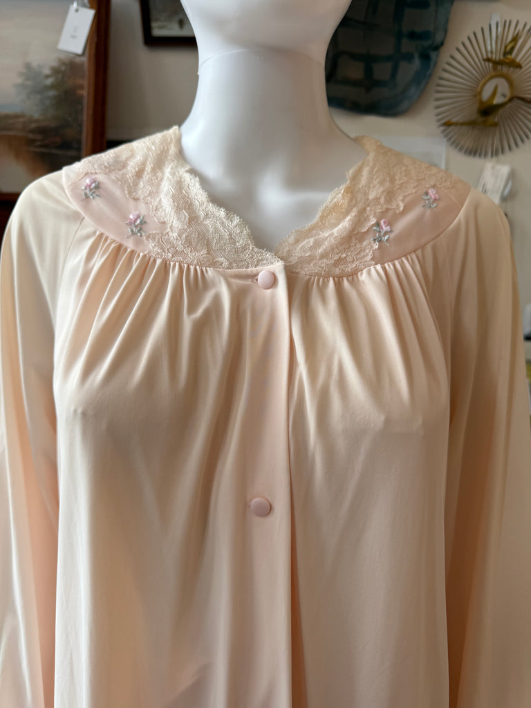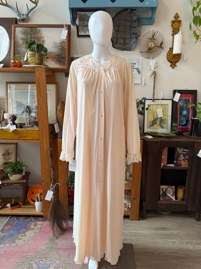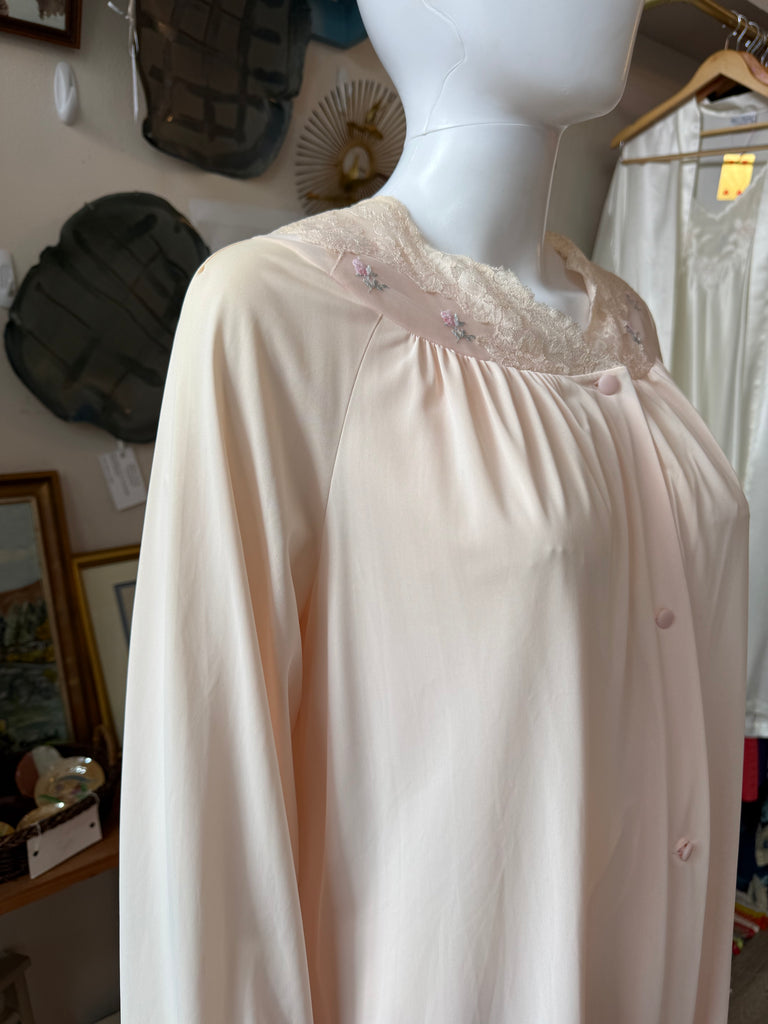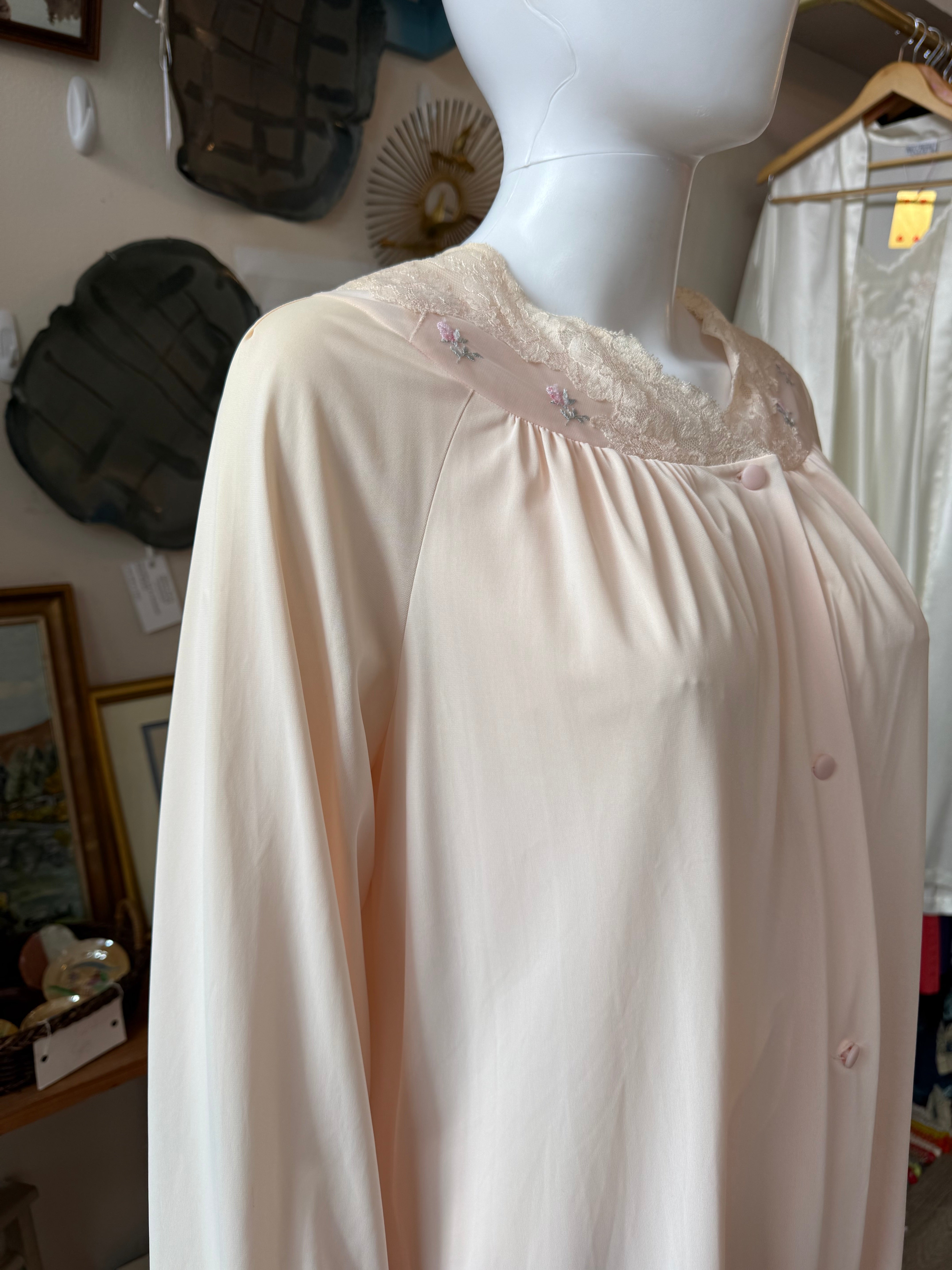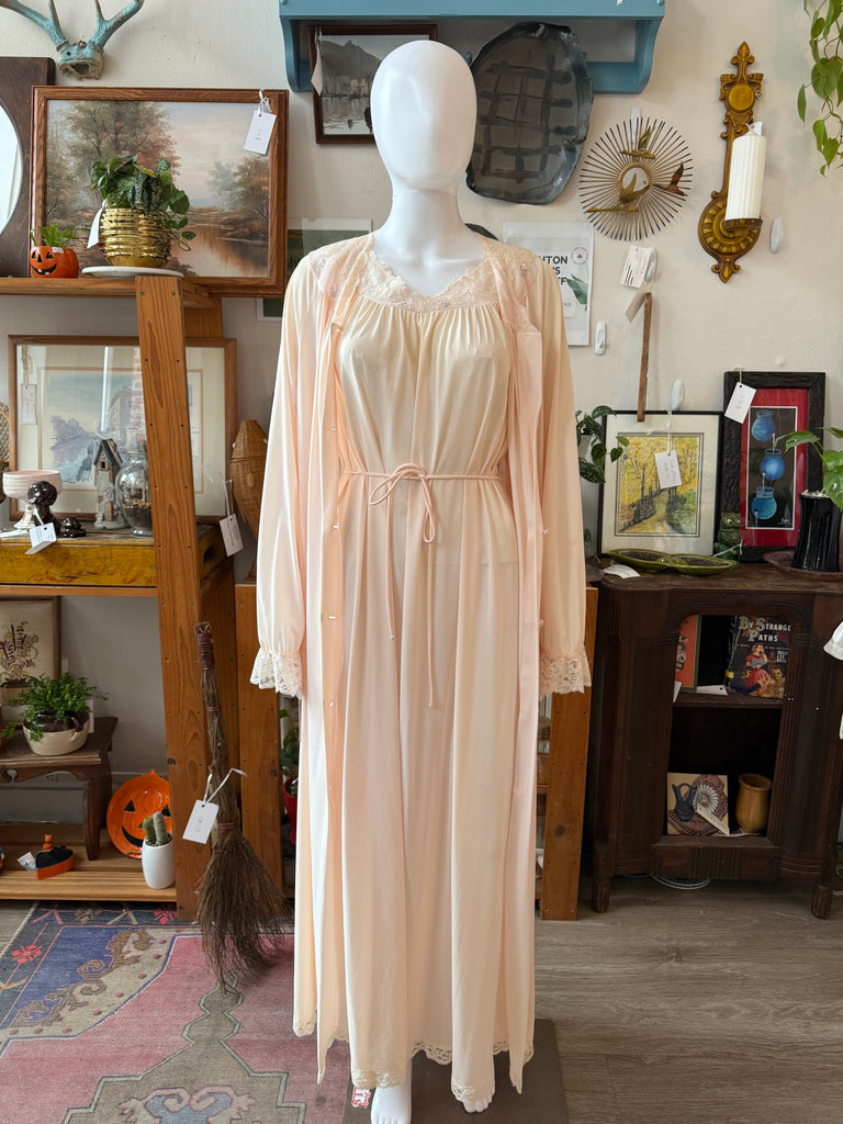 Elegant 1960s Shadowline two-piece nightgown set in soft, peach-toned nylon with a satin-like sheen. Includes a sleeveless maxi slip with delicate floral lace trim and embroidered accents, paired with a long-sleeve matching robe. The robe features covered button closures down the front, lace-trimmed cuffs and hem, and a graceful drape. The slip ties at the waist for a flattering fit and gentle gather at the bust.