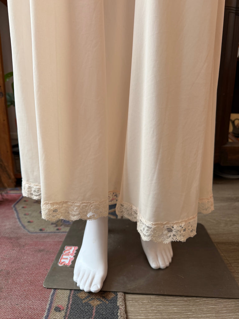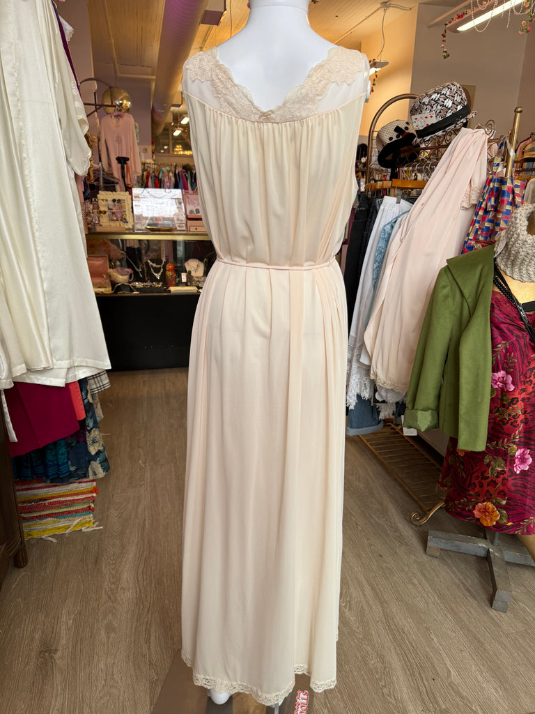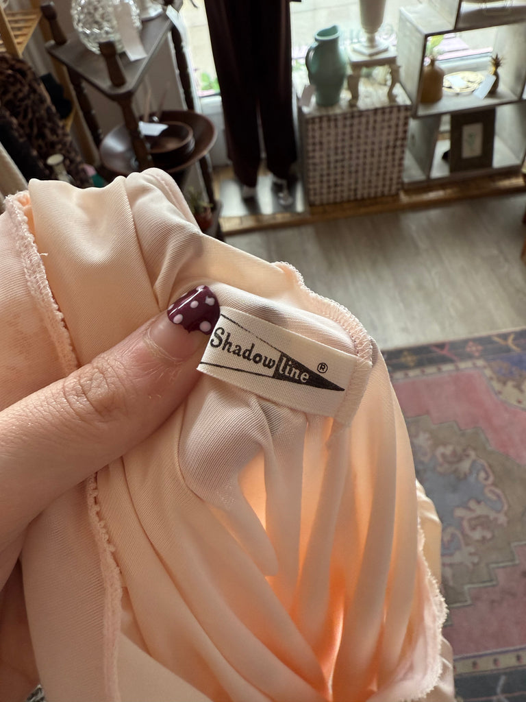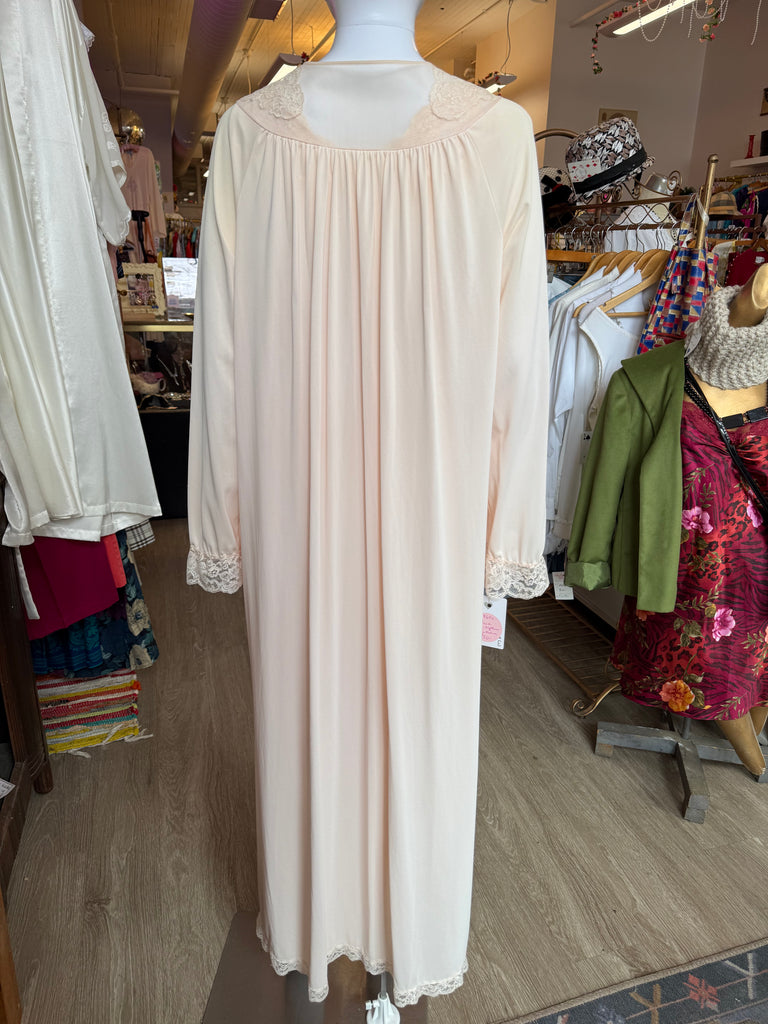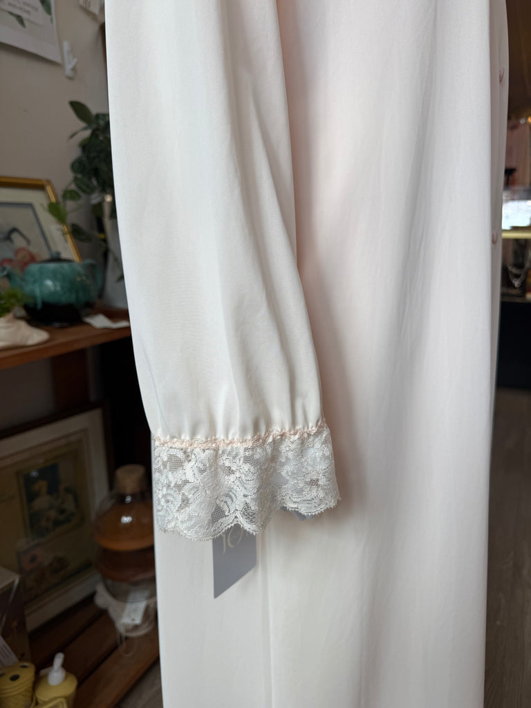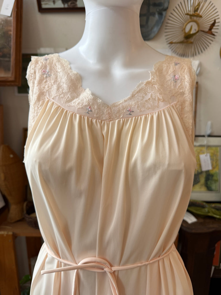 Elegant 1960s Shadowline two-piece nightgown set in soft, peach-toned nylon with a satin-like sheen. Includes a sleeveless maxi slip with delicate floral lace trim and embroidered accents, paired with a long-sleeve matching robe. The robe features covered button closures down the front, lace-trimmed cuffs and hem, and a graceful drape. The slip ties at the waist for a flattering fit and gentle gather at the bust.