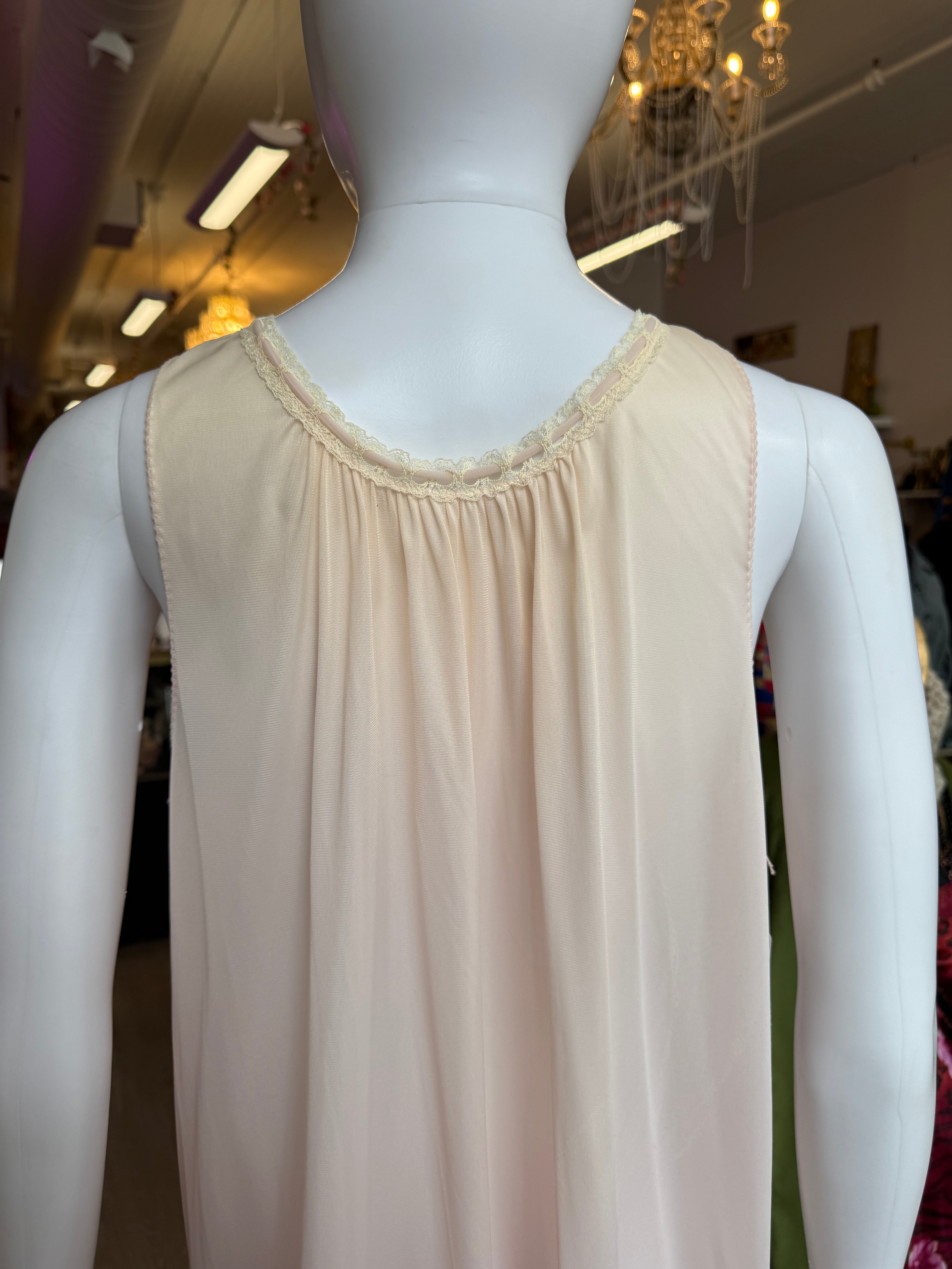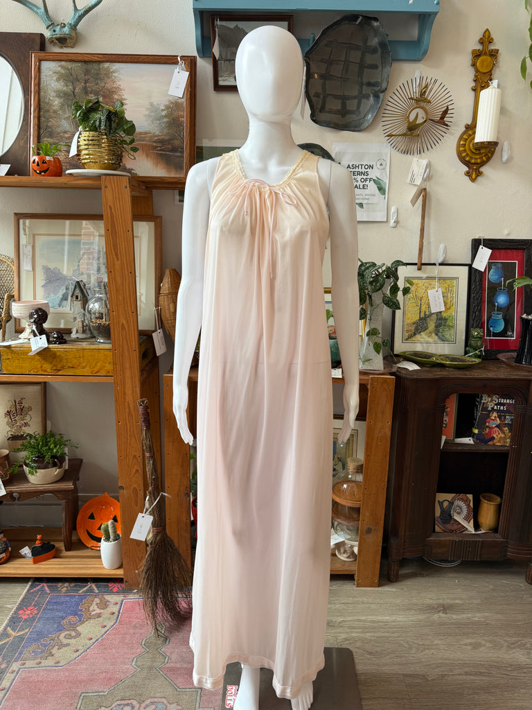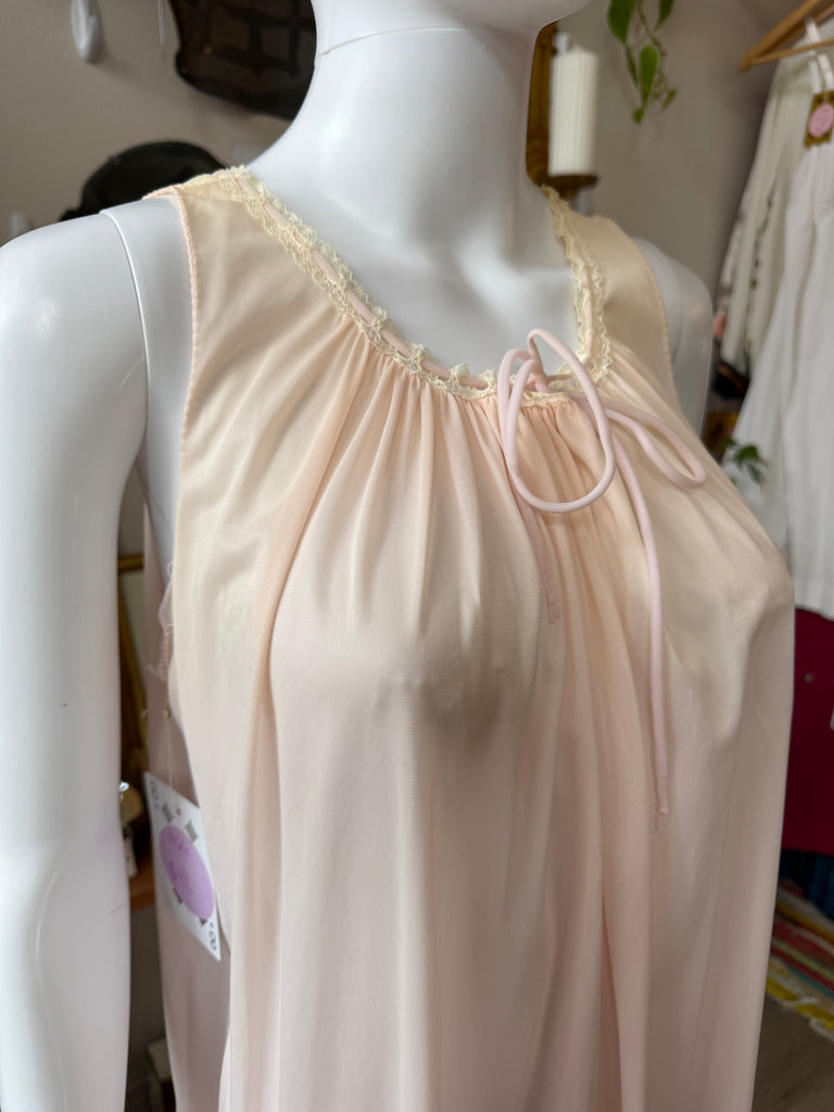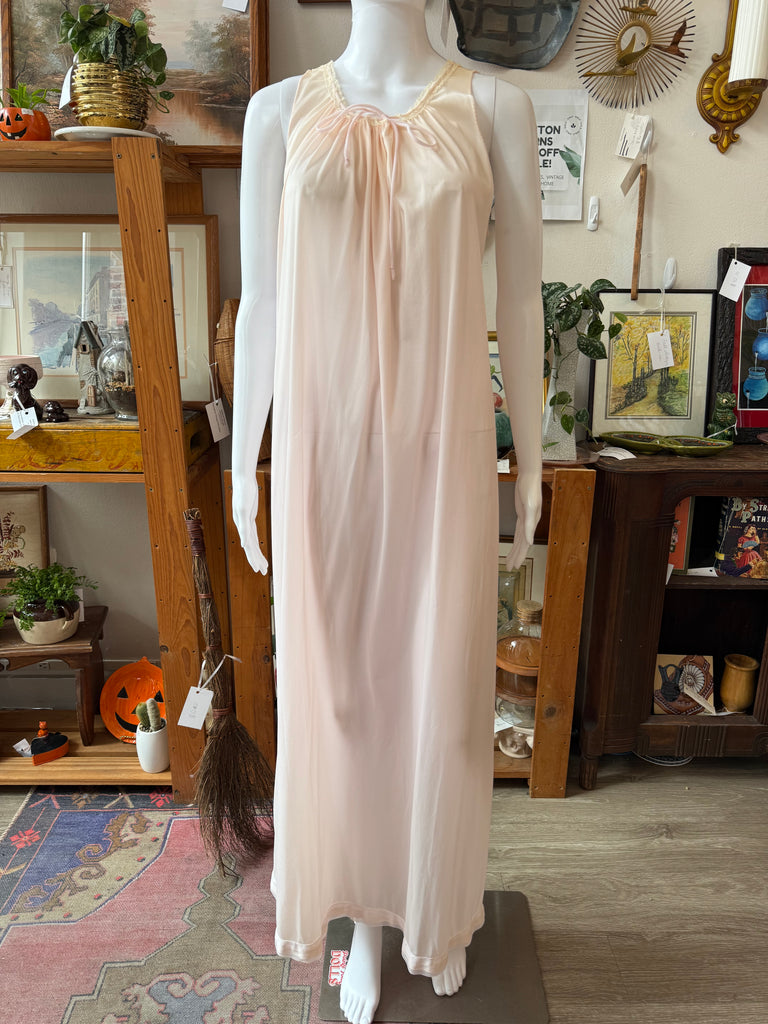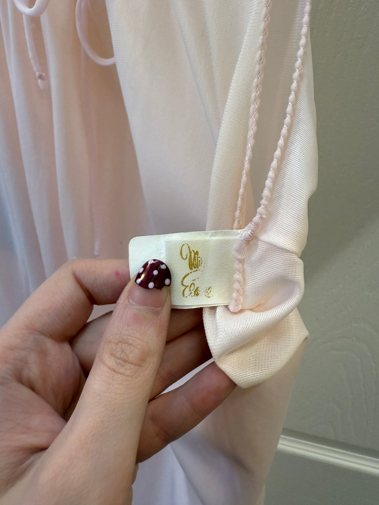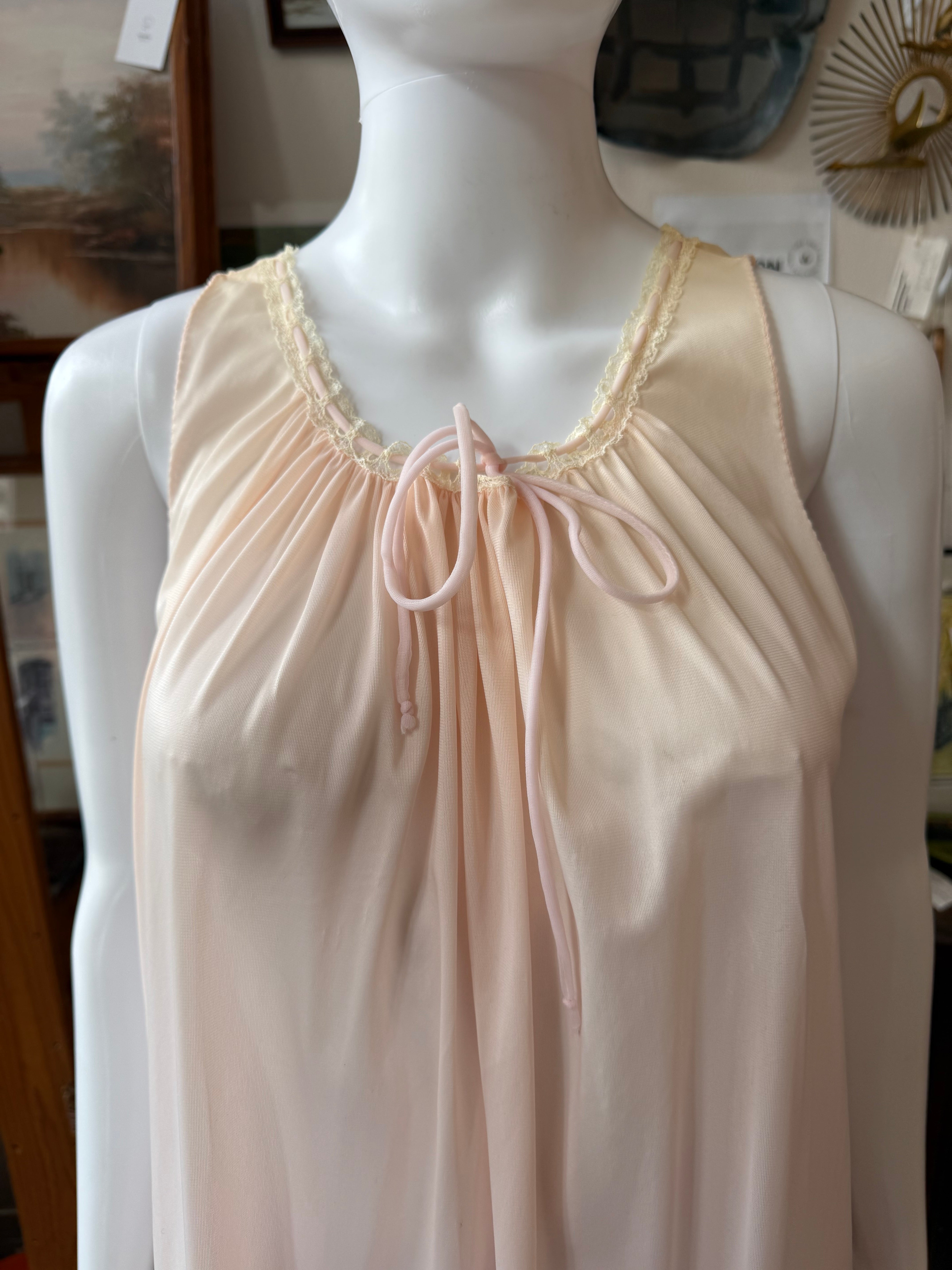 Soft and feminine vintage 1960s Miss Elaine nightgown in a delicate baby pink hue. Made from lightweight nylon with a silky drape and semi-sheer flow. Features lace-edged trim along the neckline, a gathered bust with adjustable bow tie, and full-length hemline with subtle sheen. The material feels smooth and breathable, ideal for lounging or layering.