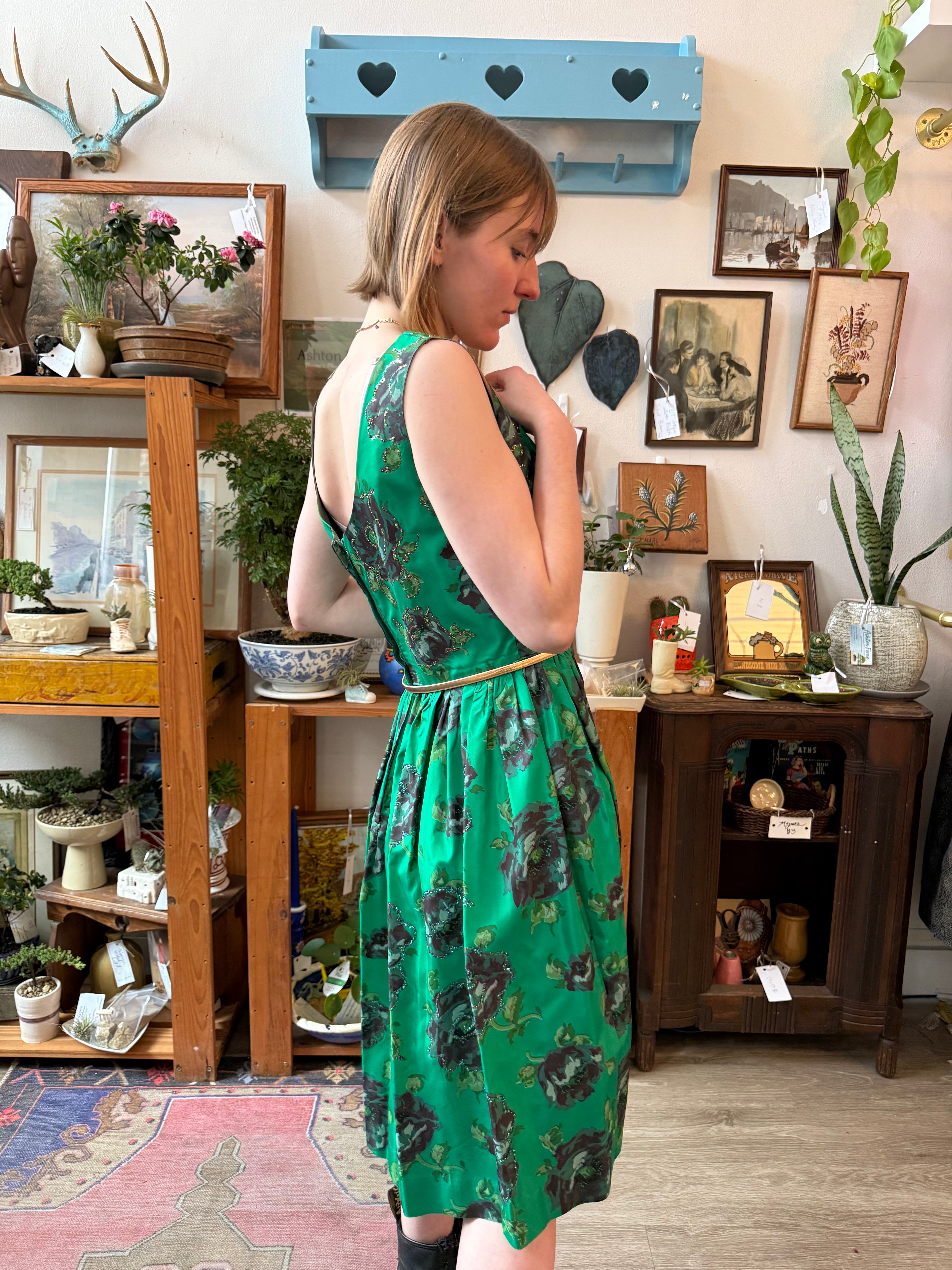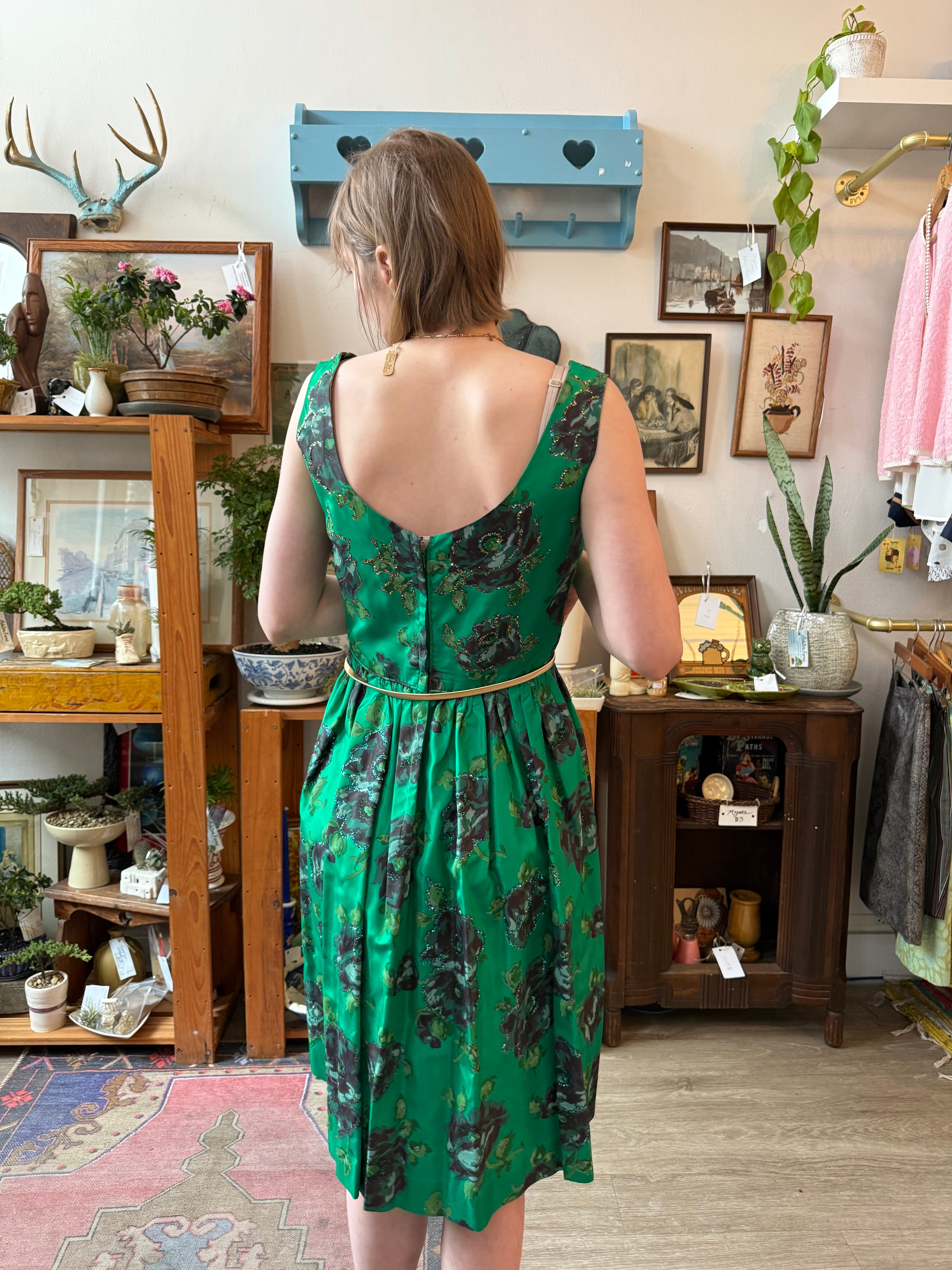1950s Emerald Green Taffeta Floral Sequin Dress