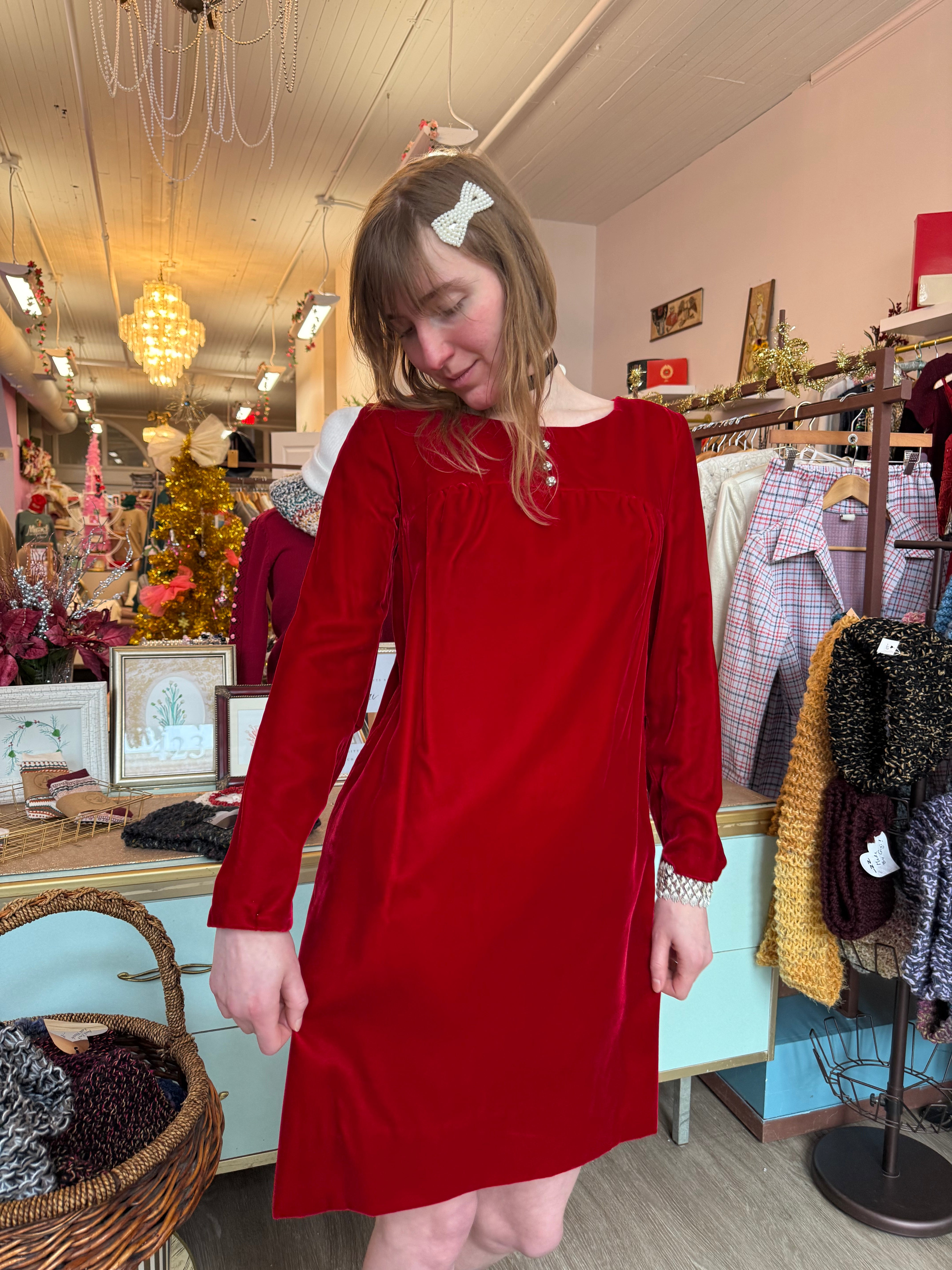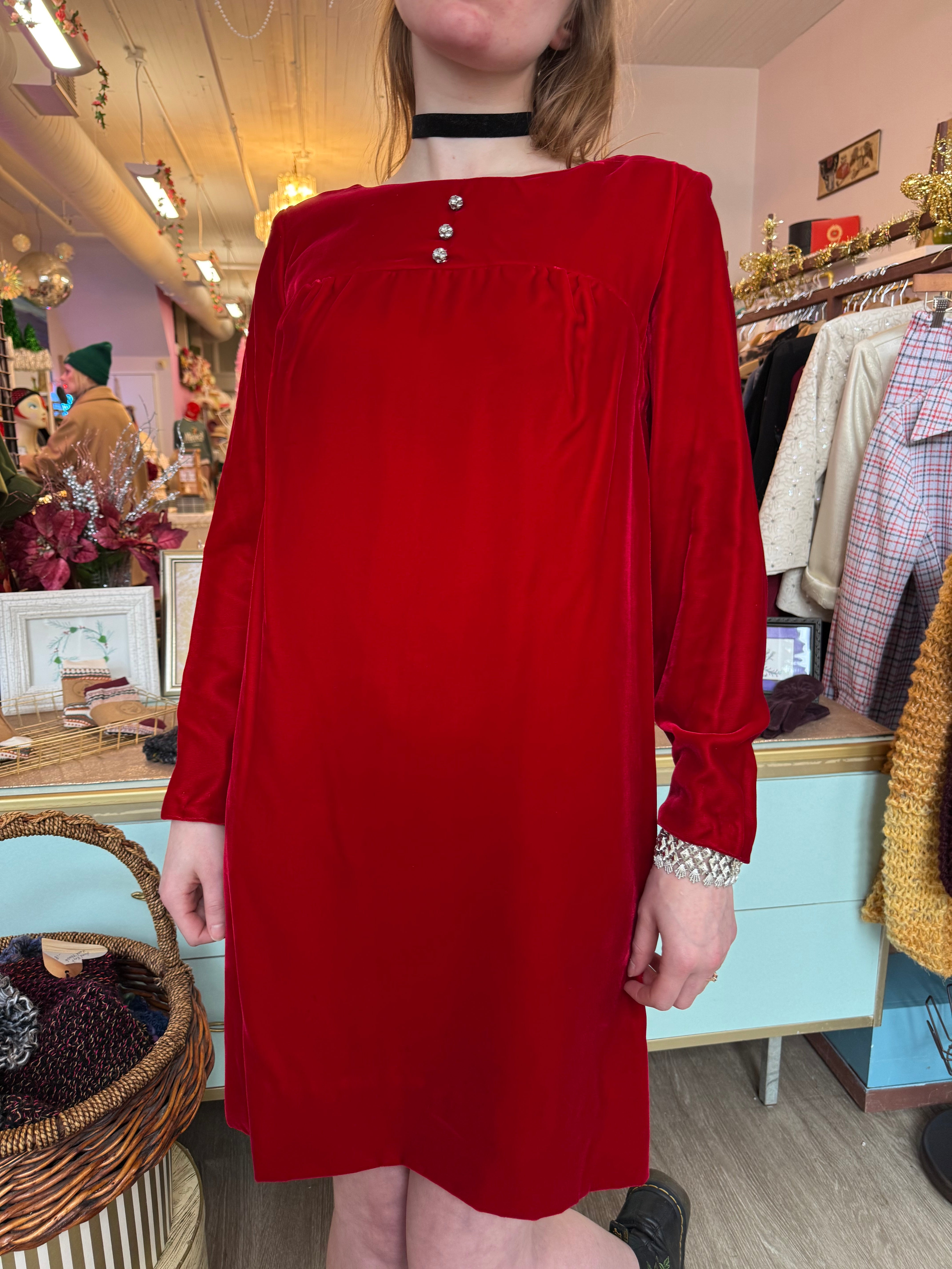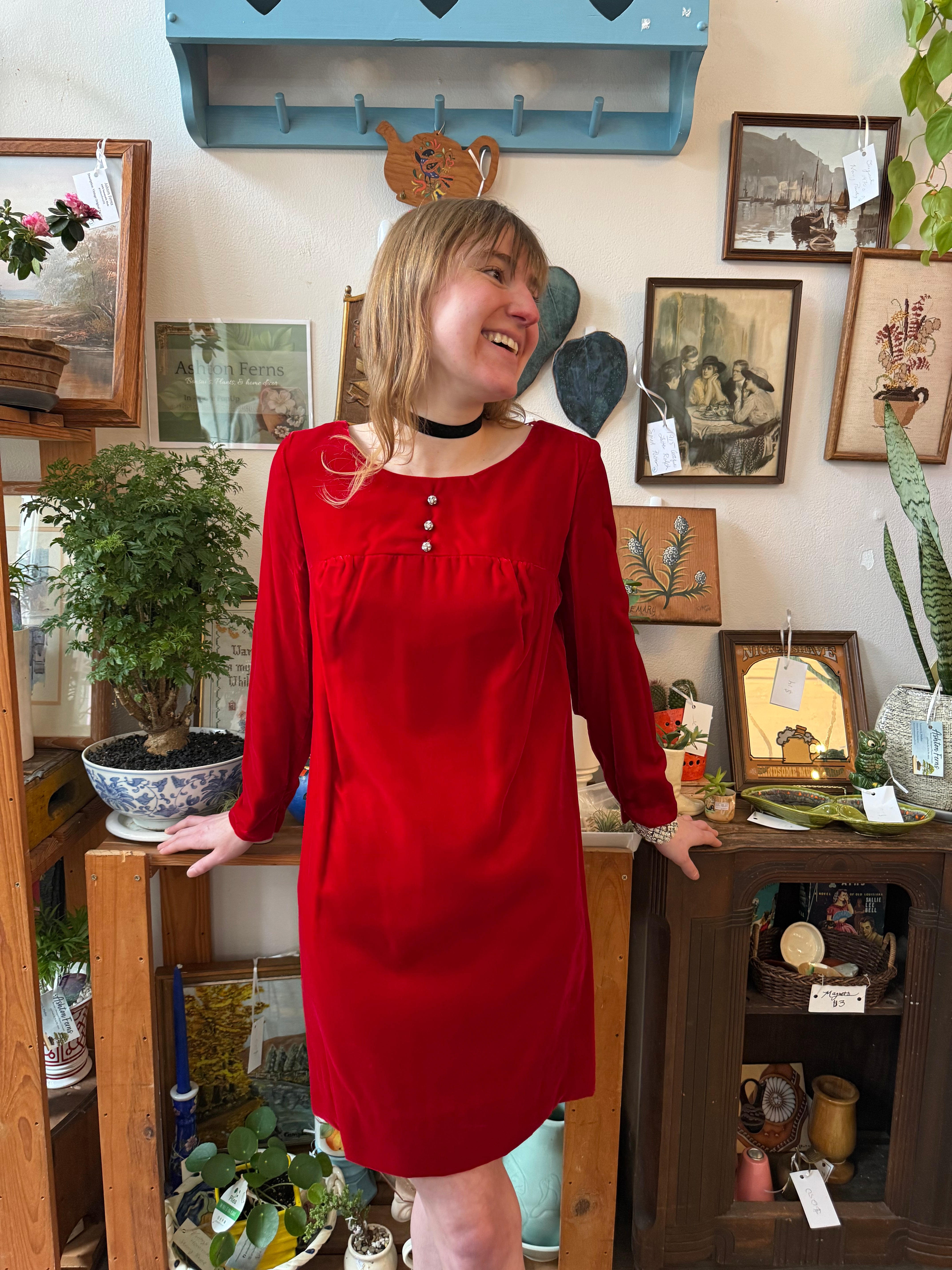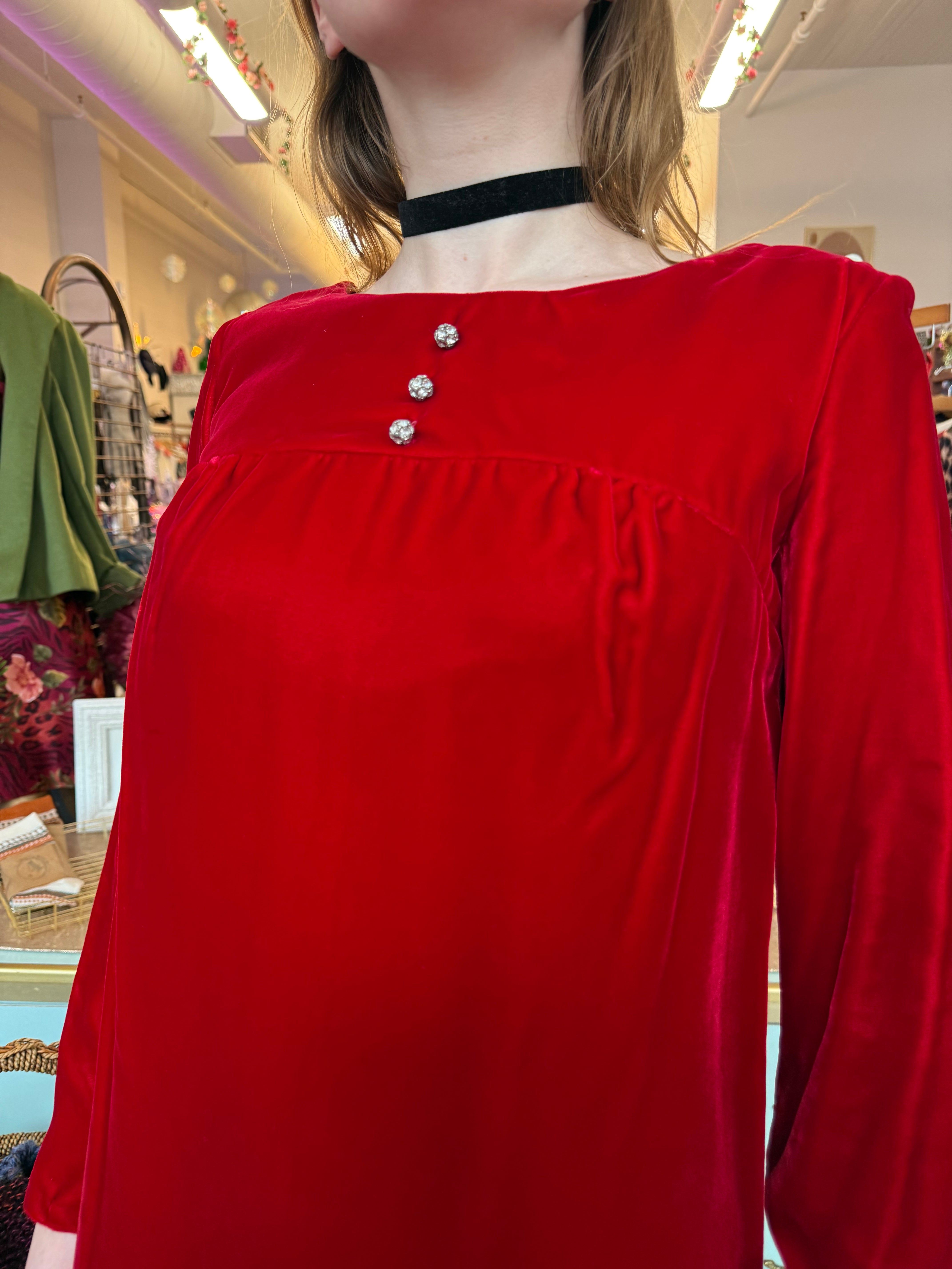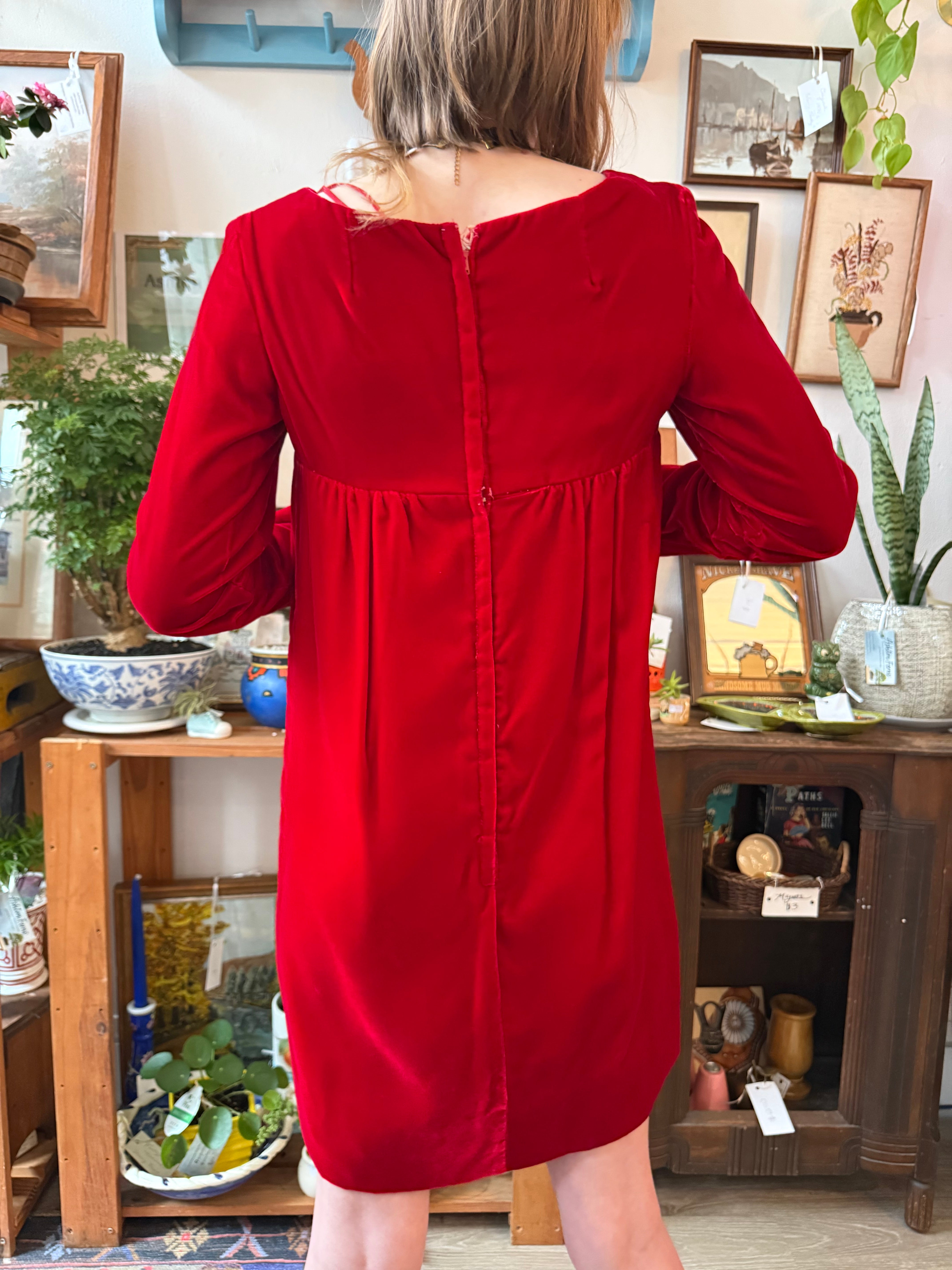 Striking vintage 1960s red velvet mini dress with a classic mod silhouette. Features a soft velvet body in a rich true red, long sleeves with a gentle drape, and a slightly raised empire-style seam that gives it that iconic mid-century shape. The front is finished with subtle decorative buttons at the neckline, while the back has a full zipper with hook & eye closure for easy wear. Likely handmade with no original tag. Fabric has a smooth velvet feel with no stretch. Unlined and lightweight for velvet, making it great for cooler seasons or holiday wear. No size tag present - please refer to measurements below for best fit.