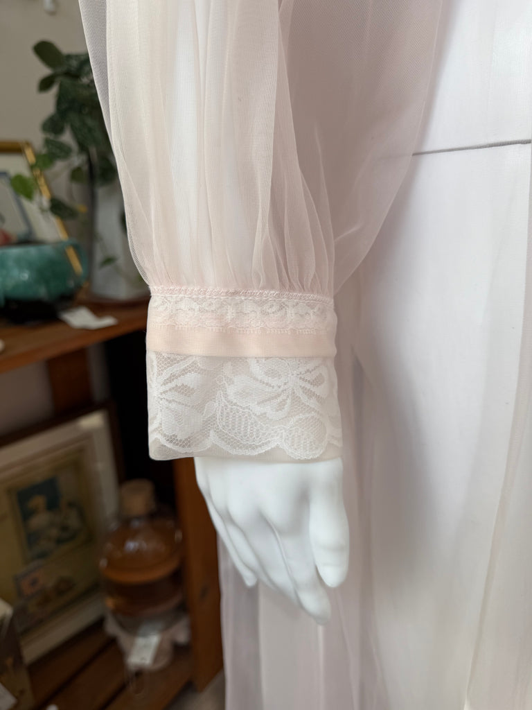 Ethereal 1960s pale pink chiffon nightgown robe featuring a sheer layered design with voluminous puff sleeves and delicate lace trim at the cuffs and neckline. The body drapes effortlessly with soft gathers along the neckline, flowing into a full-length silhouette. Fastens at the bust with a single hook-and-eye closure and trimmed in matching satin ribbon and lace along the front opening.