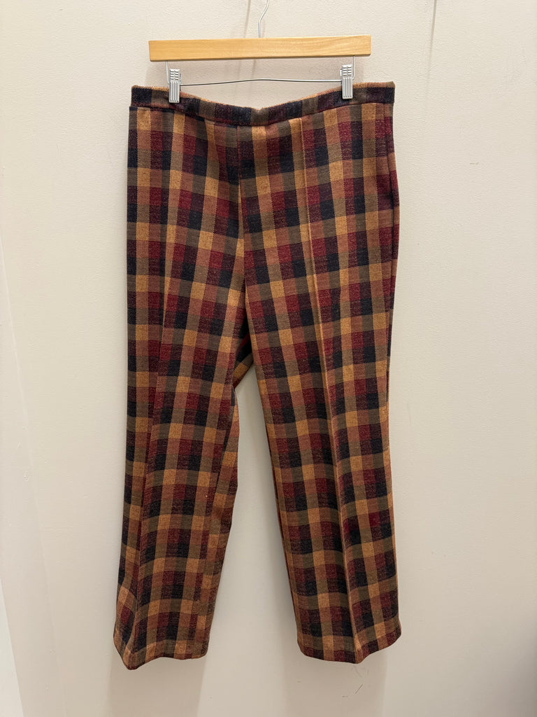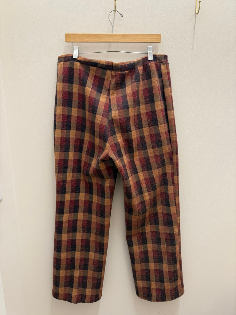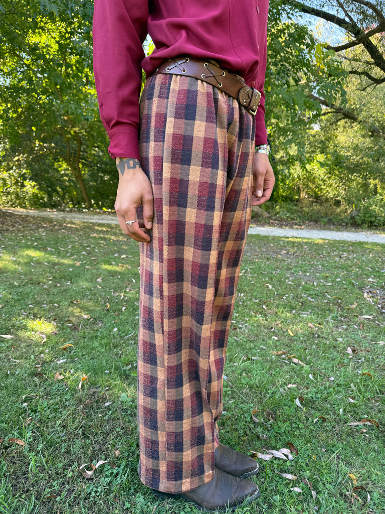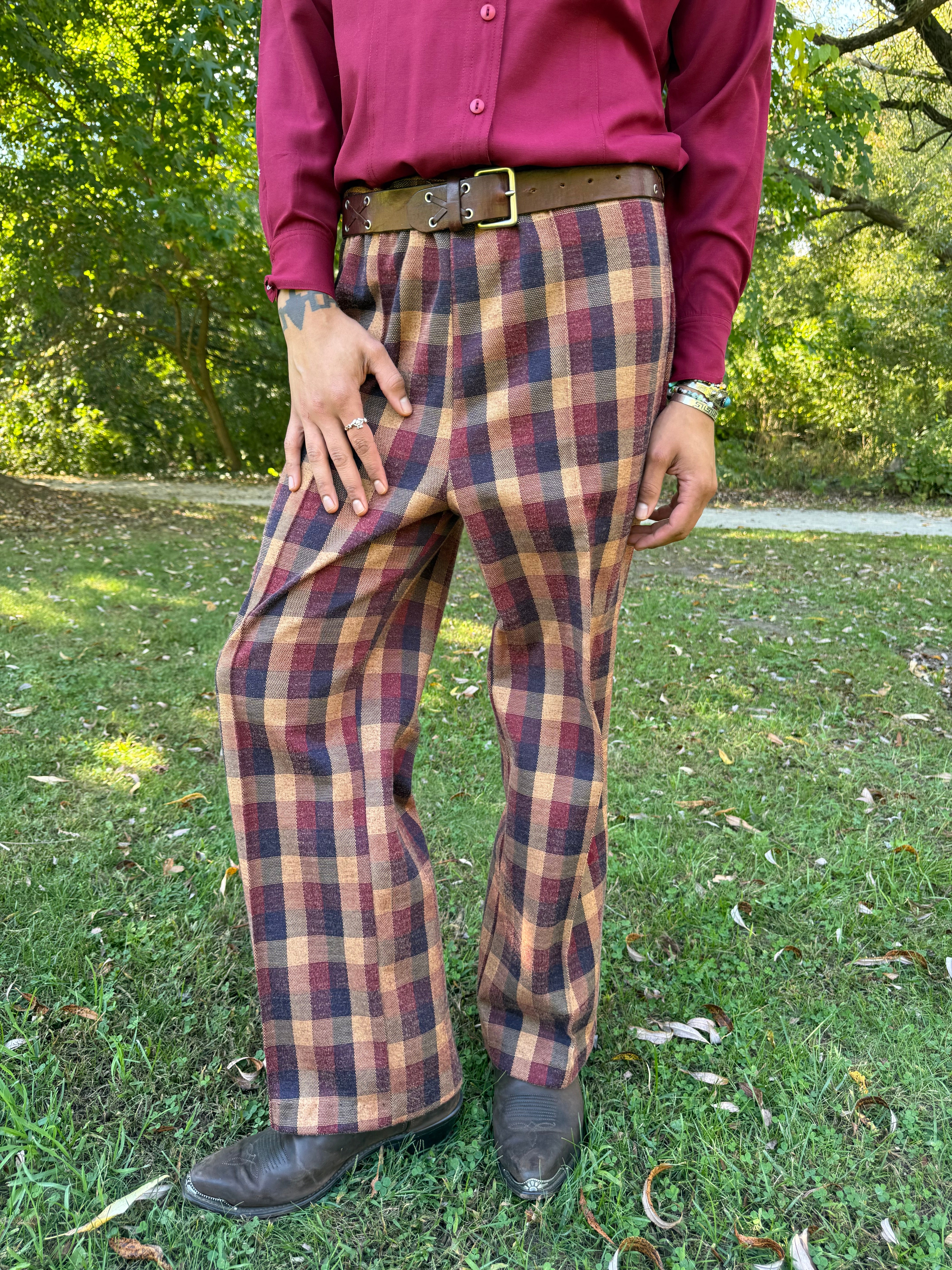 Warm-tone check pull-on trousers from the 1970s in tan camel, rust brown, and darl burgundy. Tailored straight leg with a clean waistband and classic high rise - perfect with chunky knits and boots. No brand/content tag; fabric feels like a wool blend (likely wool/nylon or wool/acrylic). Dry clean recommended. Unisex fit.