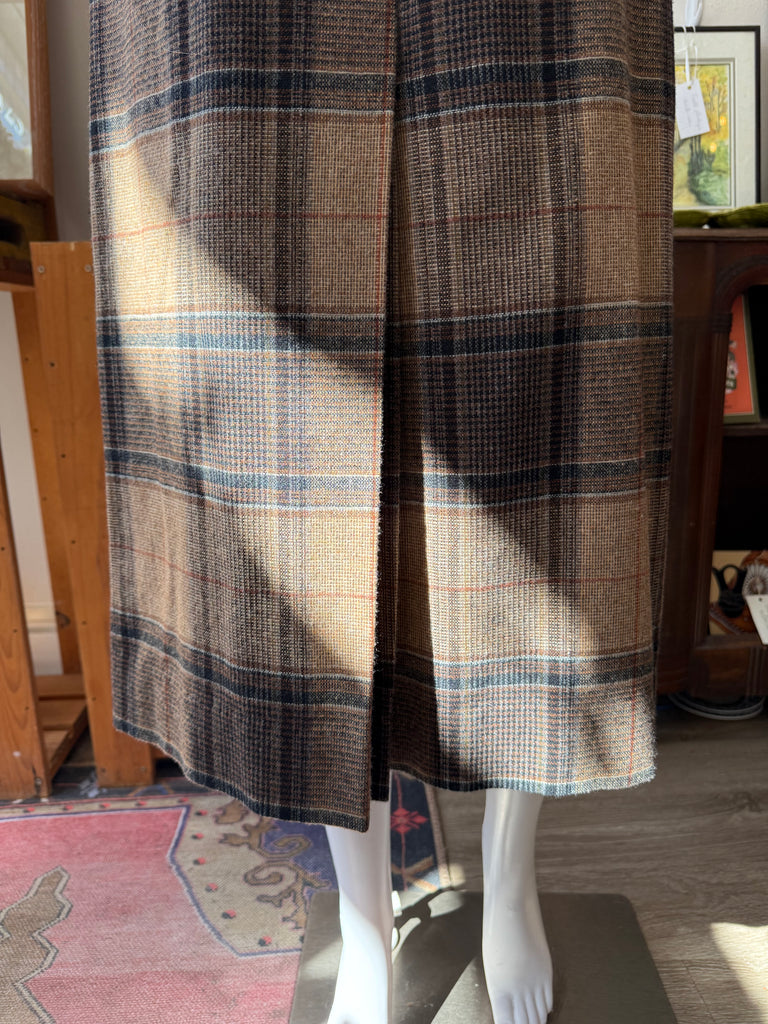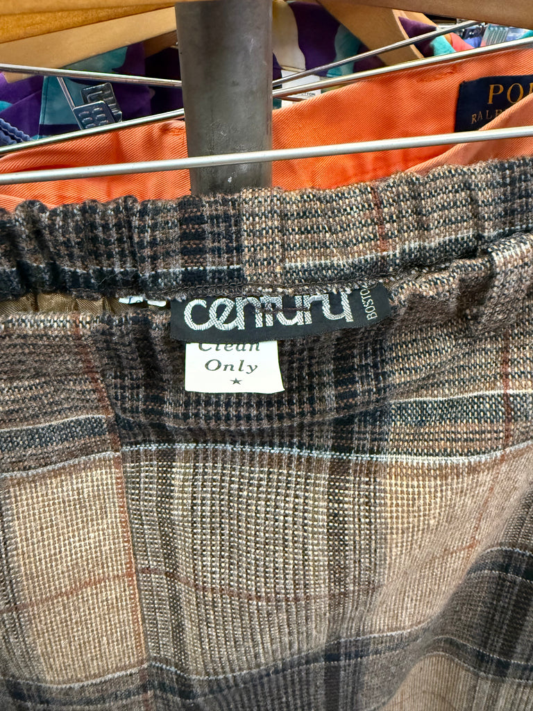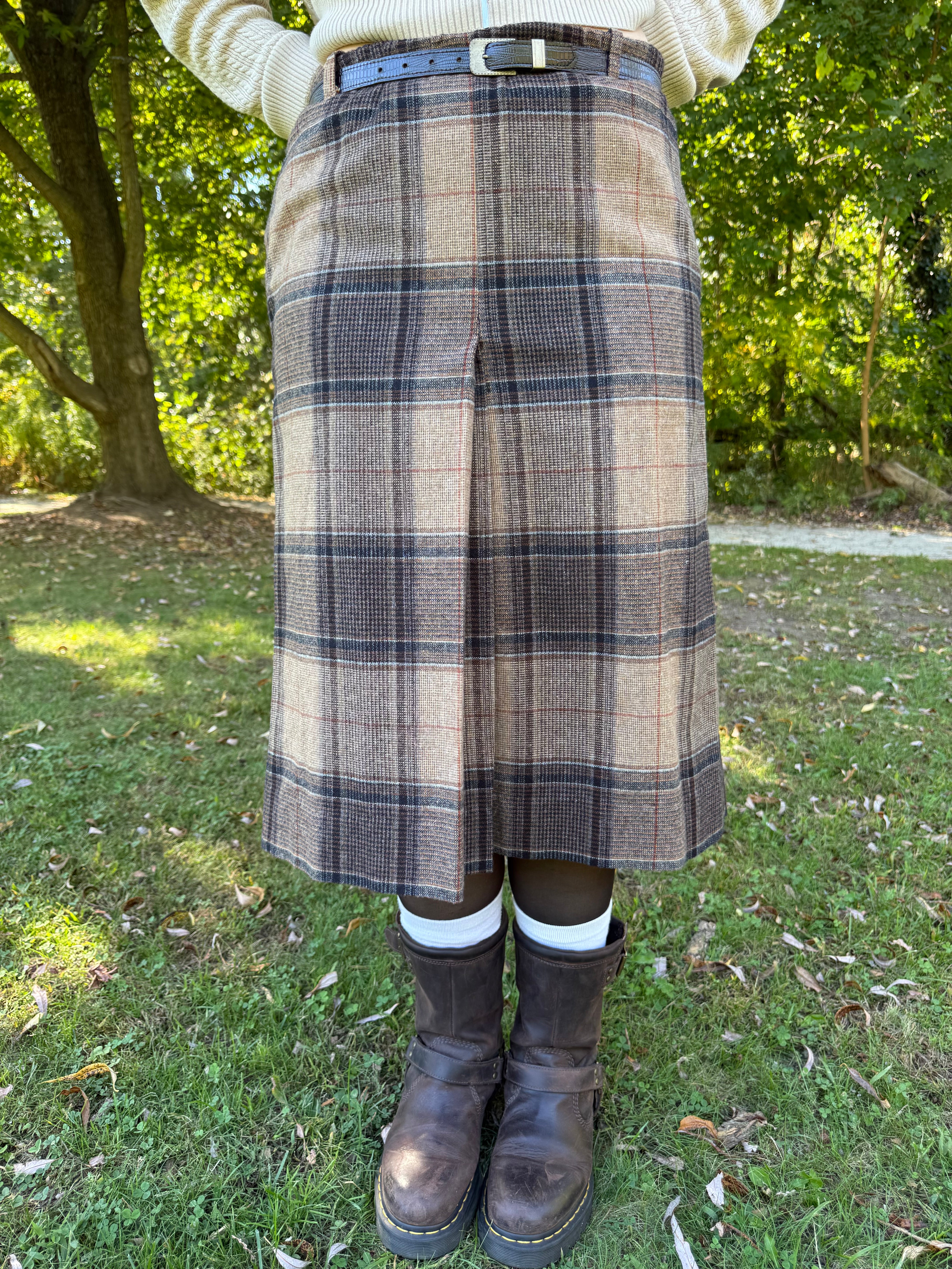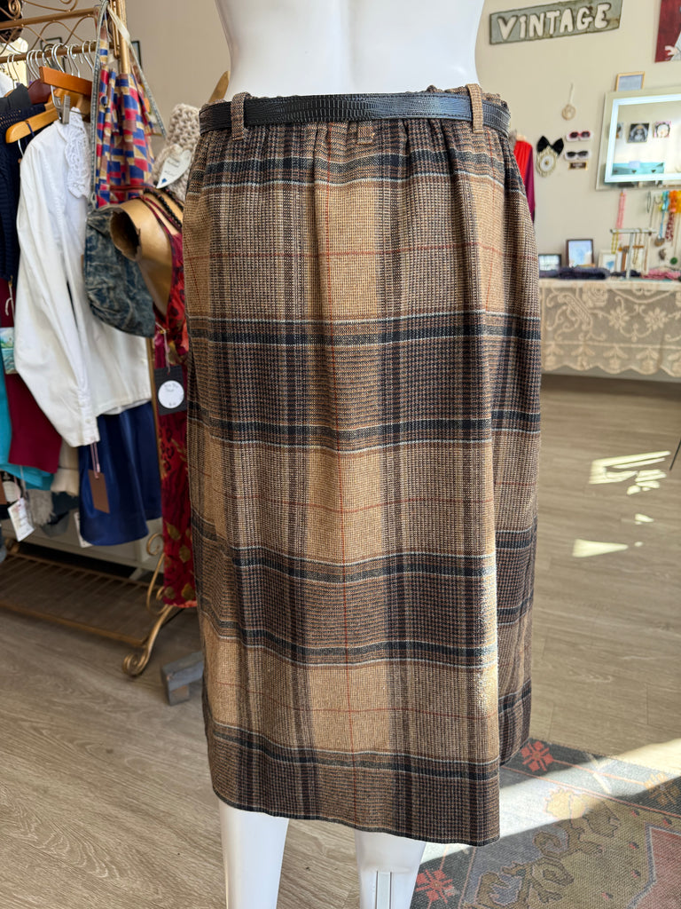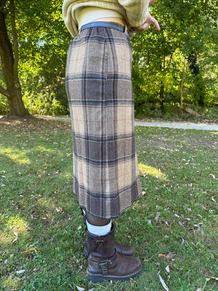Classic vintage union-made plaid skirt from Century Boston, circa 1970s. High-waisted, fully lined, and finished with a matching covered-buckle belt and belt loops. Rich tweed plaid in tan camel, espresso brown, and charcoal (with subtle rust/blue notes) pairs perfectly with knits and boots. Union tag present. Labeled size 12 - please see measurements.
