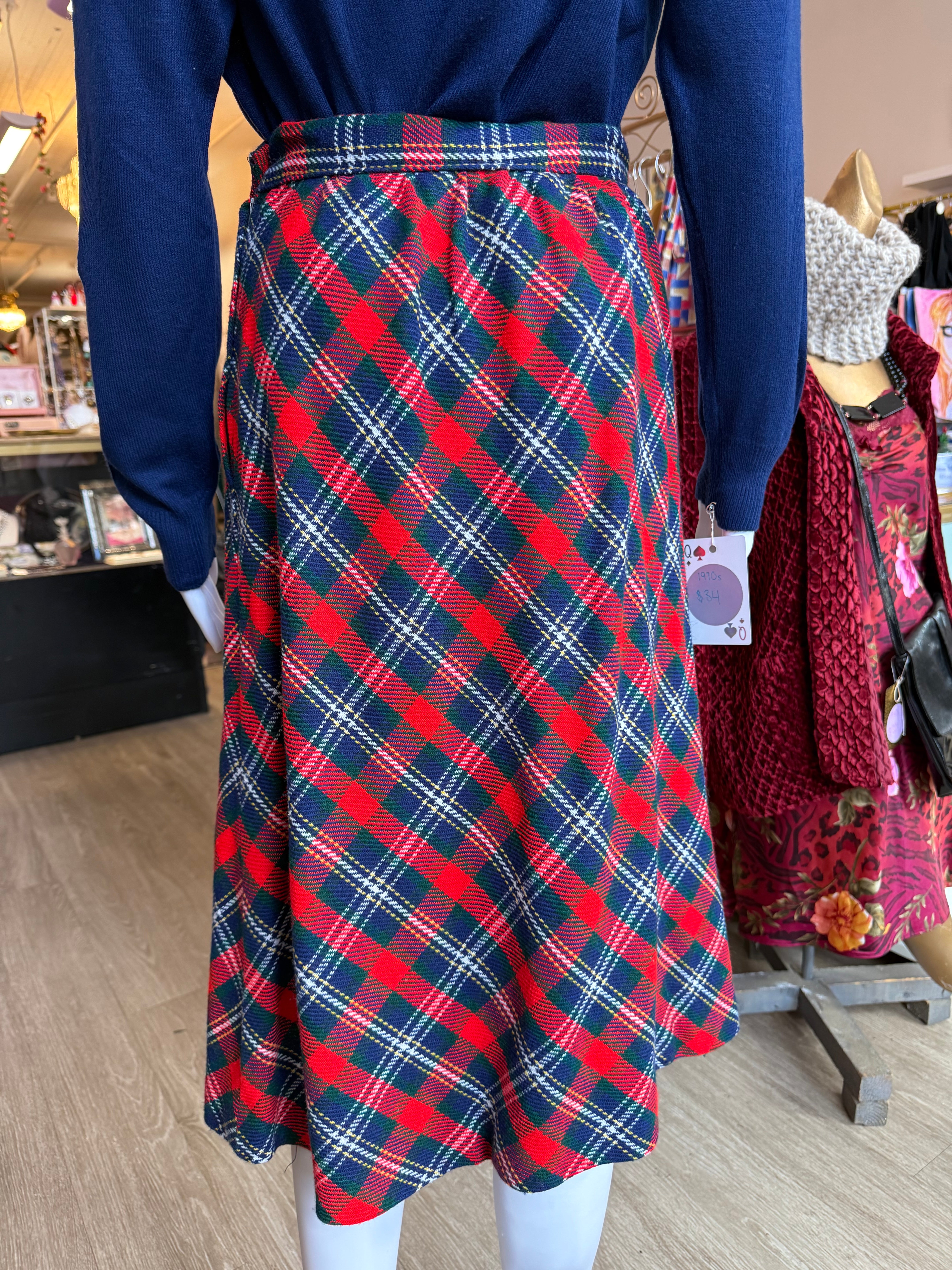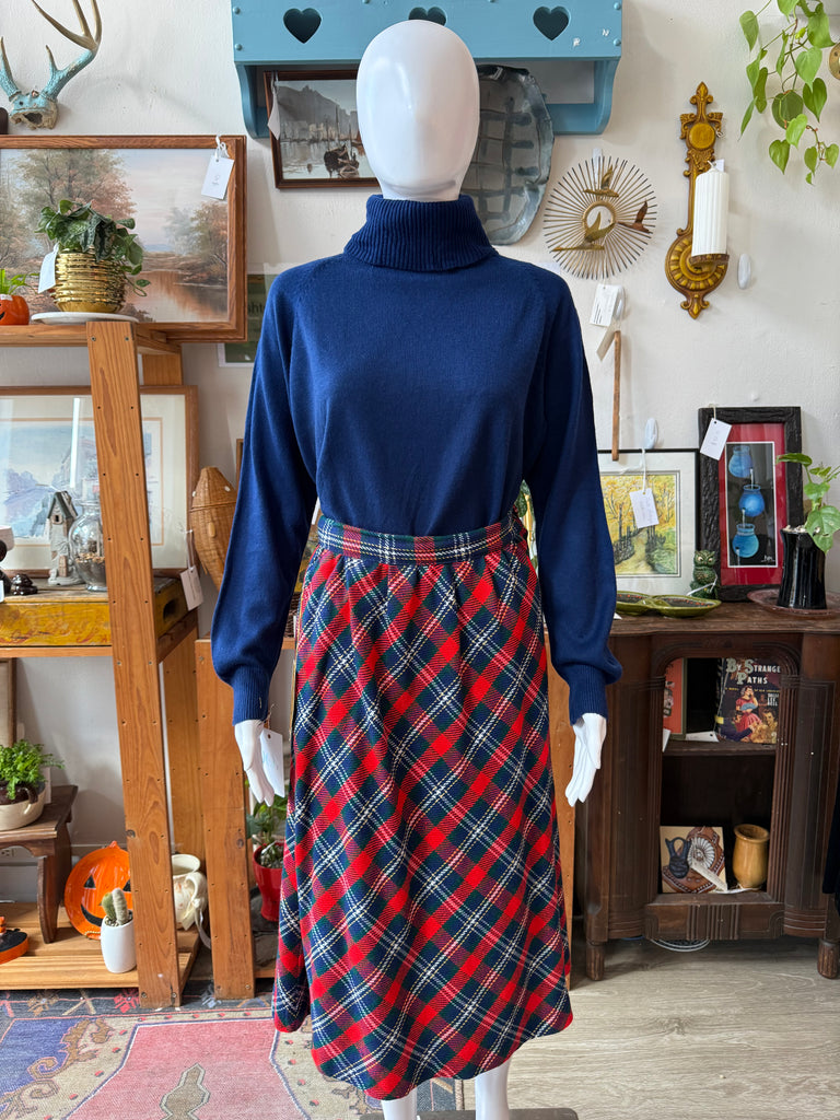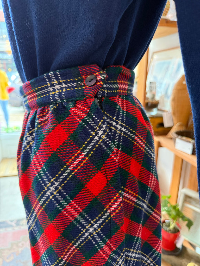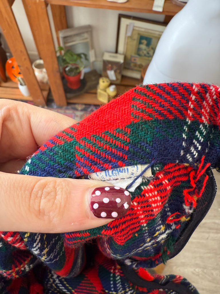 Classic 1970s wool skirt with an ILGWU union tag. Done in a red, navy, and green tartan plaid, it has a clean A-line silhouette and a side button/zip closure at the waistband. Best fits a modern size small and pairs perfectly with chunky knits and boots.