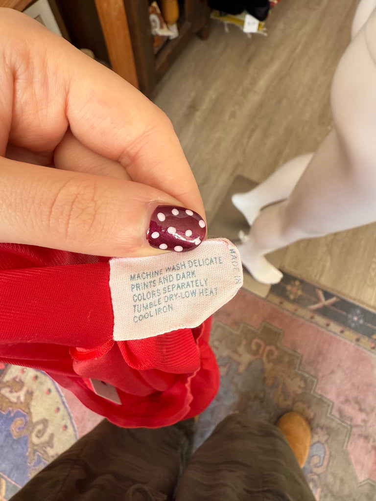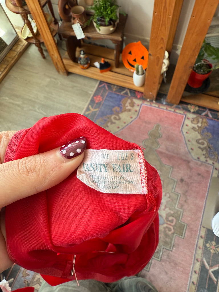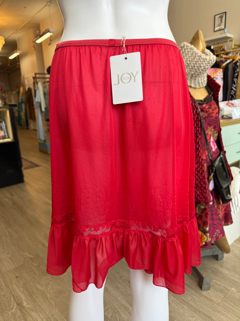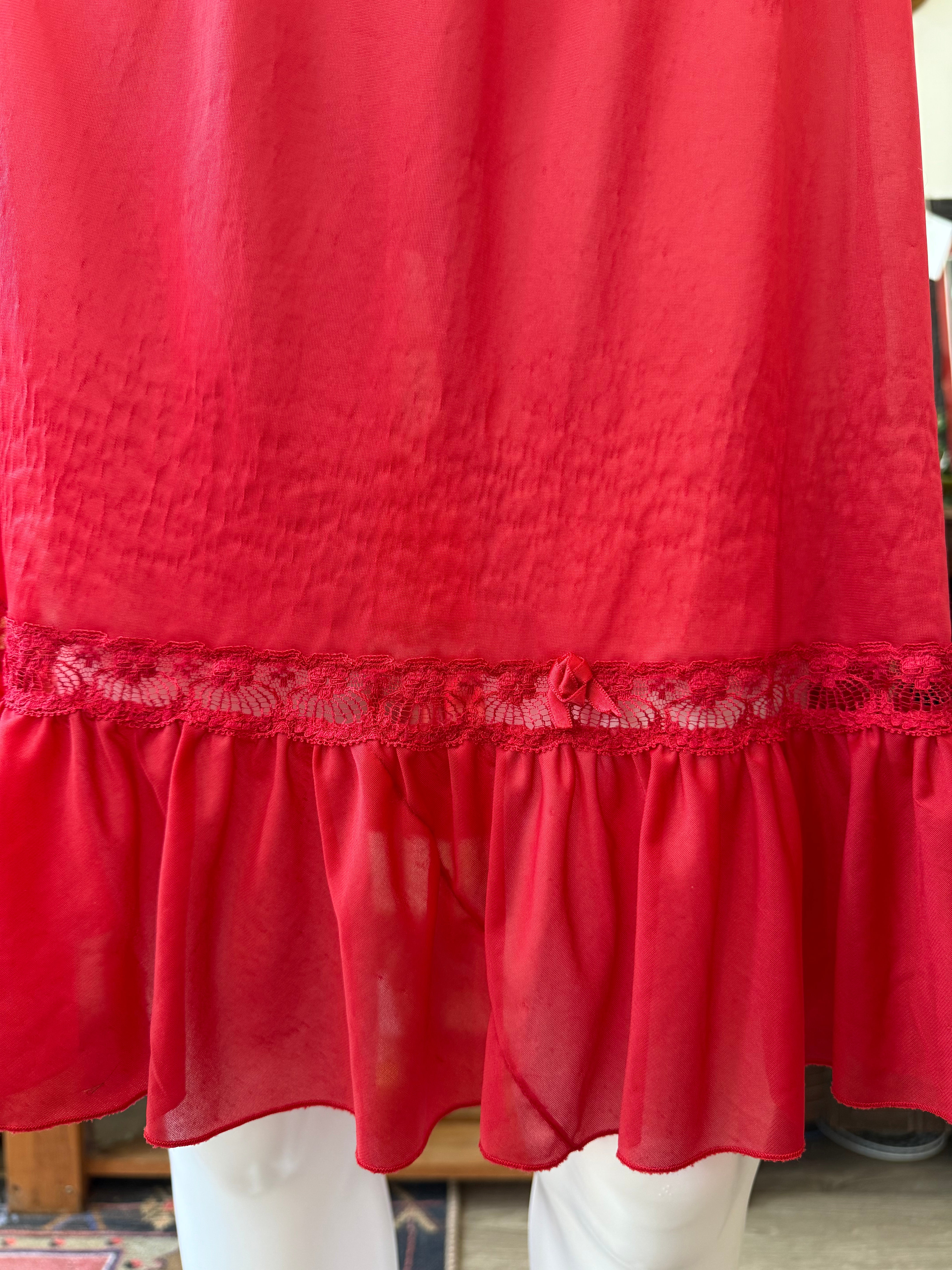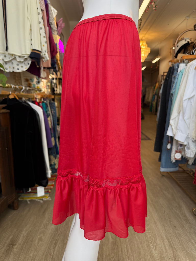 Beautiful vintage Vanity Fair slip skirt from the late 1960s to early 1970s in a striking cherry red hue. Made from silky soft nylon with a ruffled hem trimmed in floral lace and a small bow accent. Elastic waist with gentle stretch. Some light scuffing / pilling consistent with age and wear (shown in photos).