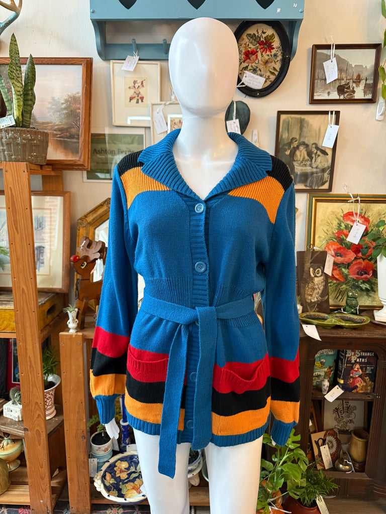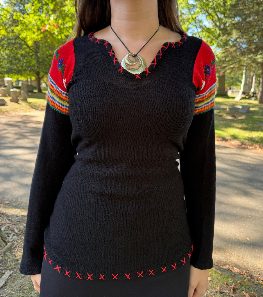 70s Black Knit Bell Sleeve Sweater - Rainbow and Floral Accents