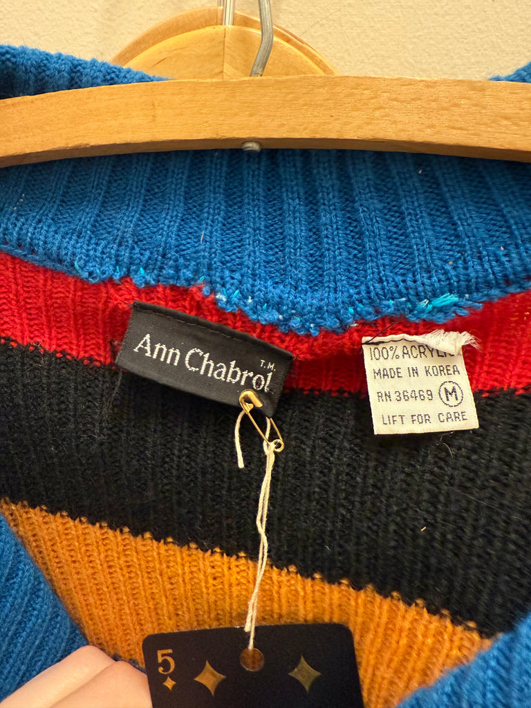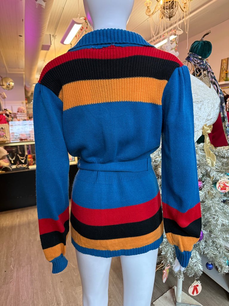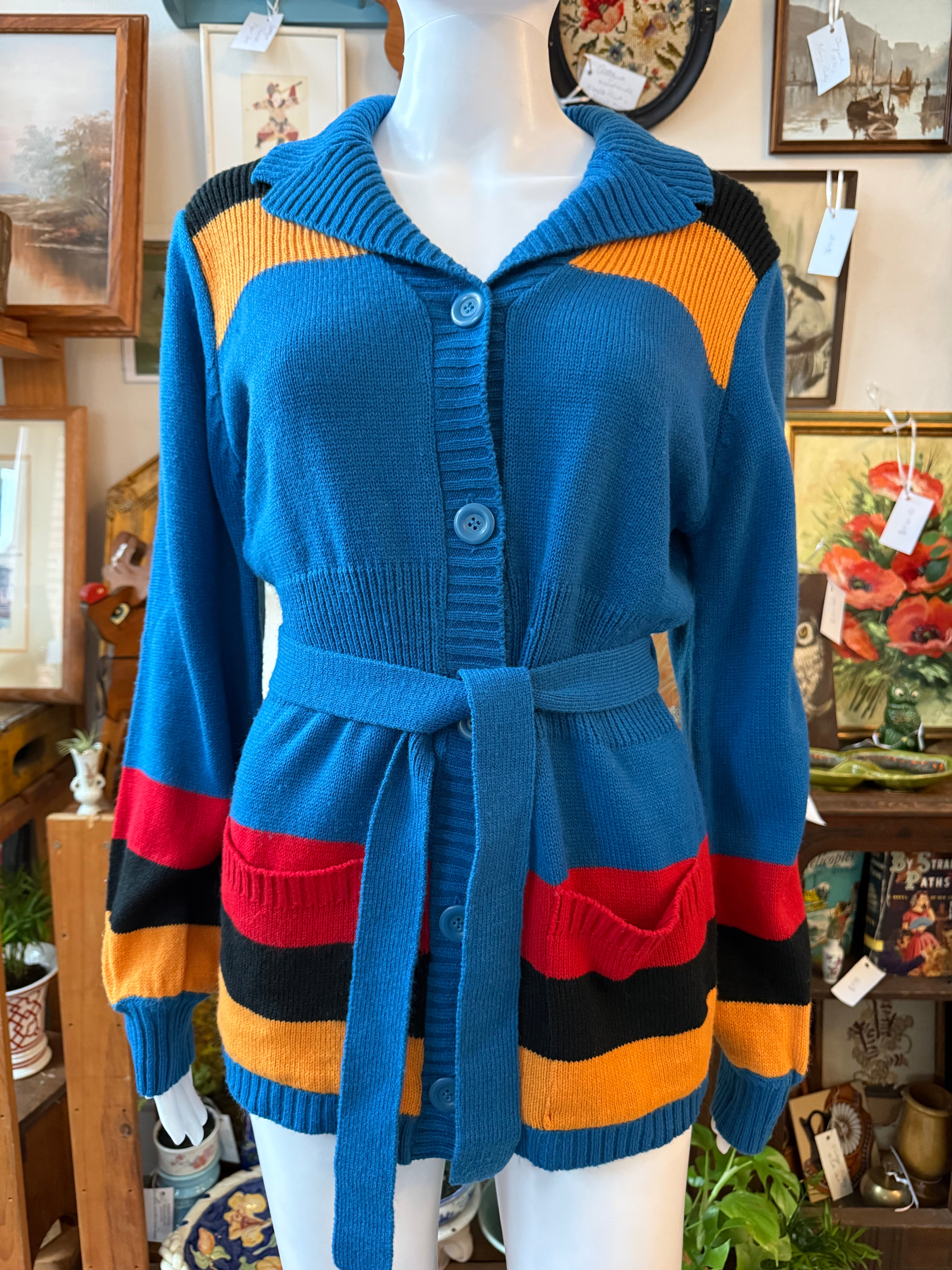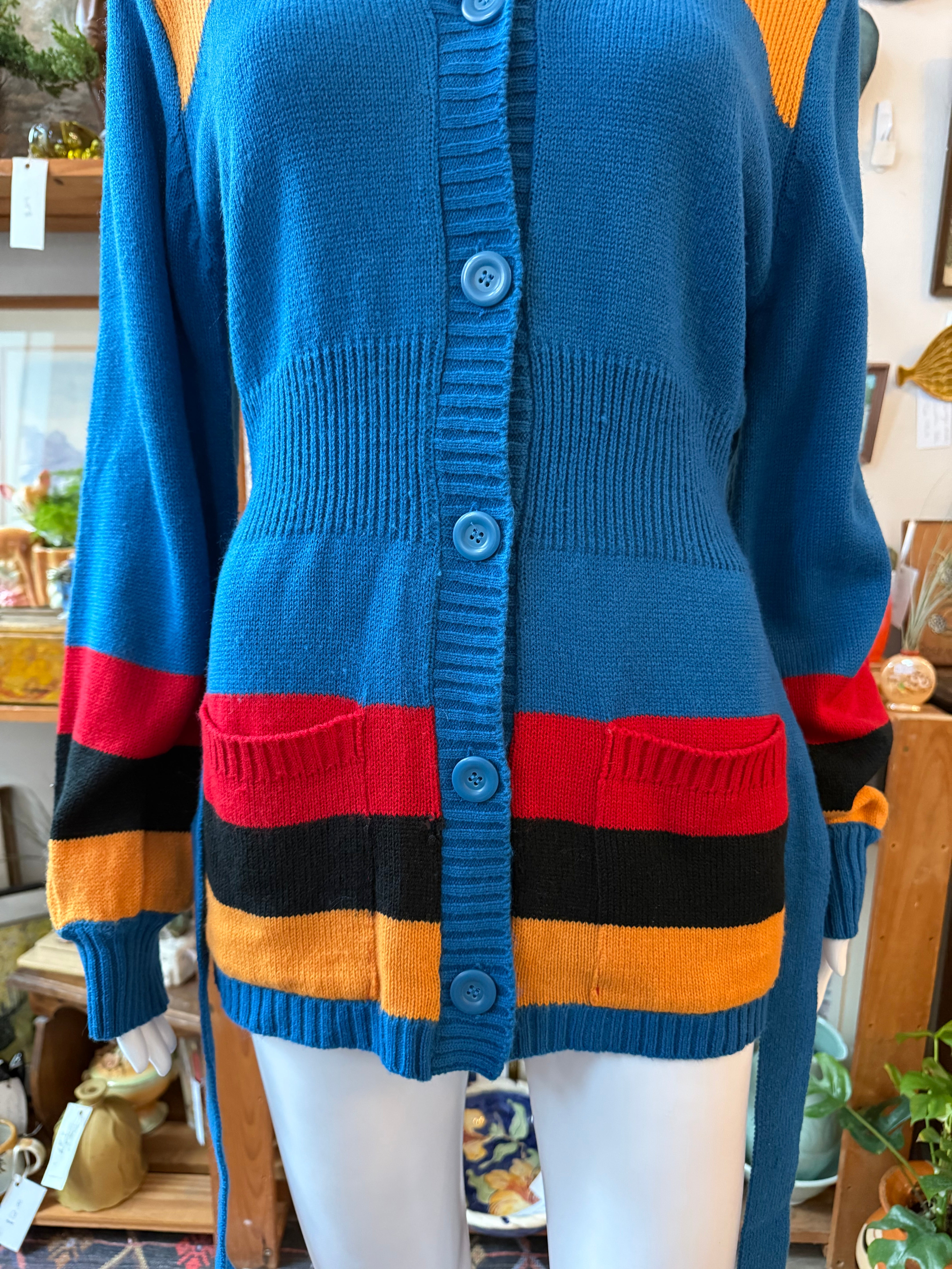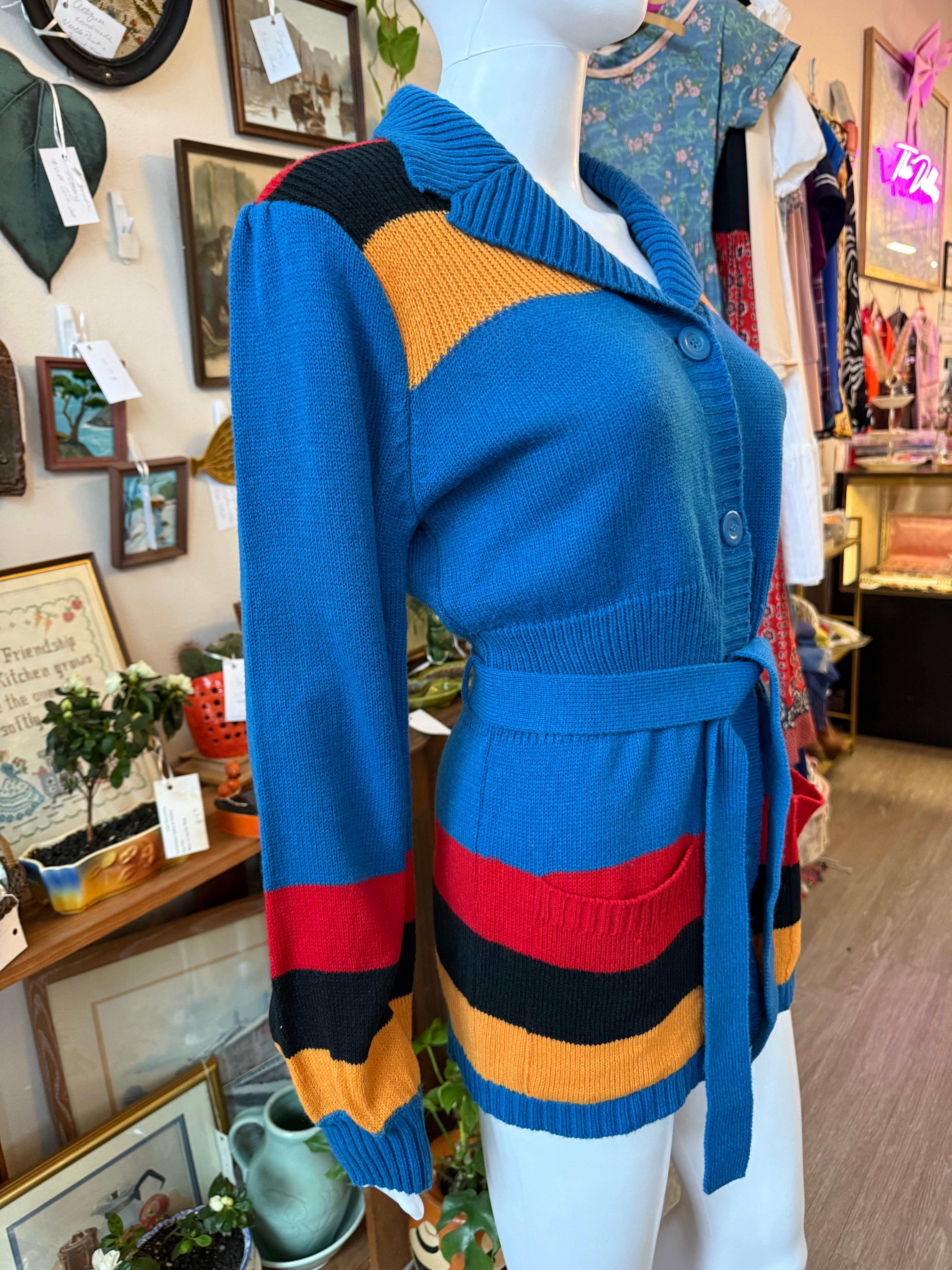Vibrant 1960s knit cardigan by Ann Chabrol, featuring bold colorblock stripes in cobalt blue, mustard, black, and deep red. Designed with a classic button front, cozy shawl collar, and matching tie belt to cinch the waist. Made from soft 100% acrylic with ribbed cuffs and hem for structure.