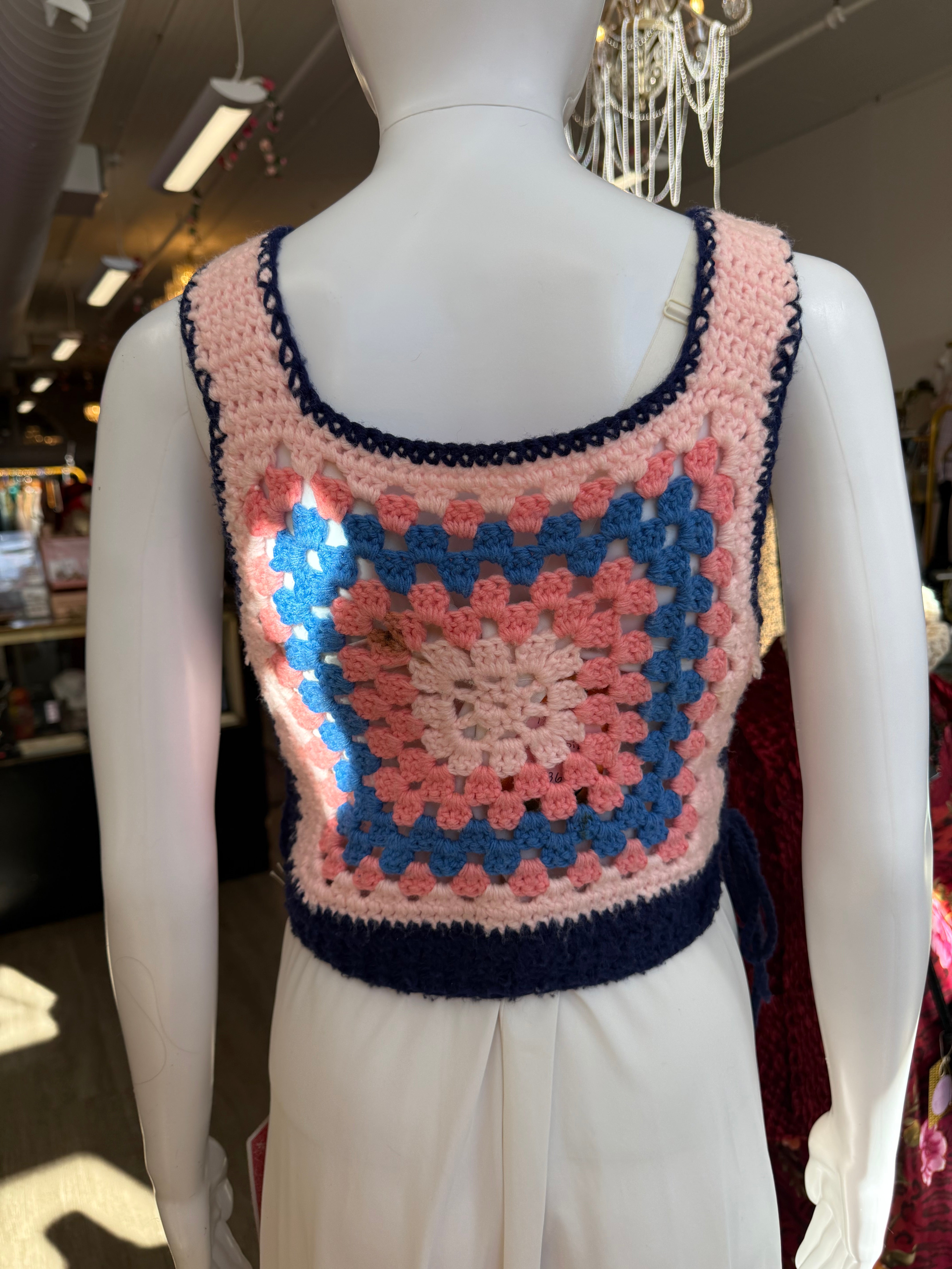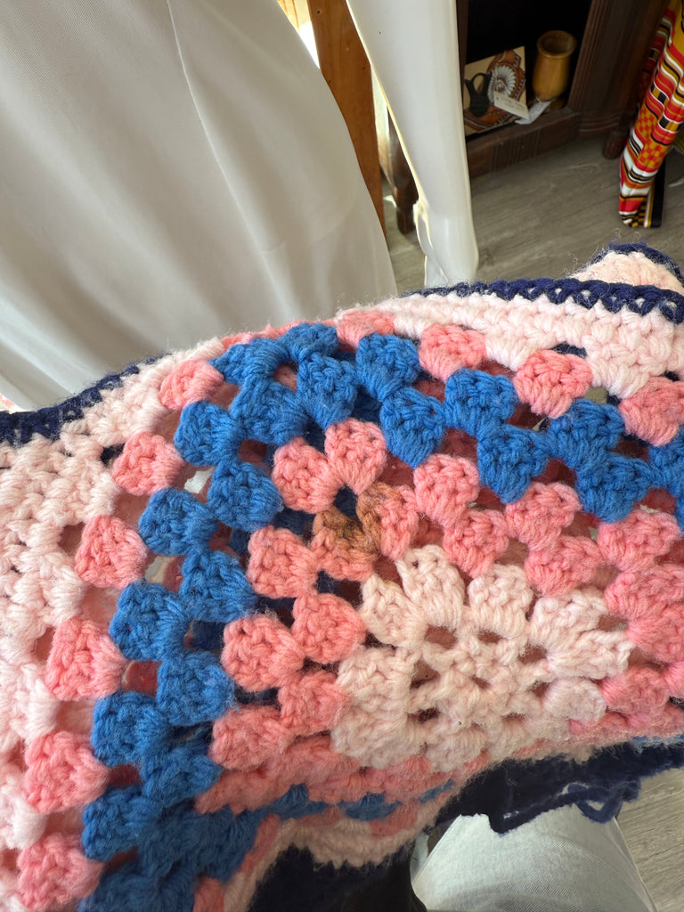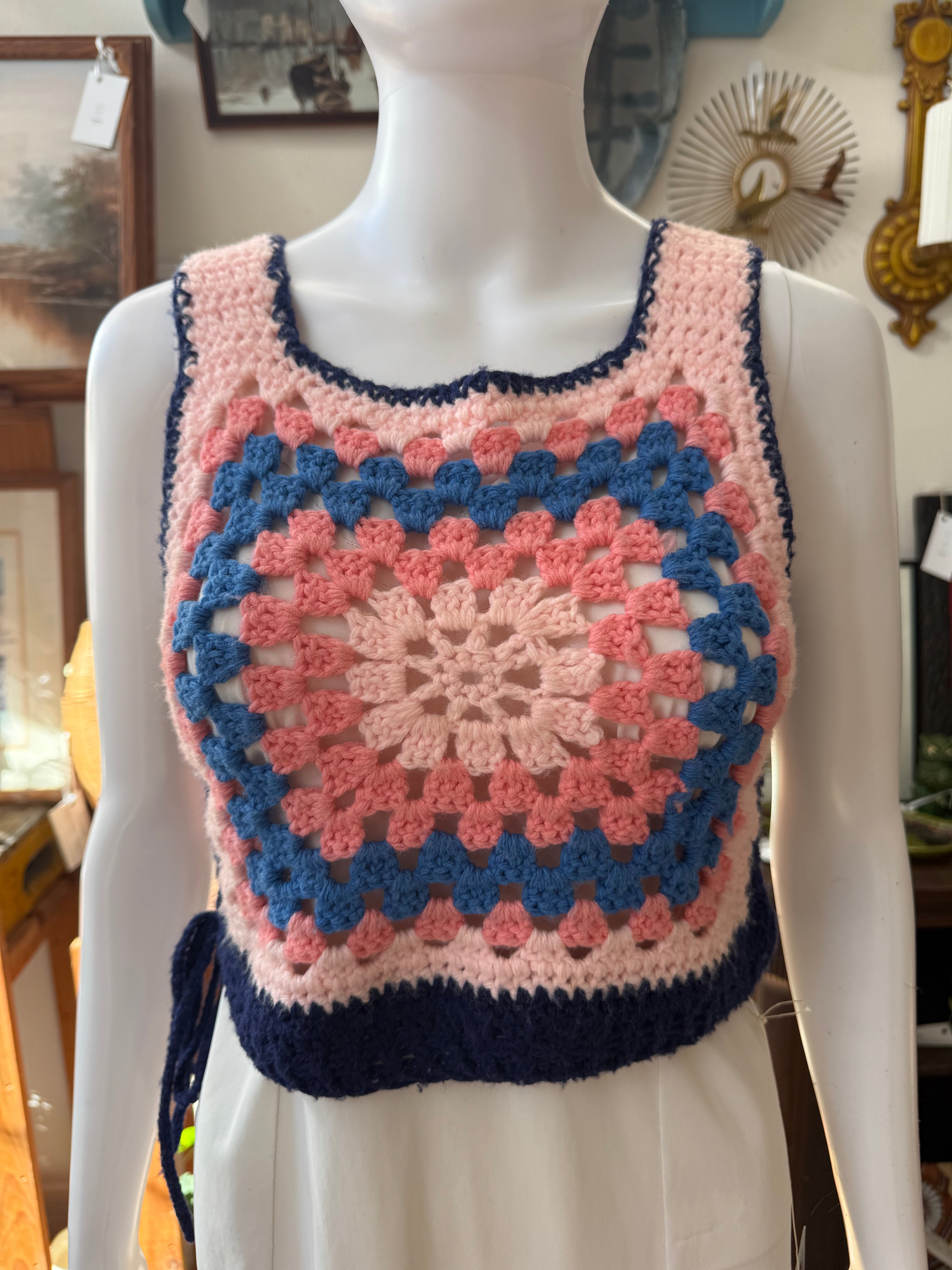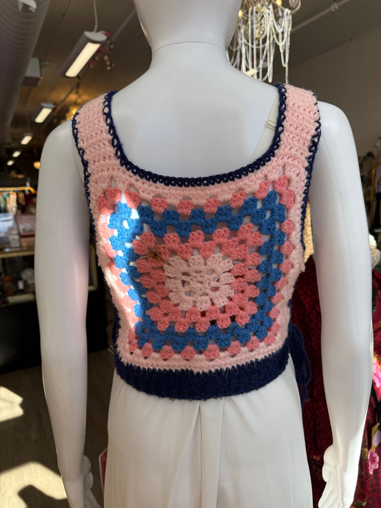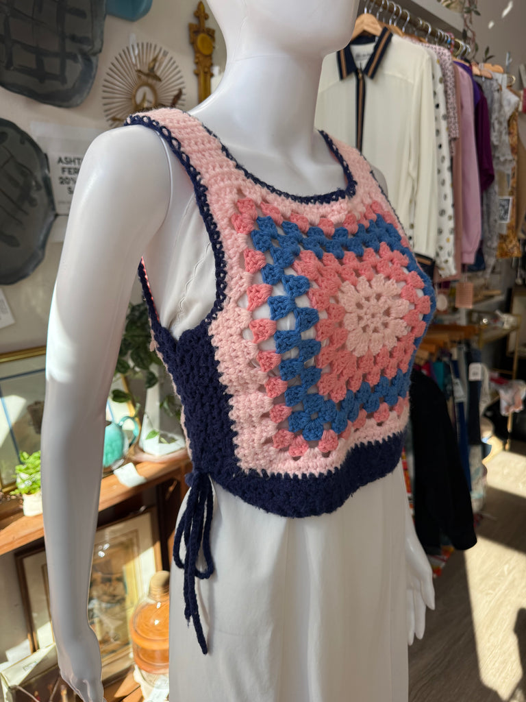 Vintage handmade crochet crop top in pastel pink, blue, and navy with a classic granny-square motif. Features side tie closures and soft yarn construction. Small stain/discoloration on the back (pictured). Best fits size S/M.