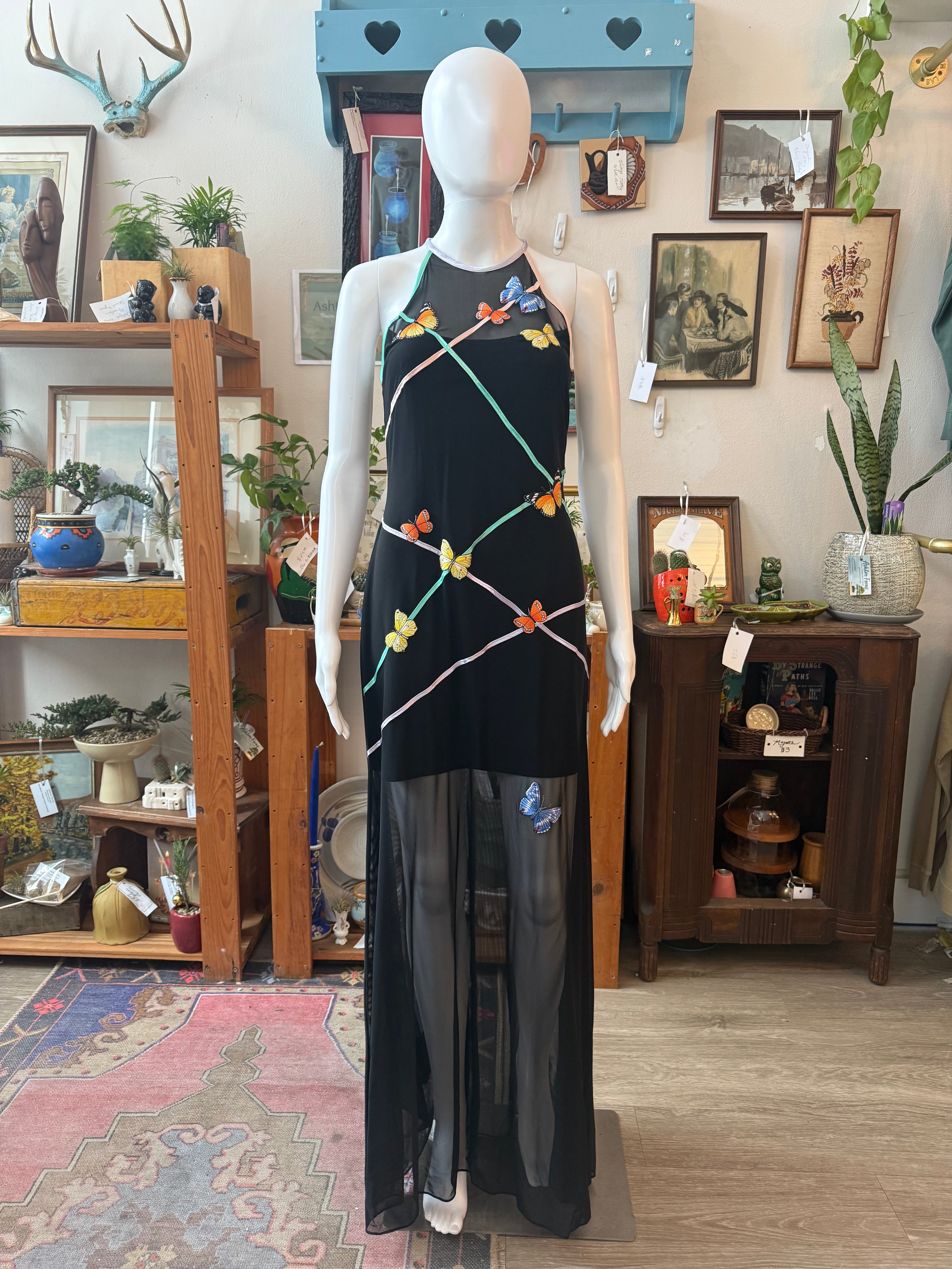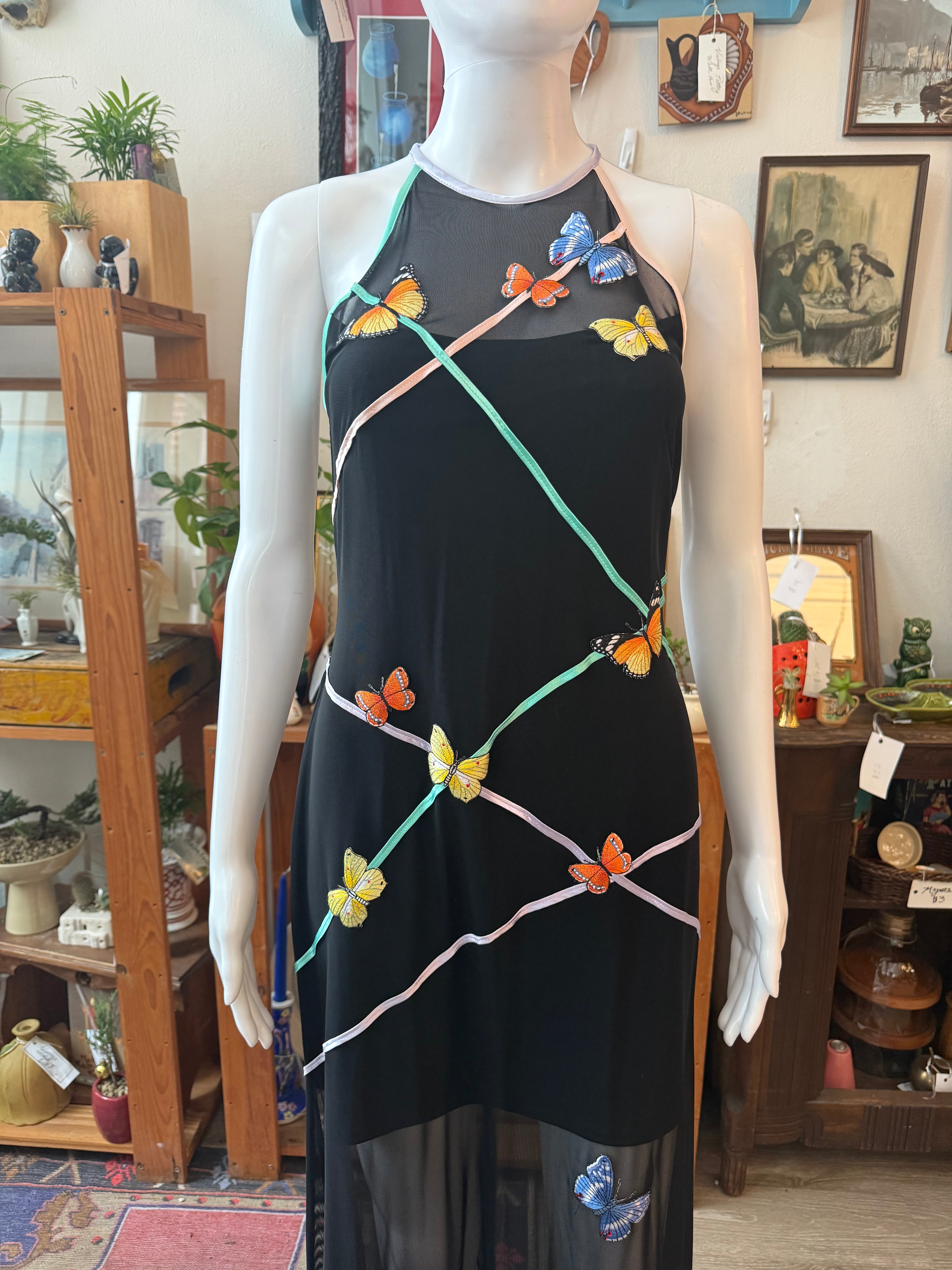 1990s Caché Butterfly Mesh Halter Formal Dress