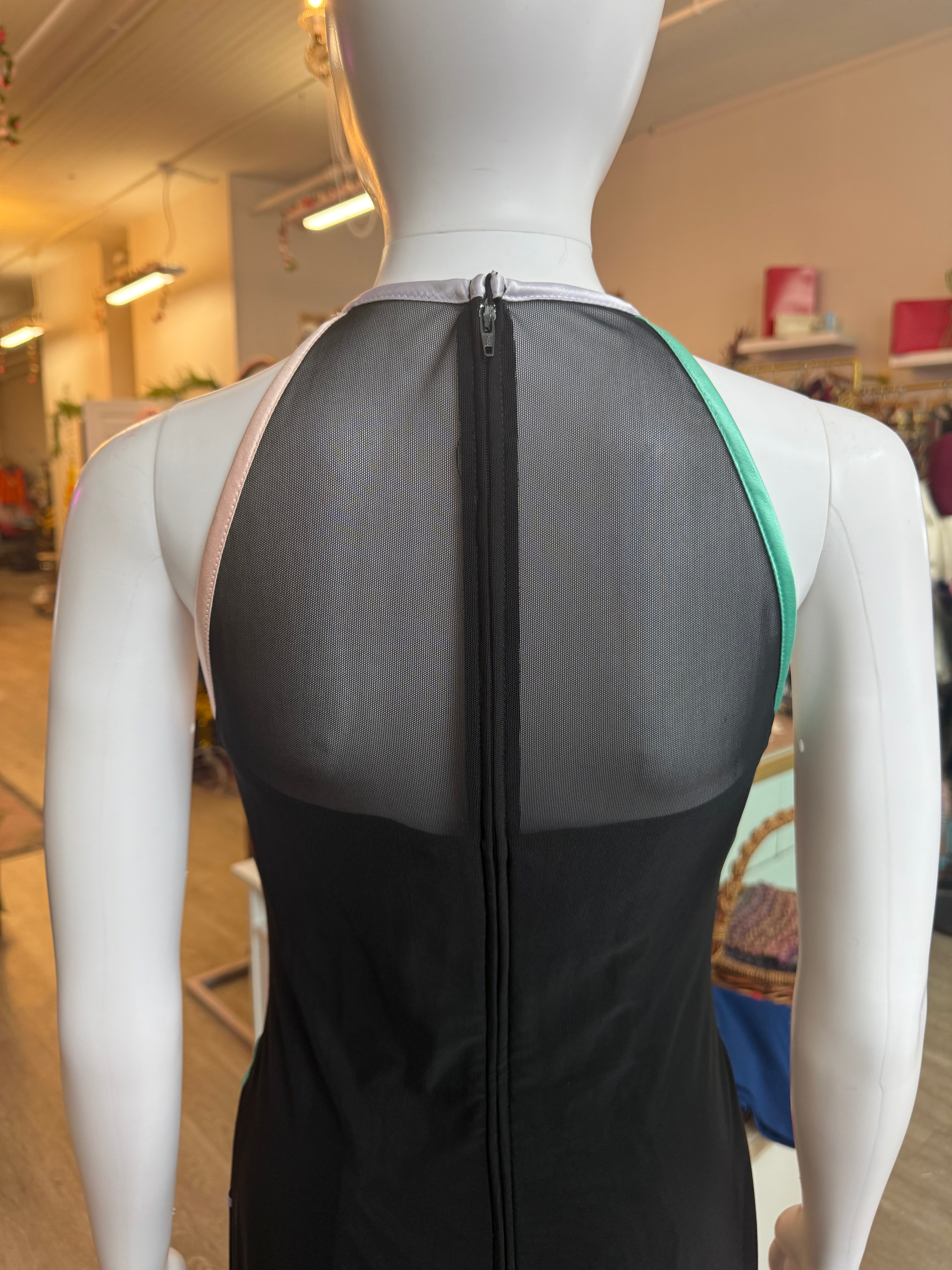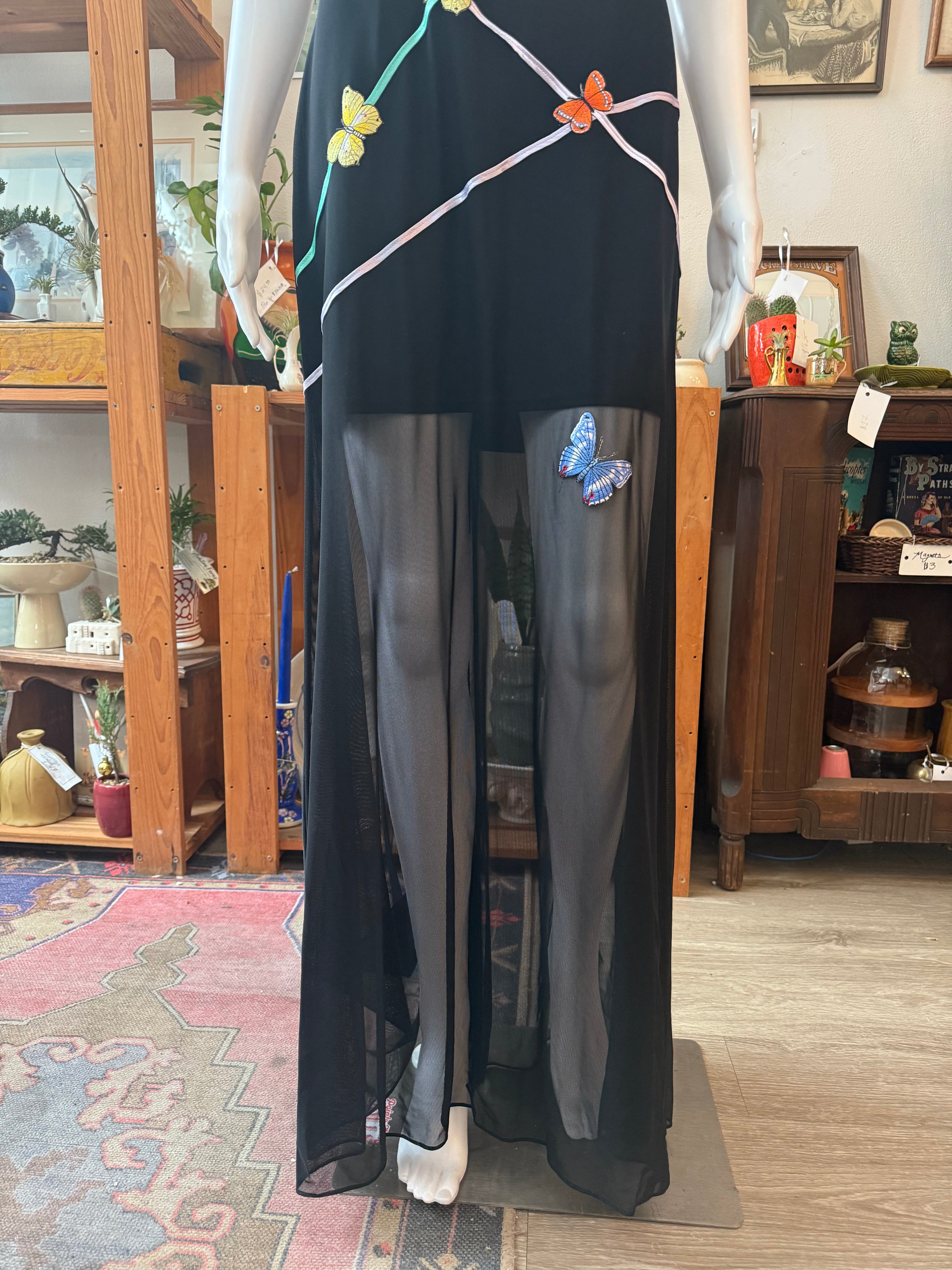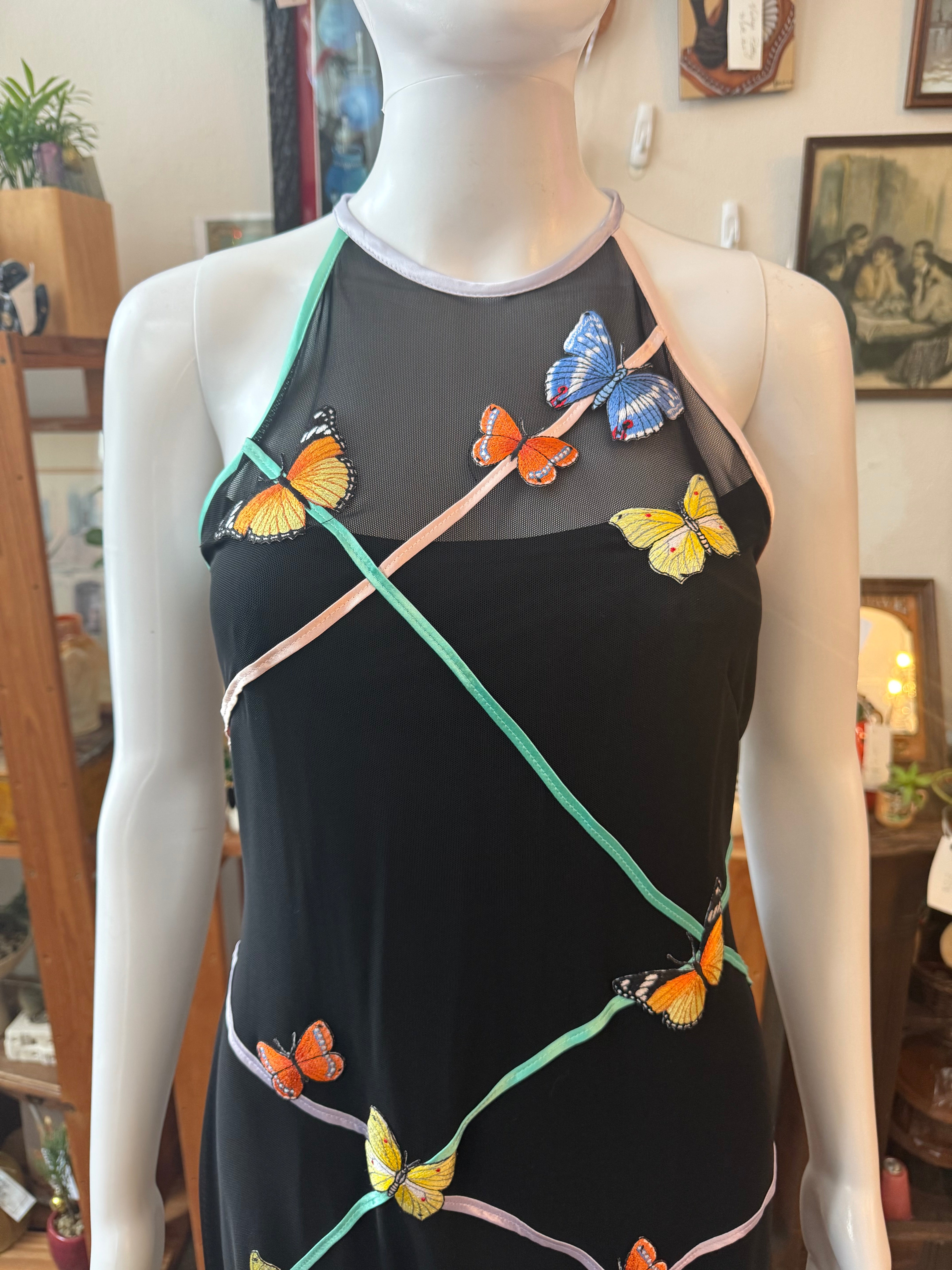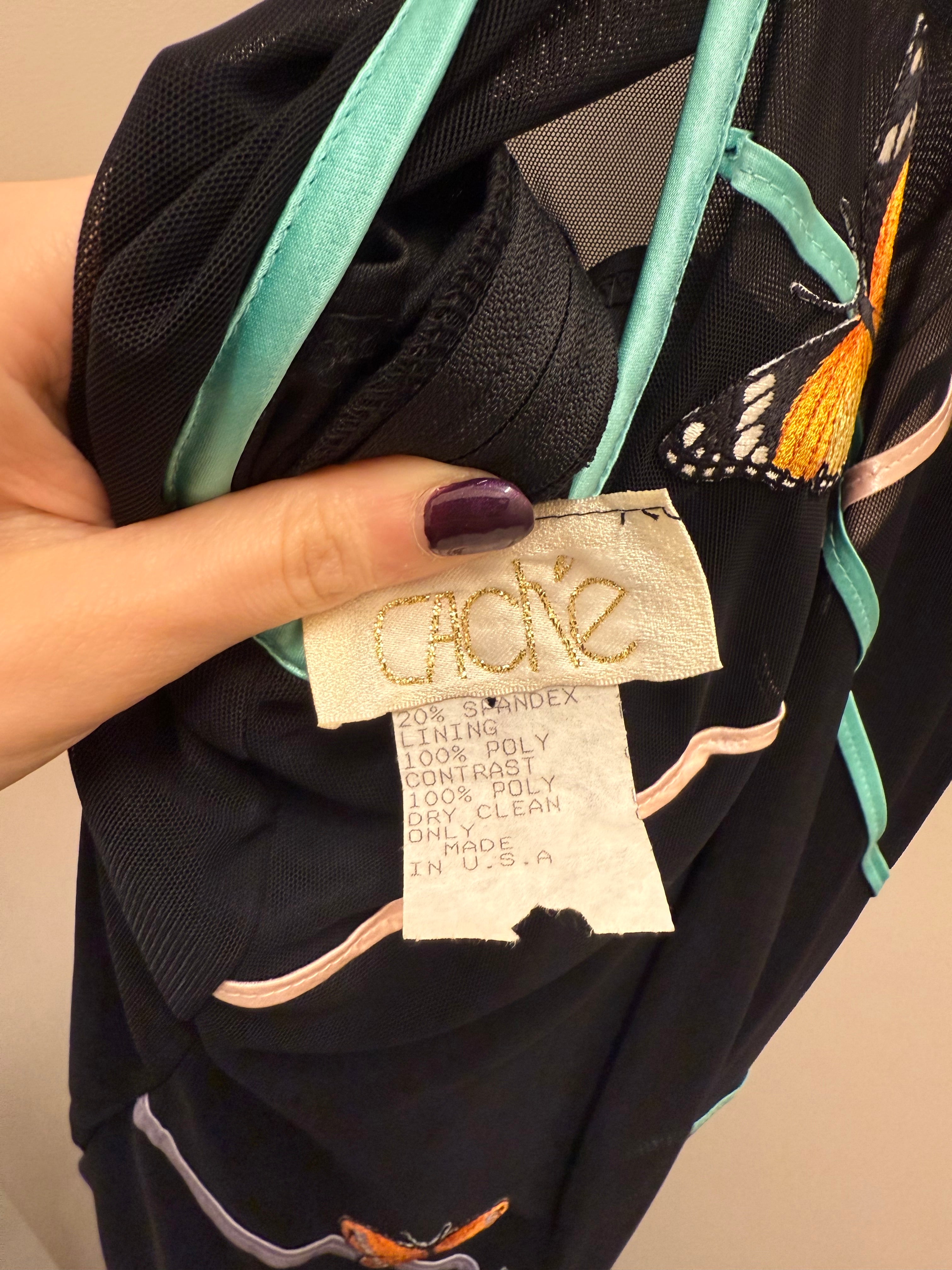 Stunning authentic 1990s formal dress by Caché in a sleek black stretch mesh with colorful embroidered butterfly detailing throughout. Halter-style neckline with a sheer upper bodice and a softly sheer skirt panel for that classic late-90s eveningwear look. Made from a stretchy spandex blend that hugs while still allowing movement. Fully lined through the body with a back zipper closure. In amazing vintage condition with only a few minor loose threads noted. Labeled size medium. A true statement piece and perfect for prom, formal events, or any dramatic night-out moment.