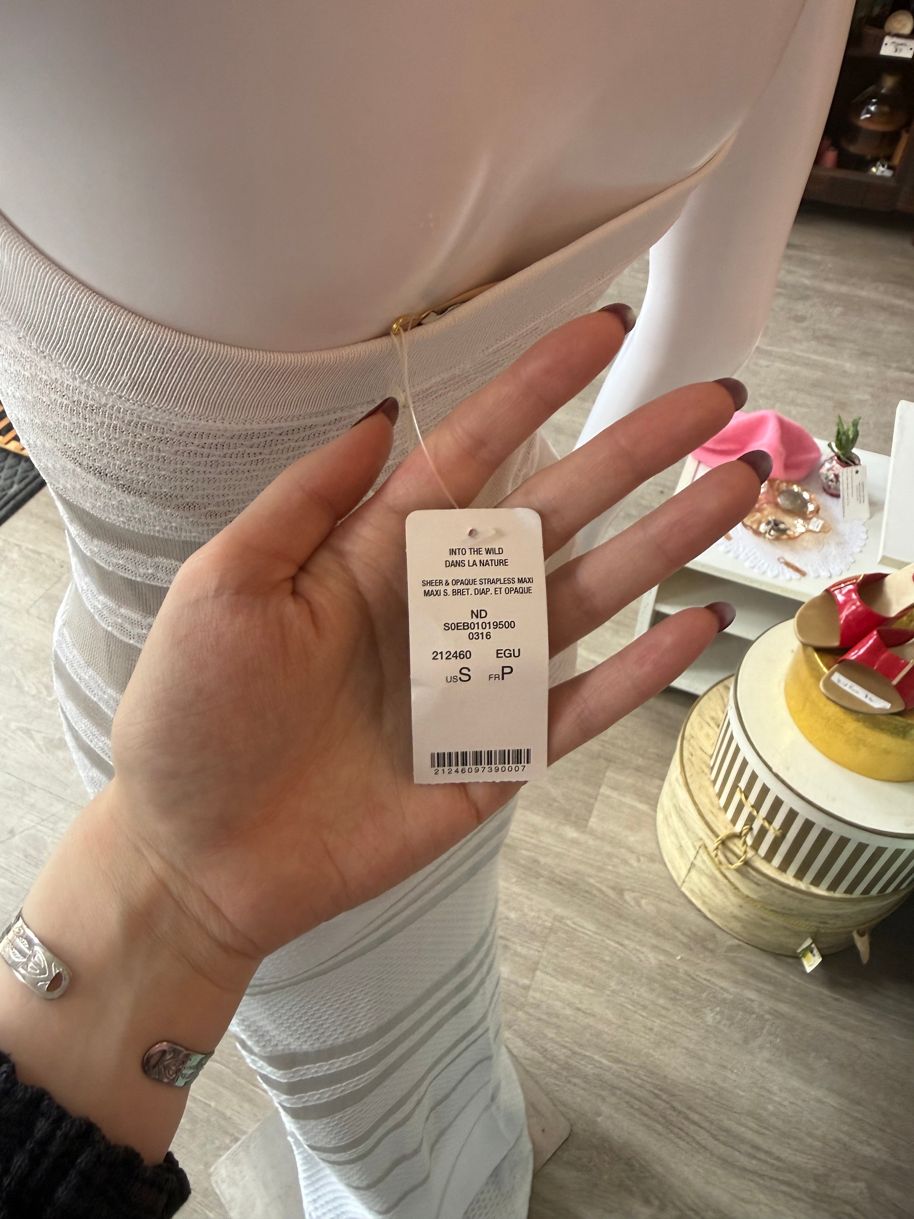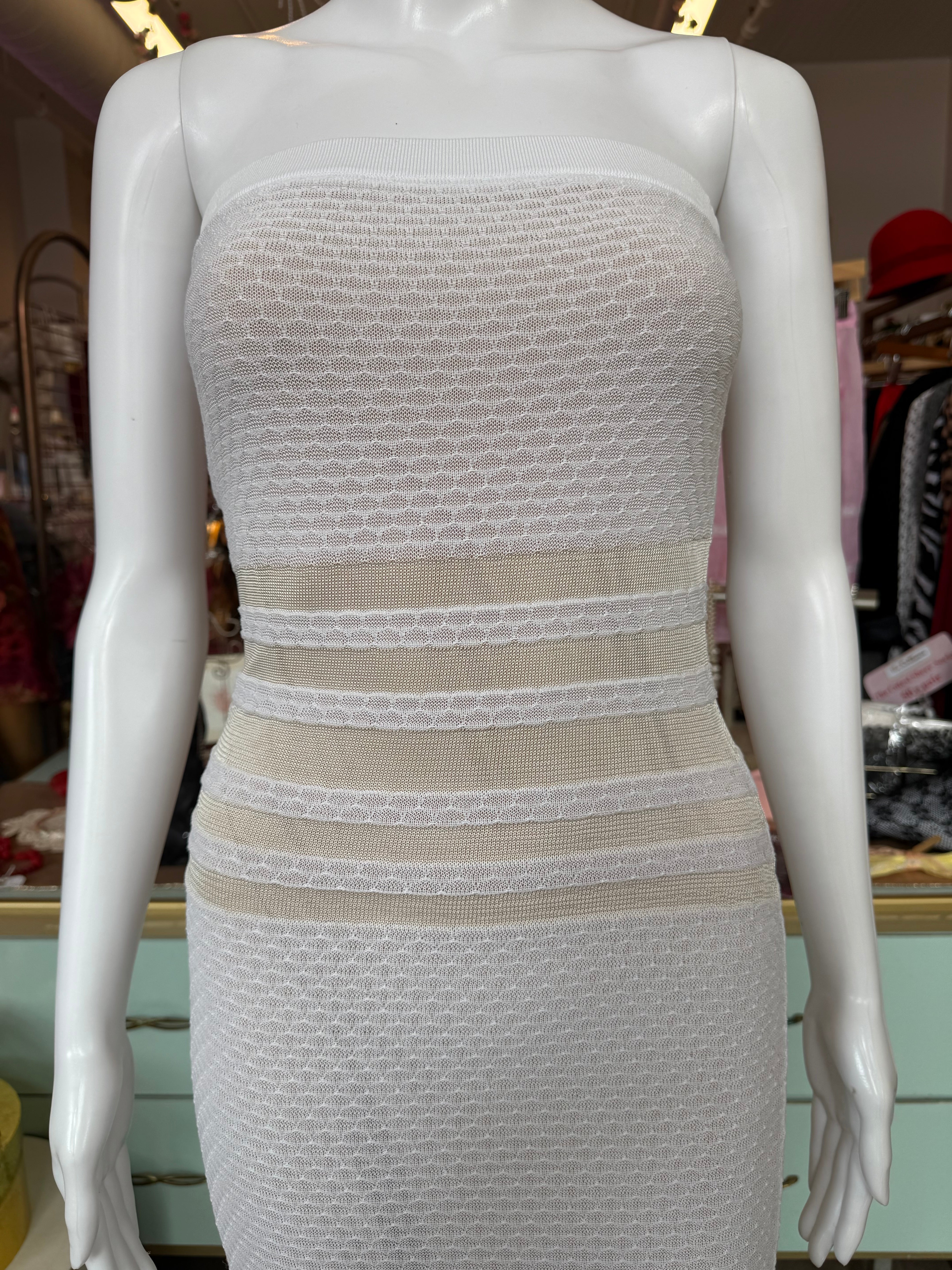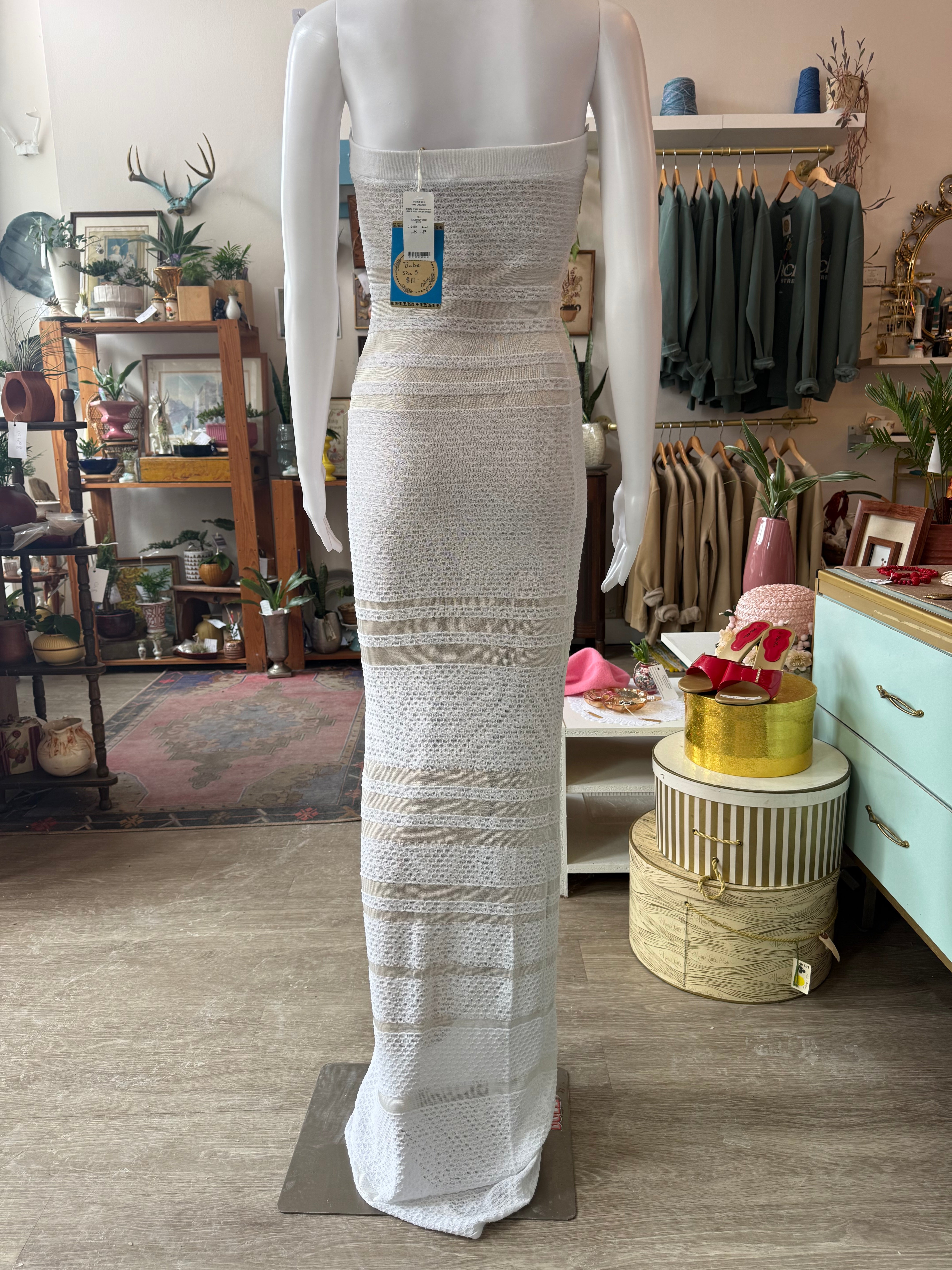 Deadstock early 2000s / 2010s Bebe strapless maxi dress in an ivory-toned sheer knit with horizontal textured striping. Designed with a fitted strapless bodice and ultra-stretch silhouette that hugs through the waist and hips before falling into a full-length maxi hem. Features a sheer outer layer with built-in mesh underlay for coverage and structure.