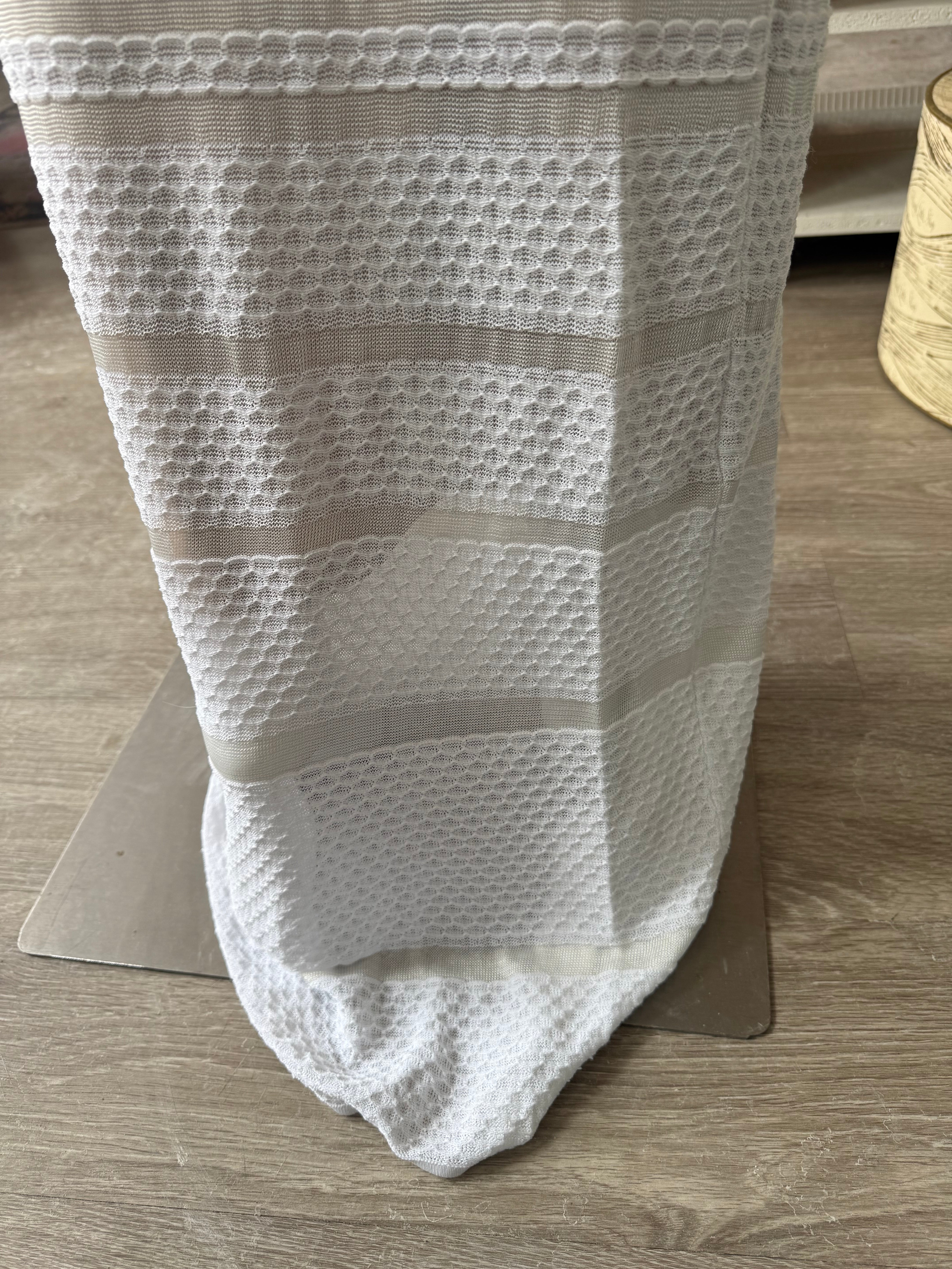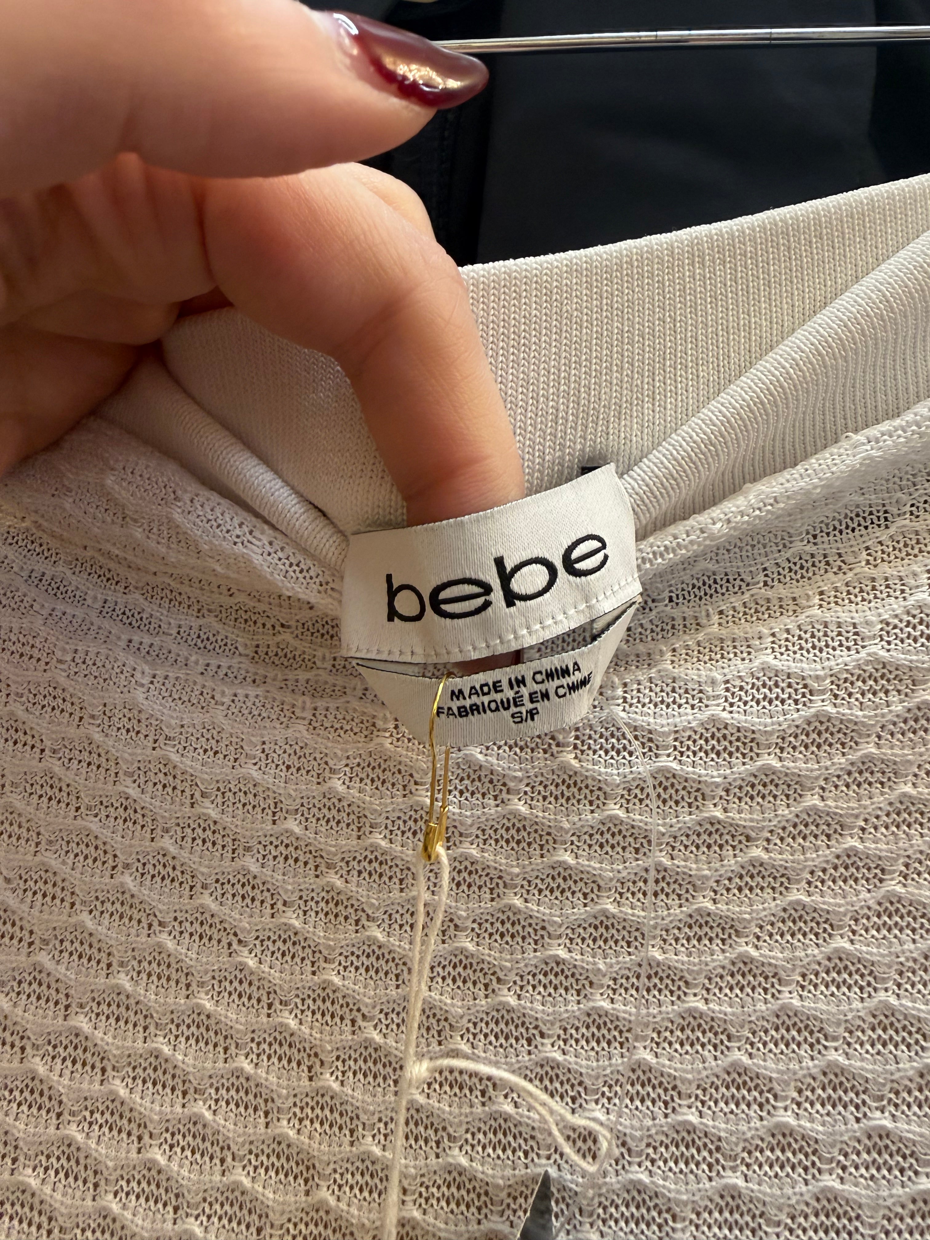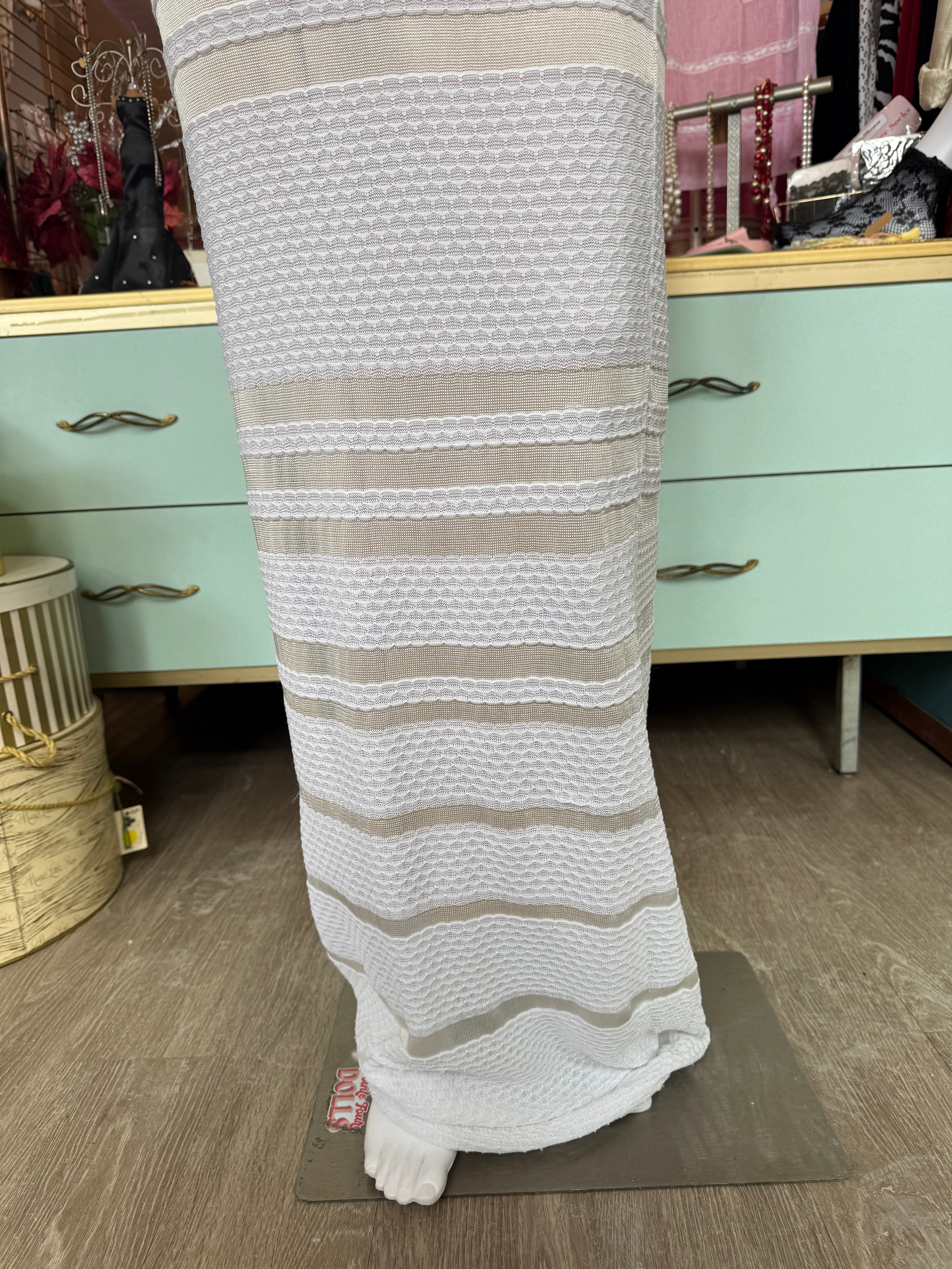 Deadstock early 2000s / 2010s Bebe strapless maxi dress in an ivory-toned sheer knit with horizontal textured striping. Designed with a fitted strapless bodice and ultra-stretch silhouette that hugs through the waist and hips before falling into a full-length maxi hem. Features a sheer outer layer with built-in mesh underlay for coverage and structure.