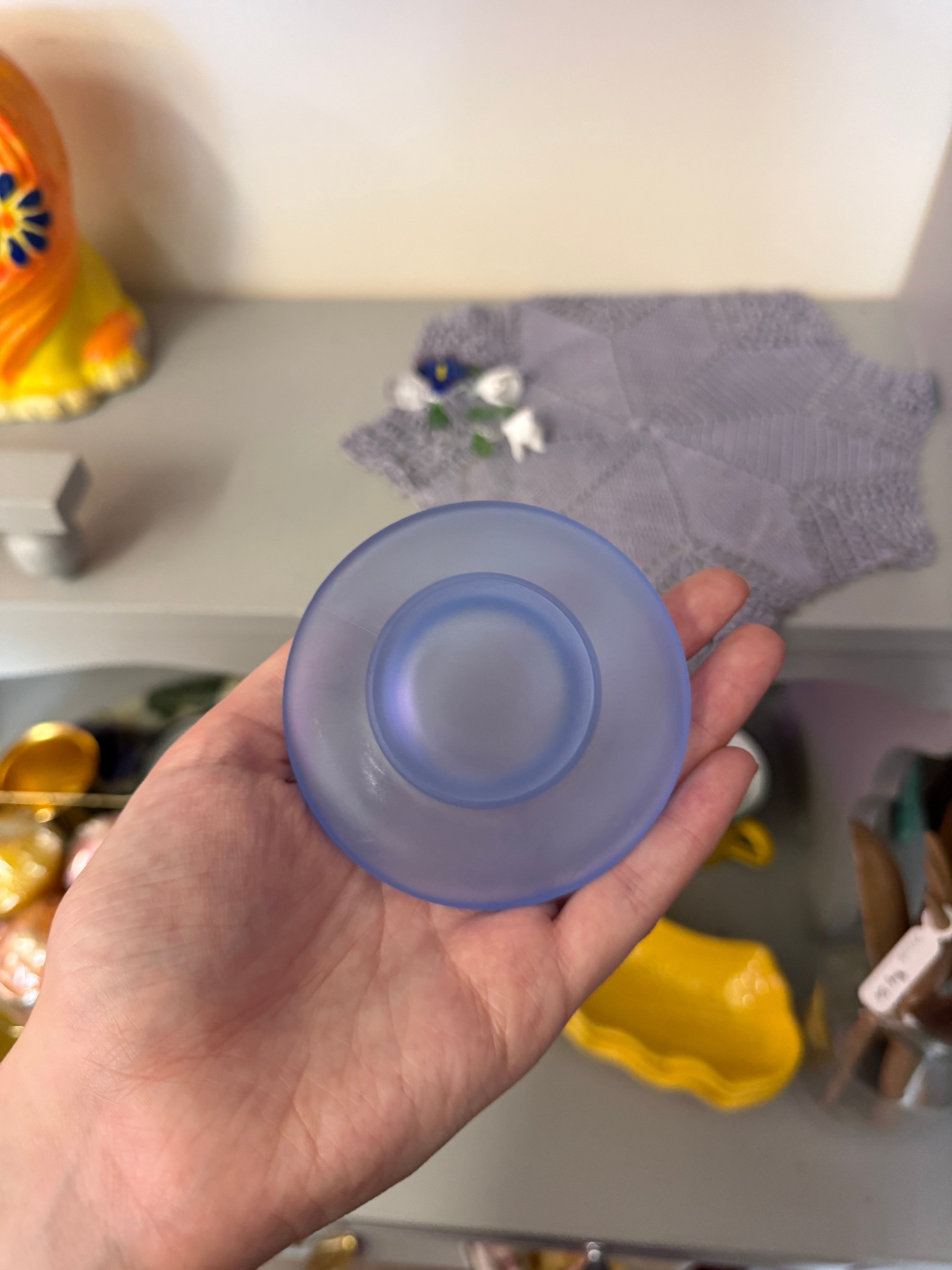 This vintage frosted crystal perfume bottle features intricate glass doves and a beautiful blue flower topper, adding a touch of elegance to any vanity or display. The delicate design and use of decorative glass make this piece a unique and charming collectible for those who appreciate fine craftsmanship and timeless beauty. Perfect for storing essential oils or as a decorative accent in a bathroom or dressing room. Clean and ready to use!