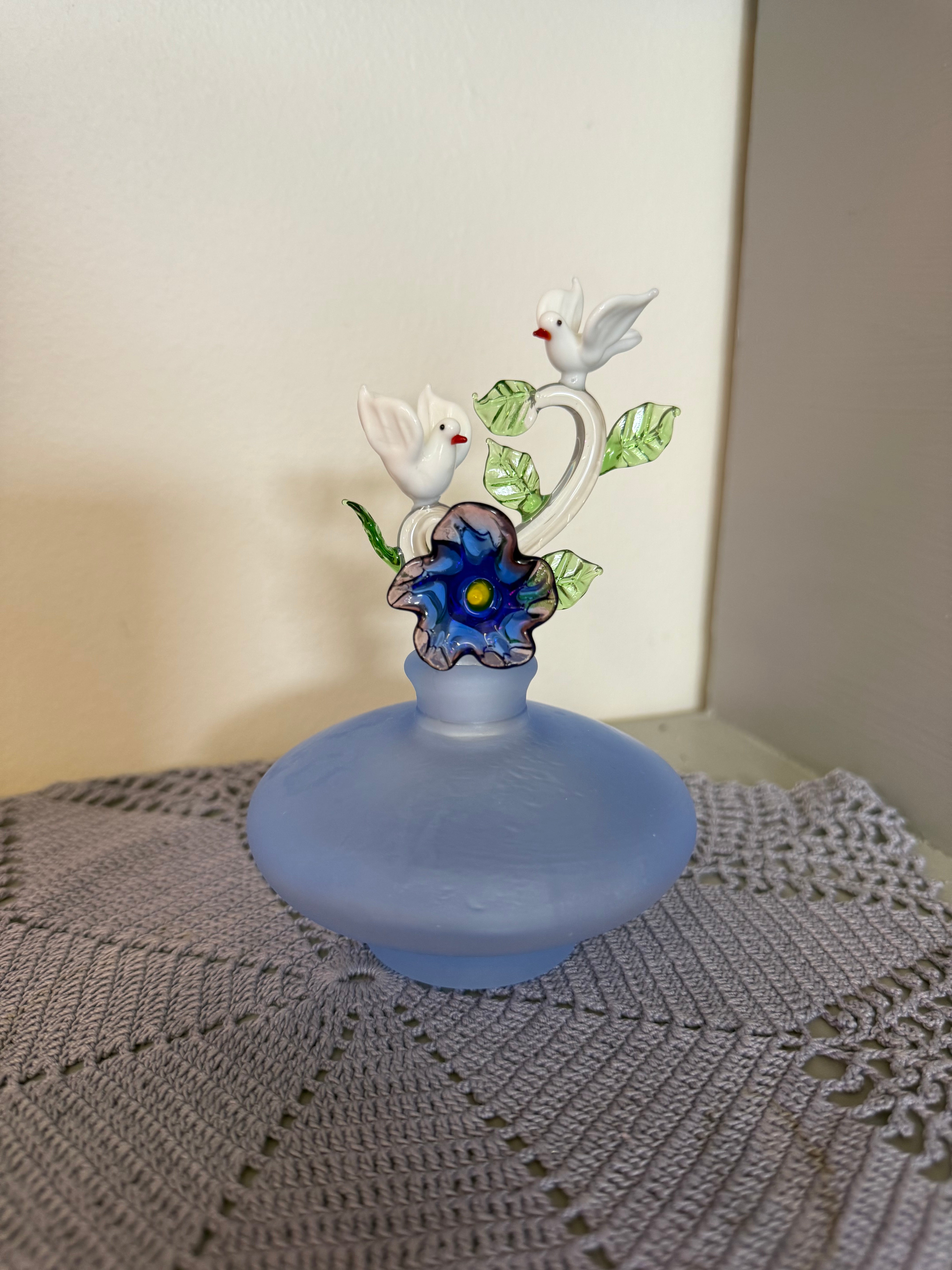Vintage Frosted Perfume Bottle - Glass Doves & Blue Flower Topper