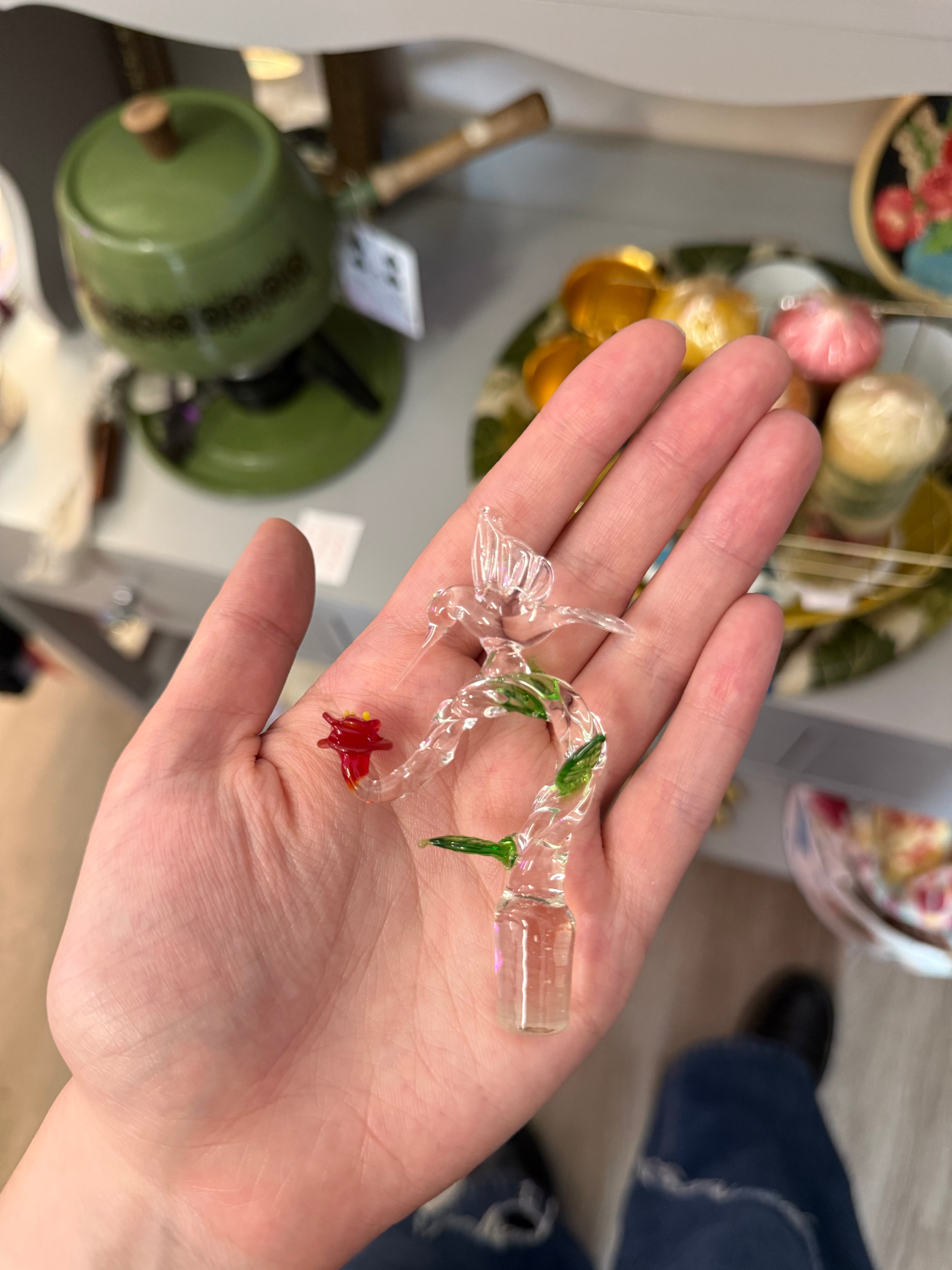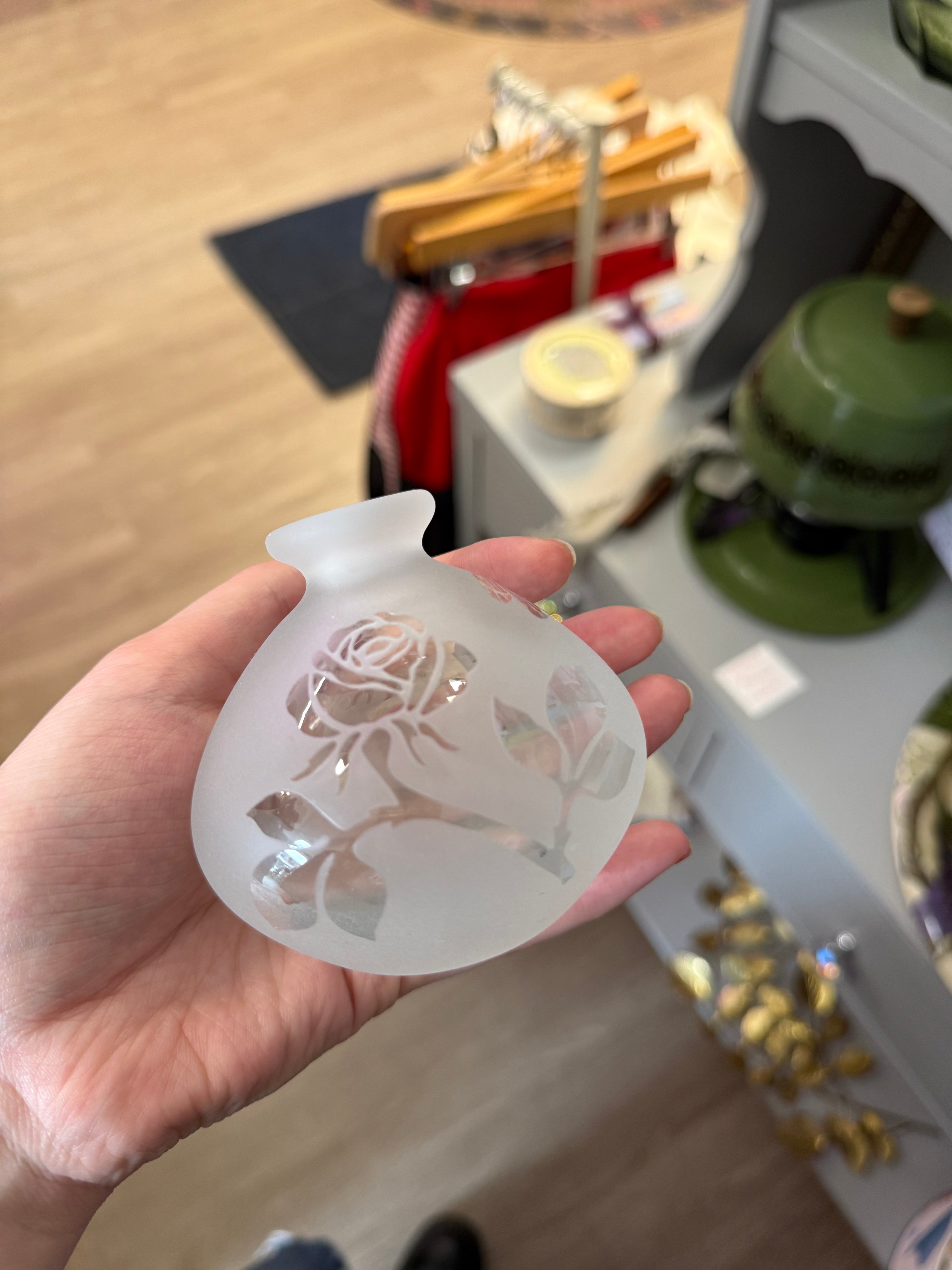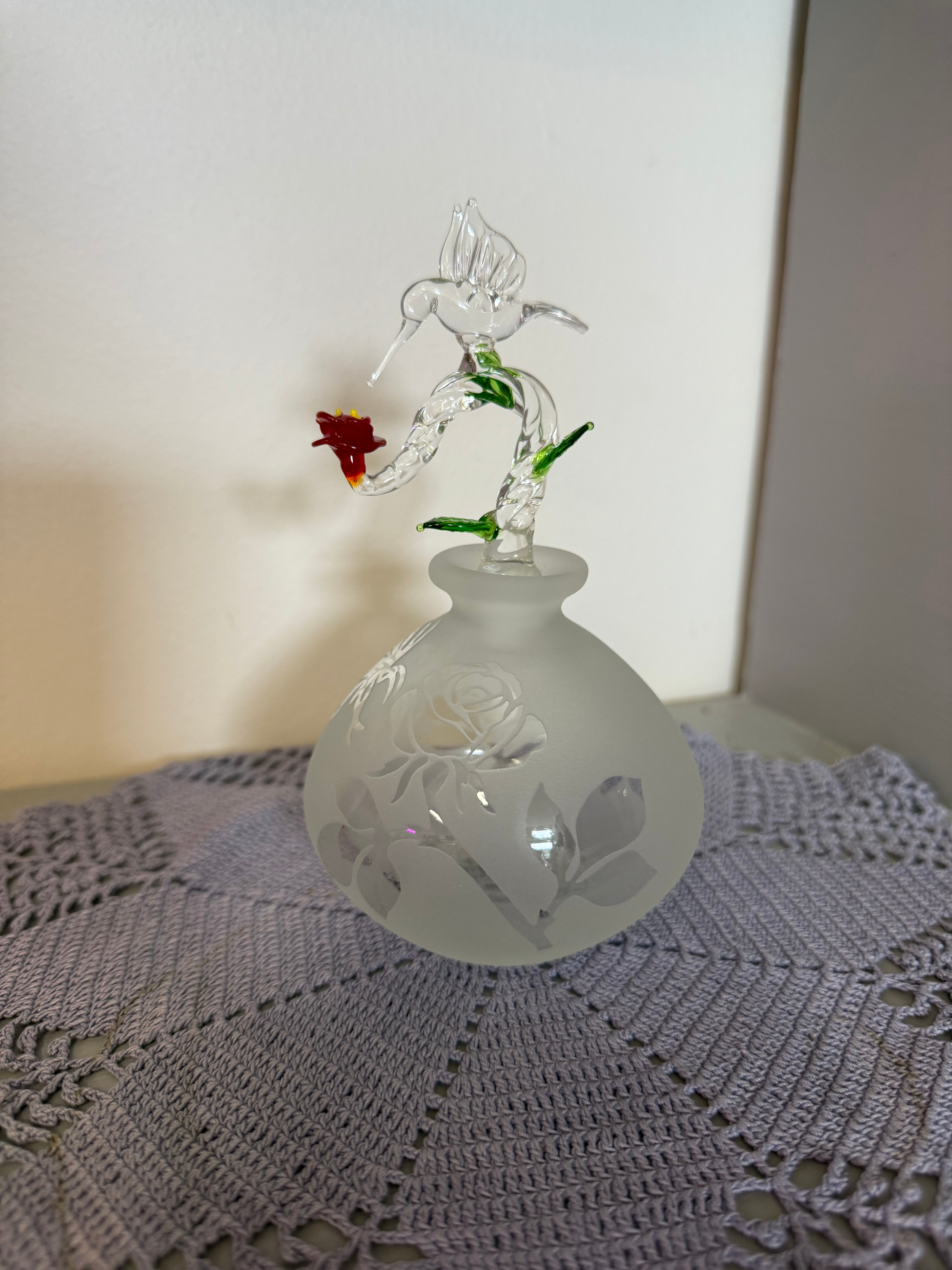 Vintage Perfume Bottle - Etched Rose & Hand-Blown Hummingbird Stopper